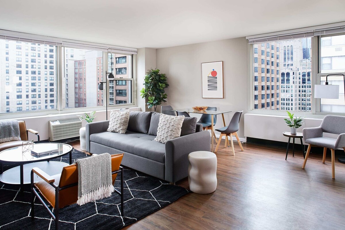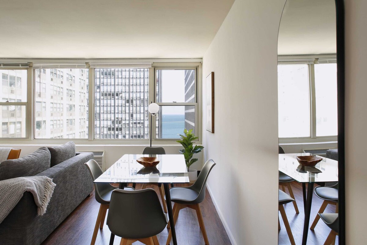 Summary: Stunning 1,500+ square foot corner apartment with oversize windows, an open layout, and dramatic city and lake views in multiple directions. This bright and modern three bedroom, two bathroom apartment is perfect for travelers looking for a stylish escape in the sky in downtown Chicago just off the Magnificent Mile and the lakefront. The building has great amenities including an amazing rooftop terrace with 360 degree views of the skyline and the lake. This is the best location in the city! Note: Some photos shown are of similar / nearly identical units that we operate in this same building. The Space: Located on a higher floor in a secure, high-end building in the center of Chicago! Once inside, you're greeted by a large light-filled space with expansive windows overlooking the lakefront, parks, and the surrounding neighborhood. Interior design is a passion of ours and the chic furnishings reflect that! There is fast internet, a smart TV with Roku, and comfortable modern furniture to lounge on. The kitchen and living room are open and very spacious. The kitchen is stocked with cookware and all the tools you need to cook a great meal. We have 2 counter stools and a 4 person dining table. Plenty of room to dine comfortably or to use as an additional workspace. The large master suite has lake views, a sitting area, a massive walk-in closet, and an ensuite bathroom. It also has a desk that can be used as a workspace. For each guest, the comfortable beds have crisp, clean linens and the bathrooms are stocked with fresh towels and bath products. Sleeping arrangements are as follows: Bedroom 1: Queen bed Bedroom 2: Queen bed Bedroom 3: Queen bed Living Room: Full size sleeper sofa We provide towels, clothes iron, cleaning supplies, etc. and there is an in-unit washer and dryer. The building has a doorman and thoughtful amenities including a gym, a rooftop terrace with sun beds and lounge seating, a gourmet coffee shop, and an indoor club room with a pool table that can be enjoyed during colder weather. The panoramic city and lake views from the rooftop are truly awesome year-round! Guest Access: You'll have complete and private access to our apartment. You will also have access to all of the building's shared amenities (rooftop deck, gym, coffee shop, club room, business center, etc). The Neighborhood: Located in a leafy, upscale neighborhood just off Michigan Avenue in one of the most central locations in the entire city! You are surrounded by world-class architecture, shopping, beaches, parks, and other sites within walking distance. From our place, you can easily walk to the Magnificent Mile, Oak Street Beach, the Lakefront Trail, River North, and Navy Pier as well as numerous restaurants, bars, and cafes. Attractions such as the Art Institute, the Central Loop district, Lincoln Park, and the West Loop restaurant row are only a 5-10 minute ride away. Getting Around: Our place is surrounded by trains and buses that will take you anywhere in the city you want to go! Uber and Lyft is also available 24/7. You'll have no trouble getting around without a car. Parking is not included with our listing, but our building has its own parking garage and there are other garages close to our building (within 2 blocks). We suggest using SpotHero or ParkWhiz to find and book discounted parking. You can usually find reasonable overnight parking for $15 to $30. Other Things to Note: Dogs allowed with prior approval only. Please inquire about breed restrictions. 35 pound weight limit. $35/night per pet fee applies. Unauthorized pets will incur a $500 fee. Parking is not included with our listing, but our building has its own paid parking garage and there are other garages close to our building (within 2 blocks). We suggest using SpotHero or ParkWhiz to find and book discounted parking. You can usually find reasonable overnight parking for $20 to $30. Interaction with Guests: We are always available to answer questions and provide recommendations! Our prices include all fees. No hidden fees.