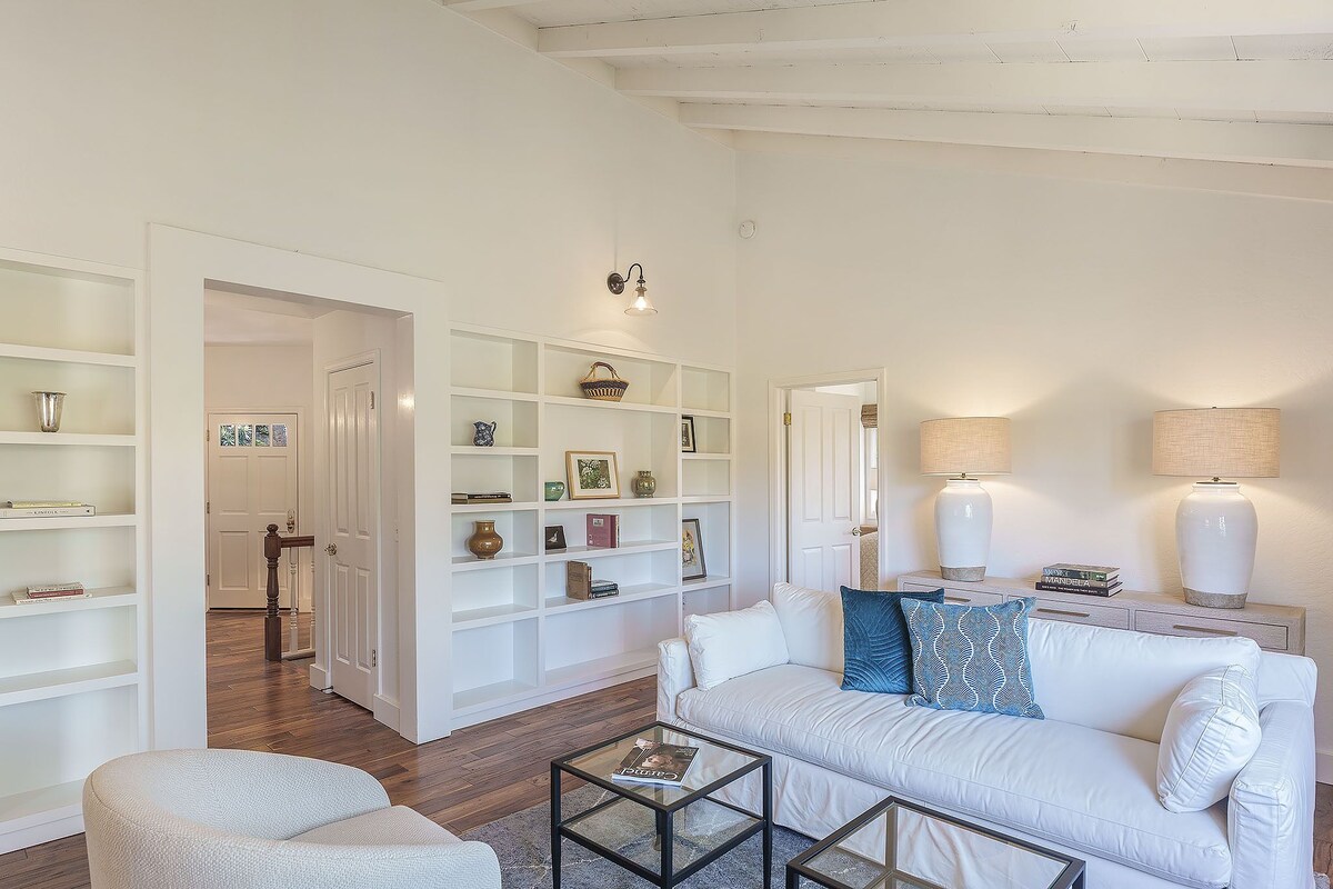 Sanctuary Vacation Rentals is proud to present \ ! This vacation home sleeps up to 8 guests. This beautifully renovated 2,383-square-foot home, set on a large, lushly wooded lot offers ample indoor and outdoor space to relax and restore. With 3 bedrooms and 2.5 bathrooms, this 2-story retreat has everything you’ll need for a comfortable stay. Living Spaces The main living spaces flow effortlessly and feature high vaulted ceilings, rich dark wood flooring and quaint board and batten style walls. The floor plan achieves the perfect balance between openness and privacy. The spacious living room, lined with shelving on one side and windows on the other, is appointed with comfortable furnishings and warmed by a gas fireplace. A sunny bonus room between the kitchen and garage is nicely suited as an office. Beautiful wood stairs lead to the lower level which includes a spacious family room. Here you’ll find a wood burning fireplace, queen sleeper sofa and other comfy furniture, a game table and 63\ flat-panel TV and comfy sofa. A peninsula with 3 stools and 5-burner gas Jenn-Air cooktop separates the breakfast area and the central part of the kitchen. A Sub Zero refrigerator/freezer, a double oven and Bosch dishwasher are set among Emerald green ceramic tile countertops and wood cabinets. A drip coffeemaker, toaster, tea kettle and large microwave complete the picture. Just off the kitchen, the formal dining room features seating for 8 and opens onto a small balcony. Downstairs, doors from the family room open onto a deck that runs along the side and back of the home. A gas grill and patio furniture afford al fresco dining and forest views. Bedrooms and Bathrooms Bedroom #1 is set privately at the rear of the main / upper level. It’s furnished with a king bed with a Heavenly mattress and a walk-in closet. The en suite bath has a dual vanity and a walk-in shower. Downstairs, a hallway leads to 2 guest bedrooms. Bedroom #2 has a queen bed, Bedroom #3 has 2 twin beds. A bathroom at the end of the hallway features a shower, separate soaking tub, and a vanity with sink. The half-bath near the main entrance is easily accessed from all main floor rooms. A queen sofa sleeper is located in the downstairs family room, perfect for children or weekend guests. The laundry area with stacking washer and dryer is located off the downstairs hallway. There’s ample parking at the top of the sloping driveway. There’s room for a small car in the attached garage as well as in front of it. Exercise caution when backing up the steep driveway. It’s a short walk to Ocean Avenue and a large dog friendly beach. Explore the streets of the village where you’ll find wine tasting, gourmet grocers and delis, world-class restaurants, shops and galleries. A short drive takes you to The Crossroads, The Barnyard and Carmel Rancho shopping centers. Plan a day trip or two to explore Carmel Valley, Big Sur, Pacific Grove and Monterey discover the unique aspects of the Monterey Peninsula. Well-behaved small dogs are welcome with pre-approval, an additional pet fee and a signed pet addendum. This home is a monthly rental and we request that all nights of your stay are within the same calendar month. Some exceptions may be possible, with the approval of our team and the homeowner. Extended stays are often possible. This vacation home is professionally managed by Sanctuary Vacation Rentals. With over 15 years of property management experience, Sanctuary strives to provide environments that nurture and inspire with all the comforts of home. Each home has beach towels, shower and bath amenities and spa-style robes. Our team is available 7 days a week to assist you. Our prices include all fees. No hidden fees.