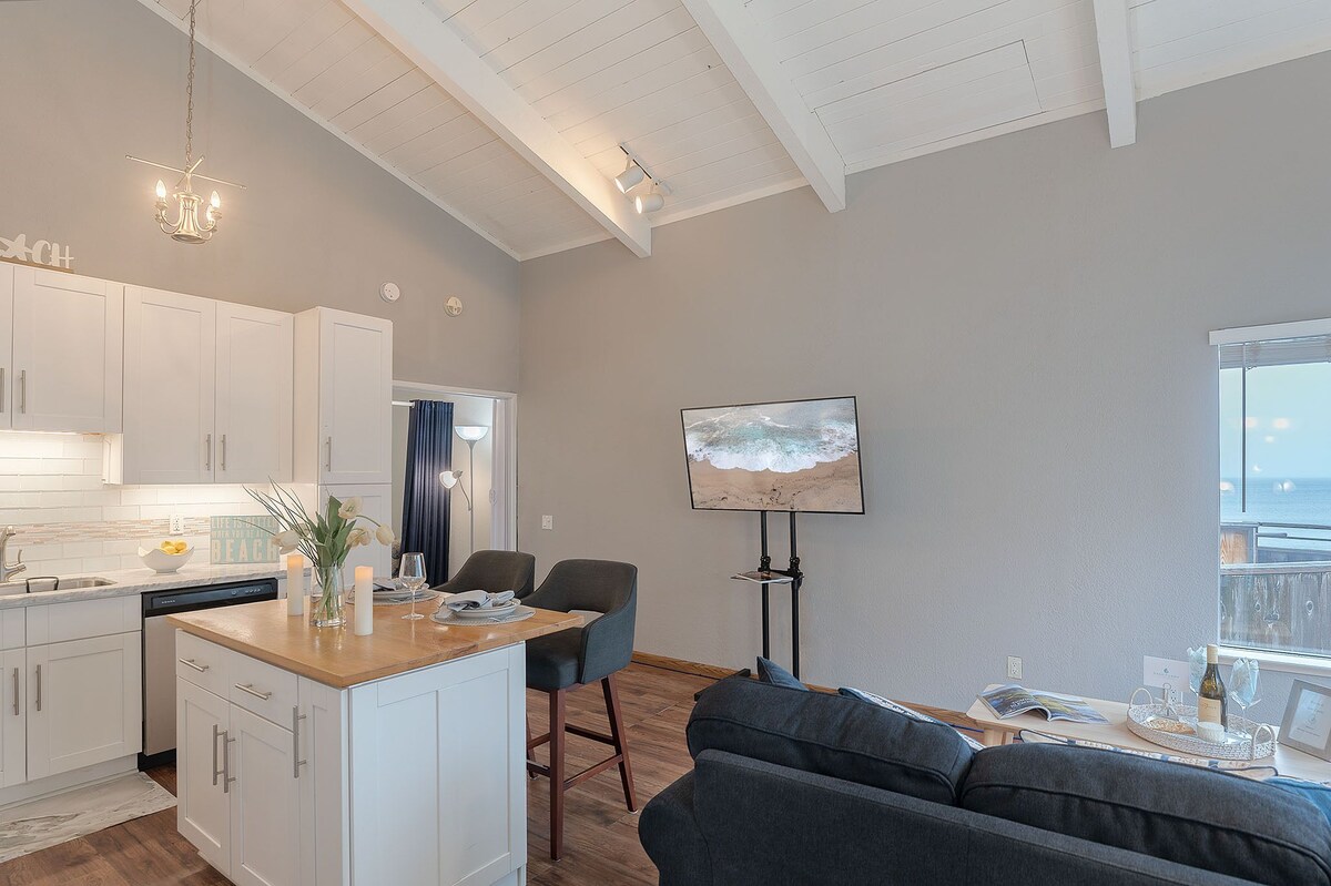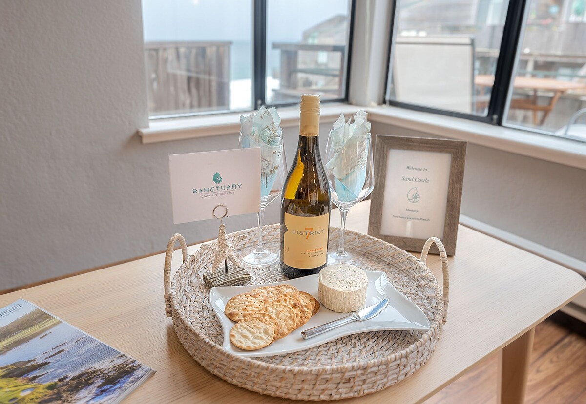 Sanctuary Vacation Rentals is proud to present \ ! This condominium vacation home sleeps 2. Located in an ocean front community, this fully furnished and well-equipped 460 sf condo home is the perfect solitary retreat for one or a cozy love nest for two, and even has optional sleeping for a third in the living room. The gated, ocean front complex includes two pools (one is heated) hot tubs and saunas, a fitness room, a club room, and a game room. A community laundry facility is on the property that conveniently accepts cards instead of coins (guests pay per load). Enjoy the bay view from your deck or living room, or walk downstairs to the gated beach entry where you can relax by the sea on the long, sandy beach. The Monterey Peninsula features ample walking and biking trails, world class golfing and attractions like the Monterey Bay Aquarium, Pebble Beach®, and Carmel. Beautiful sights and beaches await! Enjoy nearby shopping and fine dining to make your vacation complete. Living/Kitchen/Dining Enter directly into the open plan living/kitchen/dining area with high ceilings. The open concept living/dining room has views of the bay, and seating for two at the kitchen counter. Cozy up on the sofa in front of a large flat screen TV with streaming service. Or turn off the TV and soak in the bay view. The sofa also converts to a full/double size bed if you need a sleeping option for a weekend guest. The recently remodeled kitchen is well-equipped so you can stay in and enjoy meals from your cozy retreat. Well-equipped for extended stays! Deck The small deck features full views of the ocean and seating for two. Bedroom and Bathroom The Bedroom features a King bed and en suite bathroom with a standing shower. An additional sleeping option is available on the full/double size sleeper sofa in the living room. Parking There is only one assigned parking space within the gated community, thus there is a 1-car maximum for guests staying at this vacation home though there is sometimes street parking available outside the gate. Pets Well-behaved small dogs are welcome with pre-approval, an additional pet fee and a signed pet addendum. Pets should never be left unattended in the home. Please be aware that the Homeowner has a cat that occasionally visits the home, so if you have severe allergies, please let us know. Hard floors throughout make cleaning a breeze and furniture covers are provided. This vacation home is professionally managed by Sanctuary Vacation Rentals. With over 15 years of property management experience, Sanctuary strives to provide environments that nurture and inspire with all the comforts of home. Each home has beach towels, shower and bath amenities and spa-style robes. Our team is available 7 days a week to assist you. We look forward to hosting you! Our prices include all fees. No hidden fees.