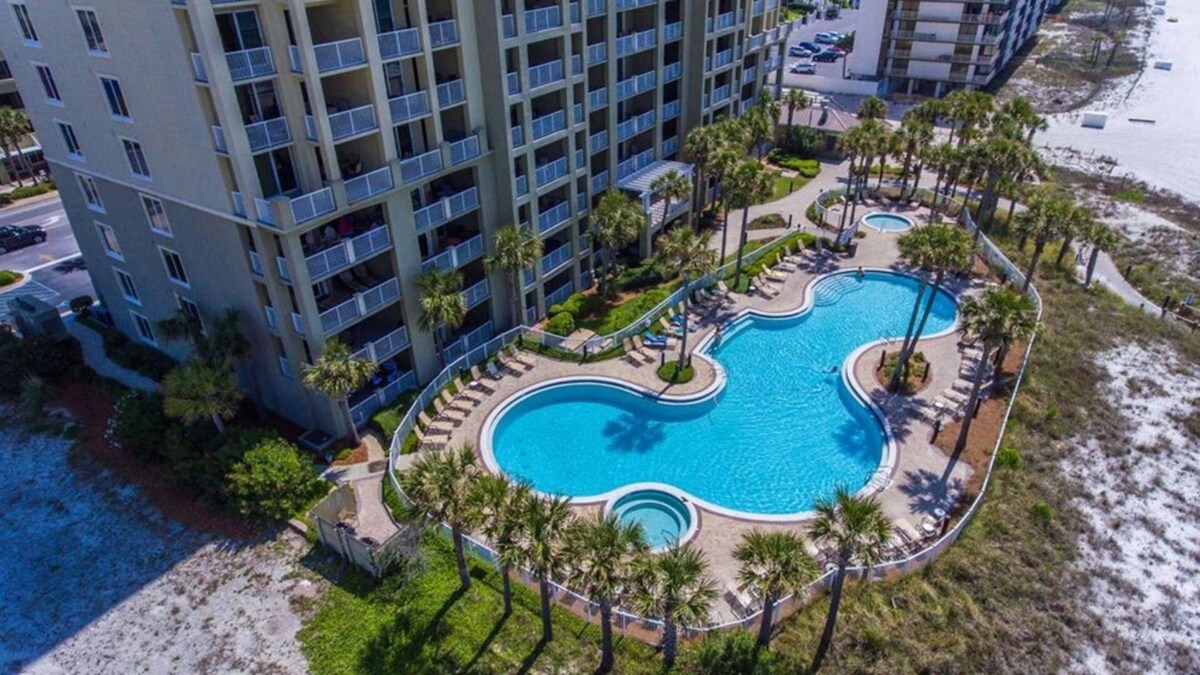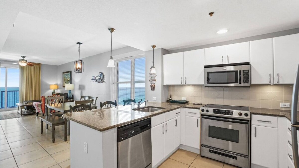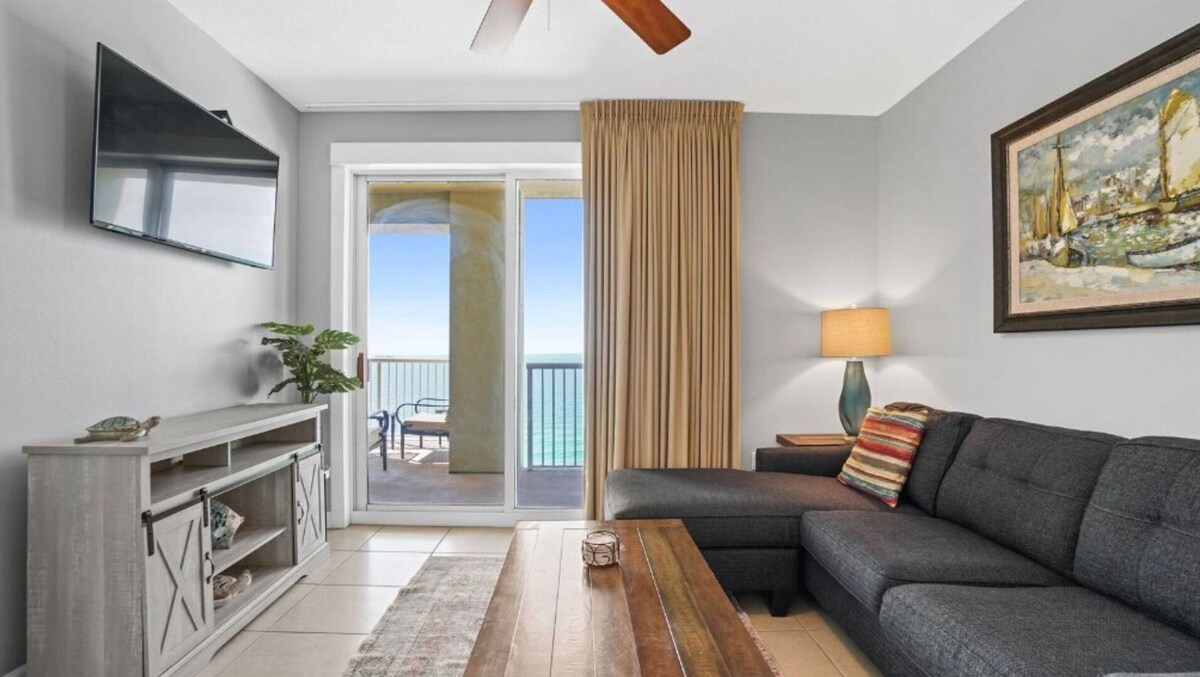 Warren Beach Rentals is proud to present Grand Panama Resort 1801. This highly coveted WEST CORNER unit offers the best sunset views in all of PCB from the massive corner balcony. Newly remodeled 3-bedroom unit features incredible Direct Gulf Front views and the largest outdoor living area in the resort. It offers the convenience of being high enough to be above the street noise and has commanding views for miles in all directions courtesy of windows surrounding the living and dining areas. As a bonus, 1801 offers VIP Beach Service, that includes 2 chairs and umbrella set up daily for you during your stay. Available in season from Mid-March through October ($50/day value included in the cost of your rental). The unit includes a large Gulf front master bedroom with a king bed and ensuite bath that opens onto a spacious outdoor veranda. The living area provides direct access to the balcony and boasts views of the beach, sunsets, coastline, and the Gulf's sparkling waters from every angle. The living, dining, and kitchen areas are surrounded by windows, flooding the space with natural light, a feature exclusive to corner units. The living area is furnished with coastal casual furniture that is functional, elegant, and extremely comfortable. The modern kitchen is fully equipped with all necessary appliances and utensils, including new frying pans, a coffee maker, and toaster. Guests can enjoy their morning coffee at the kitchen island or have a full breakfast at the separate dining space. A new large Smart TV and ample seating make the living area perfect for movie nights. The balcony offers dining space and seating for relaxing with sunset cocktails while taking in the amazing views. The unit has two additional guest rooms: Bedroom 2 features a queen bed and large window with spectacular Gulf views and sunsets. Bedroom 3 also has a queen bed and city views. A twin over full bunk are in the hallway nook so you can sleep 9 comfortably. A full size washer and dryer are provided for added convenience. Guests can grab their beach towels and chairs to head out to the beach or enjoy the shade at one of the multiple pools nearby. Water sports such as sailing, jet skiing, kayaking, or parasailing are located nearby, and the Village of Grand Panama offers shopping and dining options on the north side of the resort. The Grand Panama Resort also features a full fitness center and event space accommodating up to 120 people, ensuring there's something for everyone at Grand Panama 1-1801. Additional Information: Beach Service Included (2 chairs and umbrella) from Mid March to Mid October Pets (dog only) considered up to 25 lbs with the exception of service pets. There is a $225 plus tax additional pet cost per dog and the pet must be registered in advance through the HOA. Grand Panama is the ONLY pet friendly modern condo on the gulf. Grand Panama HOA additional costs: The resort cost is $55.00 The resort cost includes 1 parking pass and wristbands for everyone in your reservation 13 and older. Wristband replacement is $10.00. Motorcycle parking is $55.00. Trailer Parking is $55.00 (only during bike week). An additional parking pass can be purchased for $35.00 during registration. Only two parking passes are allowed per unit. Guests bringing a pet to a Pet Friendly unit must register the pet in guest registration system. Pet Sleeves are $50.00 per sleeve. Garage clearance: Main garage 7'6\ ,