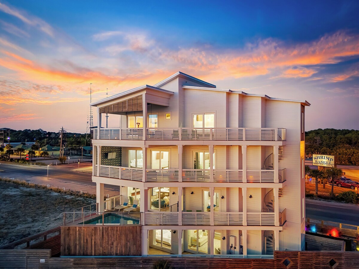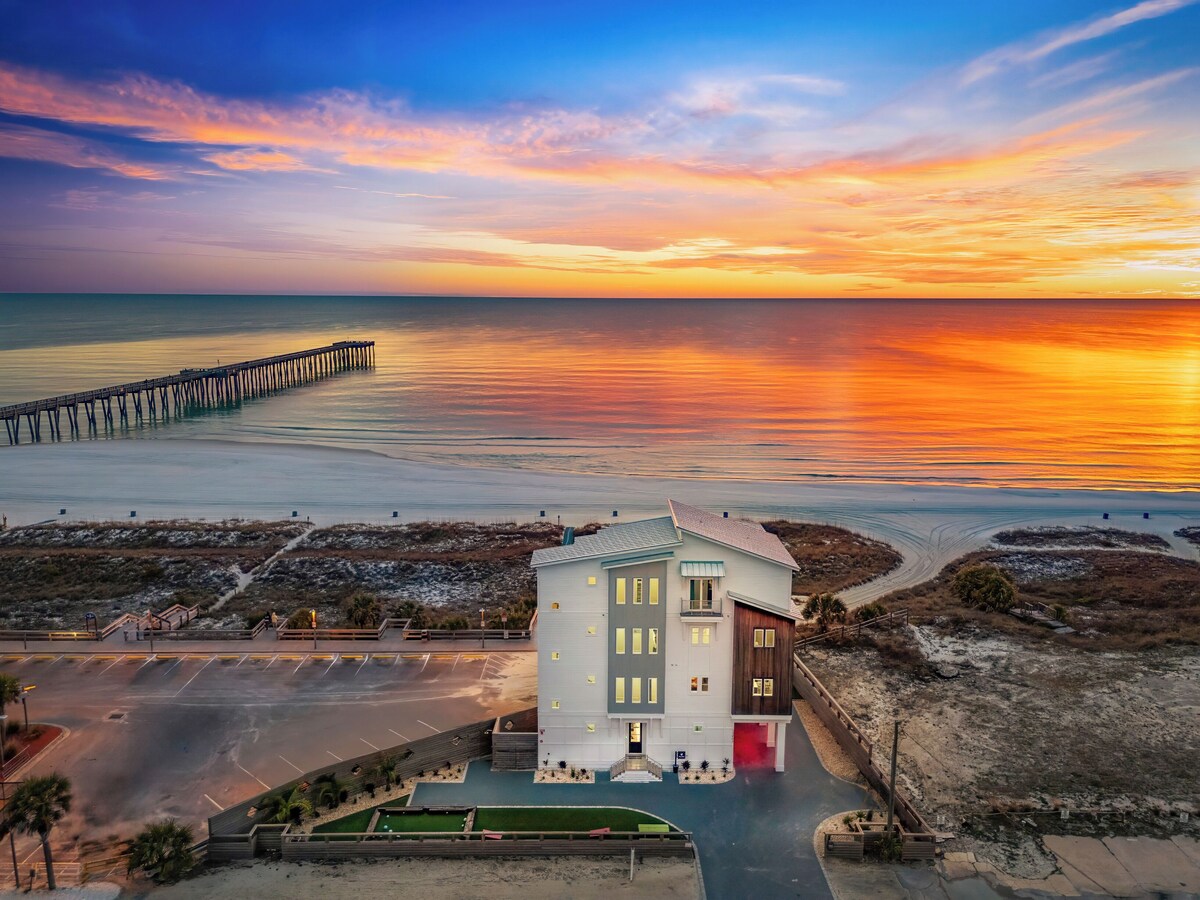 Wander Panama City Beach is a stunning four-story waterfront home designed for an unforgettable coastal getaway. Boasting luxurious amenities, this retreat features an outdoor pool for relaxing under the sun and spacious balconies offering breathtaking ocean views. An elevator ensures easy access across floors, while the BBQ area and outdoor dining and seating spaces provide the perfect setting for entertaining or enjoying the tranquil seaside ambiance. Ideal for families and groups, it promises relaxation and sophistication by the beach. Panama City Beach offers a wide range of activities for visitors to enjoy. Relax on the pristine white-sand beaches, swim in the emerald waters, or try paddleboarding and jet skiing. Visit Pier Park for shopping, dining, and entertainment, or explore marine life at Gulf World Marine Park. Outdoor enthusiasts can enjoy fishing charters, dolphin-watching tours, or hiking in nearby state parks. With vibrant nightlife, family-friendly attractions, and stunning sunsets, there's something for everyone to enjoy. TDT: #292572 DWE1307014 BTR: 59846 Our prices include all fees. No hidden fees.
