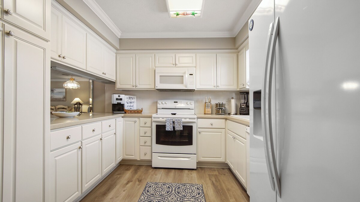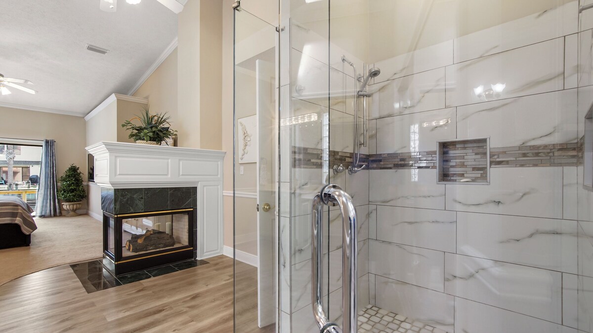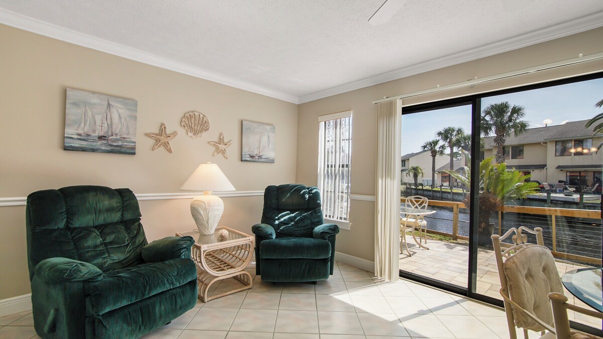 Welcome to Bucky's Beach Too, a pet-friendly 3-bedroom townhome with a small fenced back yard overlooking the canal. It's perfect for your next family or friends getaway in Panama City Beach. You'll love the spaciousness of this gorgeous two-level townhome plus the convenience of no elevators and park-at-the-door, dedicated parking spaces. Inside, our downstairs offers a living area with comfortable seating, a smart TV, a half bath, and a well-equipped kitchen with all you need for meals and snacks including a blender, full coffee pot (traditional style), toaster, and crock pot. At the back of the townhome is a sunroom with a table and four chairs for game play, doing puzzles, or eating, plus two lazy chairs for reading and relaxing, and a murphy bed that sleeps two. Continue outside to our large bricked patio with a table and chairs. It's surrounded by a deck railing system overlooking the adjacent canal water feature. Also downstairs at Bucky's Beach Too is the main suite with vaulted ceilings, a king bed, smart TV, large walk-in closet, gas fireplace, and ceiling fan. A sitting area offers space to read and relax, and you can step out the sliding glass doors to the patio overlooking the canal. The ensuite bathroom has a glass gas fireplace nestled between the dual vanity, private toilet, and large glass shower. Upstairs are two additional guest bedrooms: the primary overlooks the canal and features a queen bed and a twin bed with a trundle pullout, vaulted ceilings, an easy chair, 55\ ,