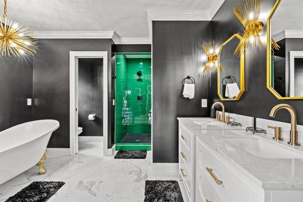 Two uniquely themed luxury townhomes just steps from the beach! 🏛 The Gatsby channels Roaring ‘20s glamour with bold colors and vintage elegance. 🕊 La Château radiates French countryside charm with soft pastels and rustic refinement. Together, they offer 10 bedrooms, 9 bathrooms, and shared access to a pool—perfect for large groups, weddings, or reunions. Enjoy high-end finishes, spacious layouts, and walkable access to Panama City Beach’s top dining, nightlife, and white sand shores. 🏛 The Gatsby – Roaring ‘20s Glamour Quick Layout: 1st Floor: Garage, laundry, queen bedroom w/ Jack & Jill bath 2nd Floor: Fully stocked kitchen, dining/living area, half bath, queen bedroom w/ ensuite 3rd Floor: King master suite, 2 bunk bedrooms (4 beds each), shared full bath Main Level: Enter through a gray entryway into a queen bedroom with vintage print wallpaper, Rococo-style armchairs, and a Smart TV. The ensuite features green and white tile, gold fixtures, and art nouveau wallpaper. Laundry room also located on this floor. Second Floor: Themed in jade green, black, and gold, the kitchen features black granite countertops, green cabinets, onyx backsplash, brushed gold fixtures, and velvet curtains. Appliances include a French door fridge, oven, range, microwave, and dishwasher. A black granite island seats four. The open living/dining area includes a vintage dining table for five, a speakeasy-style bar, Smart TV, and ocean-facing windows with velvet curtains. Also on this floor is a queen bedroom with a crushed velvet bedspread, ensuite bath, walk-in shower, and French doors to a balcony. Third Floor: The king master suite features a tufted headboard, jade chenille bedspread, antique nightstands, a balcony, and a framed 1920s flapper dress. The ensuite bath includes marble floors, double vanity, clawfoot tub under a starburst chandelier, and a jade-tiled walk-in shower. Two bunk bedrooms (each with two twin bunk beds) share a floral-style bathroom with a shower/tub combo and single vanity. A small balcony off the third floor is perfect for kids’ snacks or tea parties. 🕊 La Château – French Country Elegance Quick Layout: 1st Floor: Queen bedroom w/ ensuite 2nd Floor: Queen bedroom w/ ensuite, kitchen, dining/living, half bath 3rd Floor: King suite, queen guest room, 2 bunk rooms (1 with trundle), shared bath Main Level: Enter through an aqua-toned entryway with a shabby chic welcome table and impressionist art. The queen bedroom includes a white sleigh bed, floral chandelier, Smart TV, and ensuite with gold fixtures and petal-patterned tile. Second Floor: The bright French-style kitchen includes white granite counters, maple and white cabinetry, a farmhouse sink, brushed gold fixtures, and natural stone backsplash. Appliances include a French door fridge, oven, range, dishwasher, and microwave. The island seats four beneath glass pendants. The open living/dining space includes cozy love seats, coastal views, a Smart TV, floral wall art, and a French farmhouse dining table for five. Floor-to-ceiling windows draped in sheer white curtains let in abundant natural light. A rose-gold half bath and a second queen bedroom with ensuite round out the floor. Third Floor: The king master suite features a Swarovski chandelier and a rose painting above the bed. French doors open to a balcony. The ensuite spa bath includes white granite, gold accents, a soaking tub with a rustic caddy, chandeliers, and a walk-in shower. A queen guest room and two bunk bedrooms (one with a trundle/daybed) share a full bath in cheerful yellow tones. Each bunk room has a flat screen TV and charming floral or toile bedding. A kids’ balcony with a café table adds the final touch. 🌟 Shared Amenities • Central A/C and ceiling fans • High-speed WiFi • Smart TVs in living areas and all bedrooms • Fully stocked kitchens • Private or ensuite bathrooms • In-unit washer/dryers • Shared swimming pool • Walkable access to beach • Minutes to top PCB dining, shops, and nightlife Ideal For: • Large groups (up to 24 guests comfortably) • Multi-family vacations • Weddings and events • Corporate retreats • Guests seeking high design and proximity to the beach ✨ Book now—peak season fills fast! Our prices include all fees. No hidden fees.
