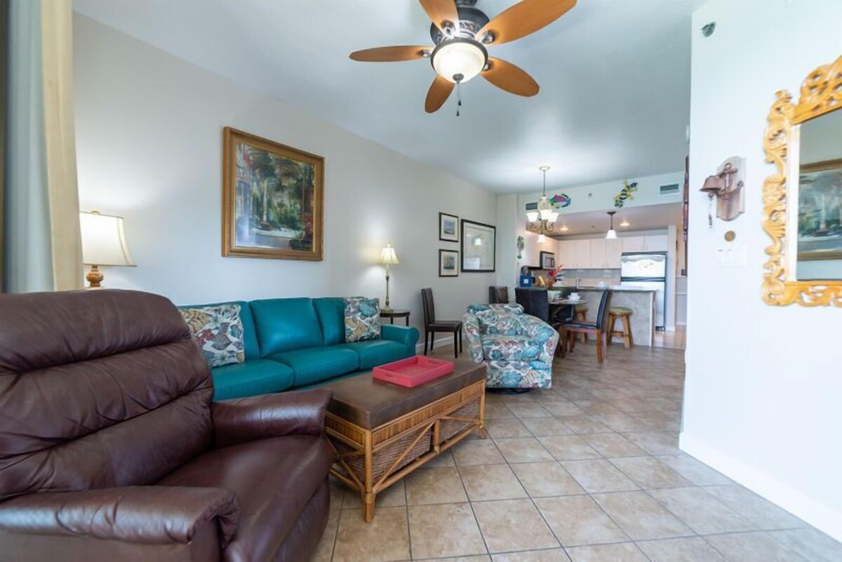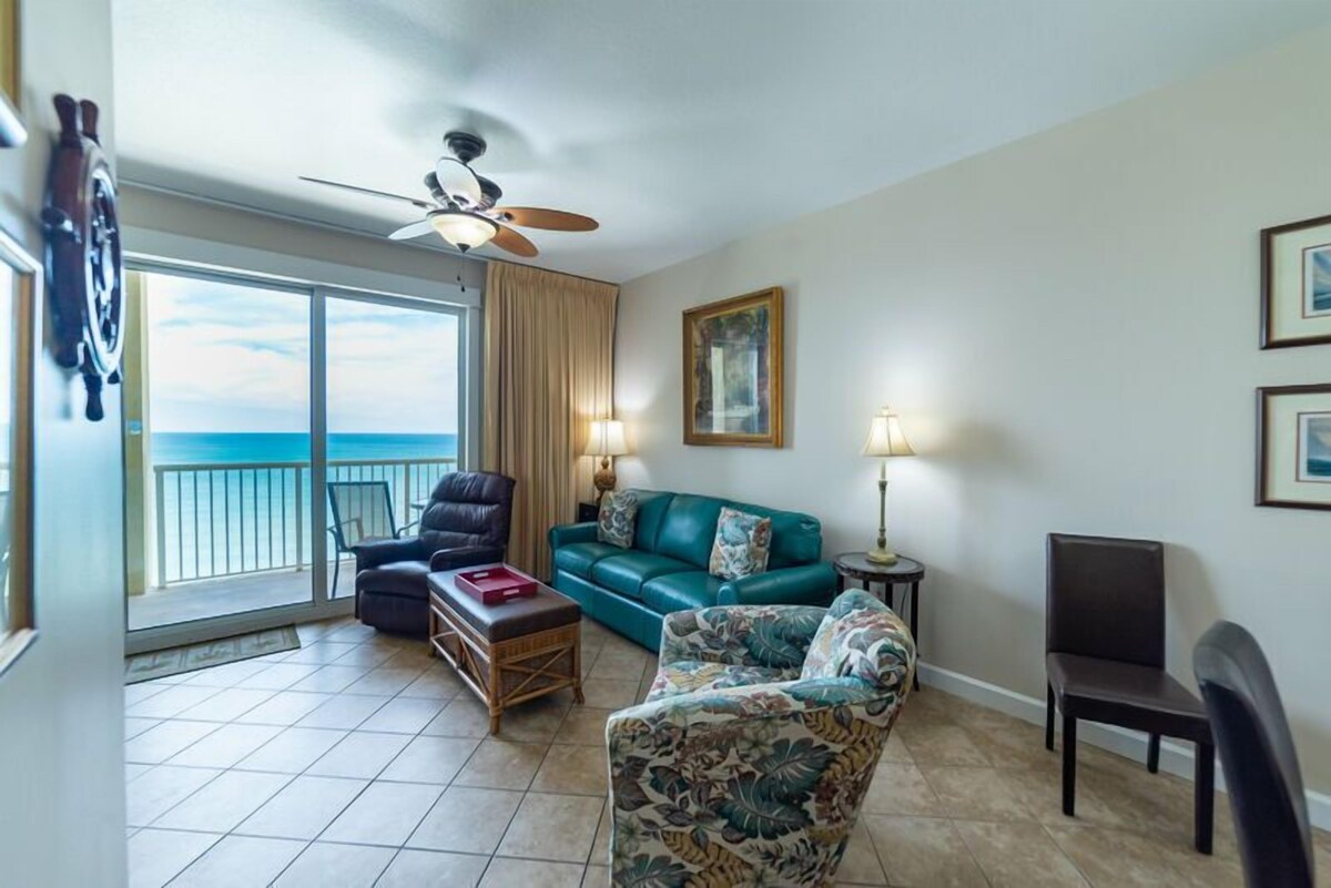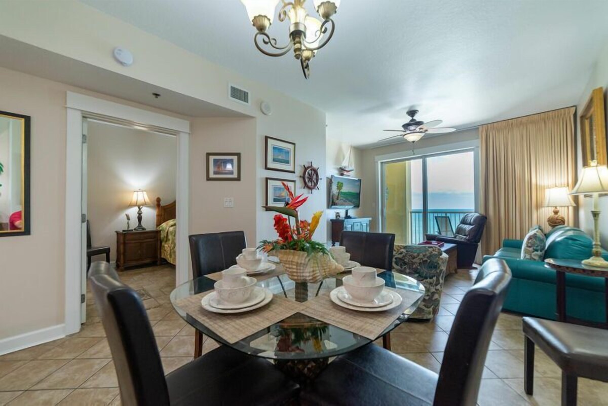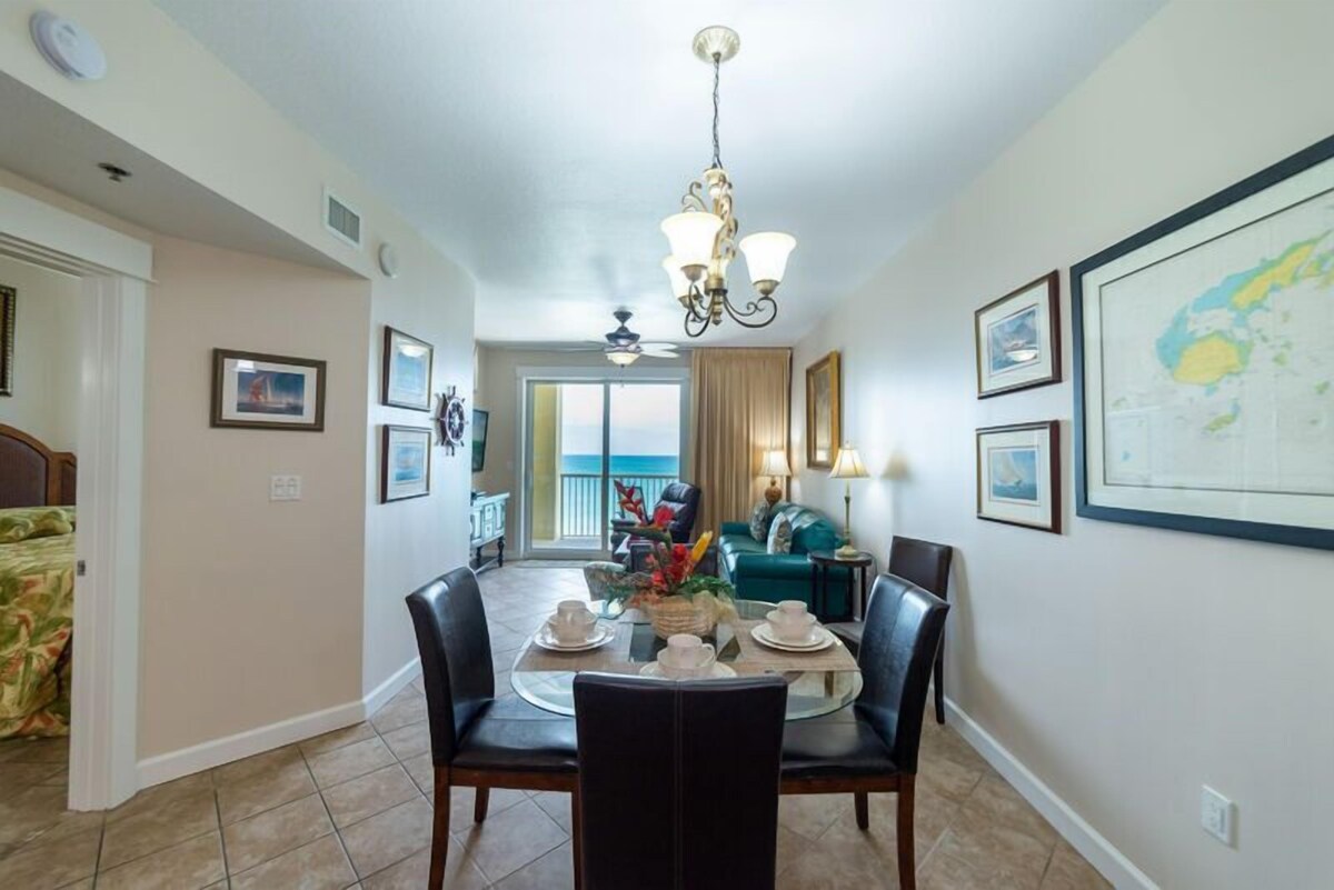 Welcome to Paradise Harbor, our 'Grand' home away from home, beachfront in Panama City Beach, Florida! Every detail of Grand Panama 1706, our 17th floor beach front *PET FRIENDLY* condo was chosen for your enjoyment from the ocean blue sleeper sofa to the collection of nautical and tropical artwork right down to the nautical dinnerware. This 2 bedroom with separate bunk room and 2 bathroom property sleeps 8 comfortably in 2 king beds, 1 set of bunk beds for the kids and a queen sleeper sofa. We know you'll love it here as much as we do! *This condo is pet friendly* -1 dog maximum and it must weight under 25 lbs -The resort charges a fee of $20 per pet (unless a true service animal) at the time of registration A 2-3 night minimum stay is required. Minimum rental age is 21. No Pets. No smoking or vaping inside the condo, please. The nautically inspired great room, overlooking the amazing Gulf of Mexico, has a 'man-sized' 52' flat screen TV and leather La-z-boy recliner for watching your favorite shows! Plug in your music device and enjoy your tunes! The queen sized sleeper sofa is oh so comfy by day and by night. The plush swivel rocker tub chair provides additional seating. This unit has beautiful tile and woodwork details in every room. The balcony is your very own secluded outdoor room! You won't even know you have neighbors! Sit back in the shade and enjoy the 650 ft expanse of private beach and the sunset views over the pier. The outdoor table and chairs are just right for intimate outside dining, morning, noon or night. The chaise lounge is perfect for relaxing the day away in your cozy hide-away! The Captain's Main suite has a luxuriously appointed king-sized bed with high thread count sheets and a memory foam topper. You'll love the hand painted tropical chest and the large wall mounted TV. Open the sliding door and enjoy the sound of the surf right from your bed! The en suite private main bath has a fabulous oversized soaking tub, a walk in shower with shower massage and built in seat, double sinks and a separate toilet area. You'll just love the granite counter tops and fancy tile work and beautiful woodwork in this bathroom. The First Mate's bedroom has a king-sized bed with luxury linens. You'll feel like you are sleeping on a cloud. The window opens to the walkway and has a view over the town. This room has a large wall mounted flat screen TV. This nautical bedroom has a private entrance to the adjacent hall bathroom so it's very convenient. The extra large hall bathroom is a palm tree paradise! With an oversized tub/shower combination with shower massage it is sure to be comfortable for everyone. The Crew's Quarters is the kids' own bunk room. It's every kid's dream room. The bunk beds and cool kid friendly furniture are so much fun. There's a TV just for them, too. This hall area bunk room has real doors so the kids have their privacy and so do you! Bunk beds are for use by kids under 100 lbs. only, please. The gourmet kitchen has an ocean view, too! With stainless steel appliances, granite counter tops and gourmet cookware, it's a pleasure to prepare meals and snacks. You'll find everything you need to make cooking easy in your kitchen: a coffee maker and a Keurig machine, coffee grinder, blender, hand mixer, toaster, knife block set, dinnerware, flatware, glassware and tons of other gadgets. There's even a crock-pot for having dinner ready when you get back from a long day at the beach. The property has a washer/dryer and an iron and ironing board for your convenience. It's so nice to have in-unit laundry! Wireless internet access is included throughout the property Parking is available in the Grand Panama Parking decks. Parking passes and wristbands must be pre-registered and picked up at the front desk upon your arrival.There is a fee associated with this reservation after booking! You are limited to 2 parking passes. There are two decks, one adjacent to the Grand Beach tower that is served by a walk over bridge and another that is located adjacent to the street side tower. Parking rules are enforced by the Condo Association. Parking passes are required for all vehicles. Vehicles parked in reserved spaces or without parking passes are subject to towing without notice. The Grand Panama Resort offers 2 huge pools, 2 hot tubs and kiddie pools. One is beach side and the other is a beach overlook pool in The Grand Vista Tower. Poolside Tiki bar! Lush tropical landscaping and swaying palms throughout the resort give a relaxed feeling all around you. The fitness center, located on the first floor of the Grand Vista tower, is open daily with state of the art equipment to restore your body, mind and spirit. Paradise Harbor is pet friendly! The limit is 1 dog maximum and the dog must weigh 25 lbs or under. The resort does charge a pet fee that must be paid in advance. Please ensure you are carrying all required vaccinations for verification. Enjoy dining and shopping in the adjacent Village of Grand Panama or take a short drive to Pier Park. Restaurants in The Village include Another Broken Egg Café, open for breakfast, brunch and lunch, featuring a menu made with delicious fresh ingredients. Even more restaurants are a short drive away at Pier Park. There is so much to do here in Panama City Beach and at the Grand Panama Beach Resort, we can't wait for you to arrive and start having FUN! So, call today to make your reservations! All condos are not the same. When you rent a condo from Emerald Beach Properties, you can be sure of exactly where you will be staying. What you see in this listing is where you will stay. Yes, the unit is as nice as the photos, guaranteed! Why choose a luxury property managed by Emerald Beach Properties on behalf of the owner? We offer the advantages of a full service management company and vacation rental from an owner who takes pride in their property. We're here in Panama City Beach, with a local front desk and local staff on call 24 hours a day, 7 d