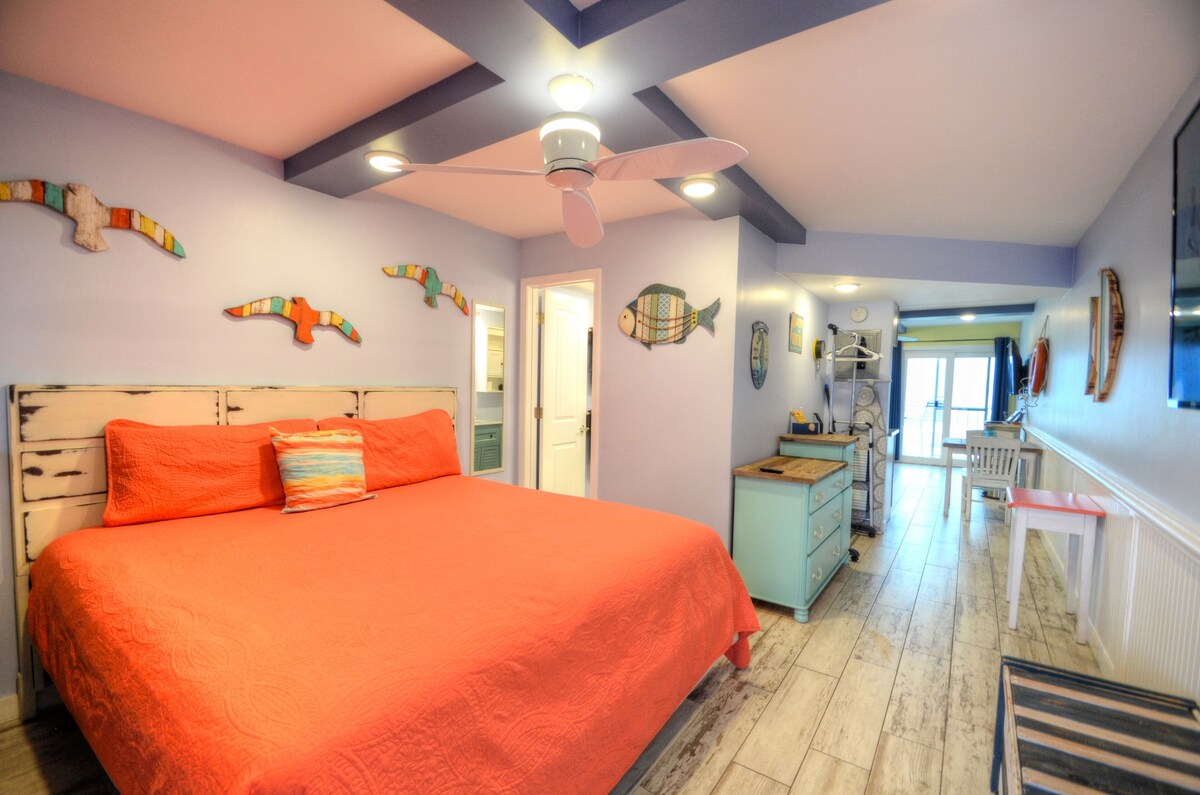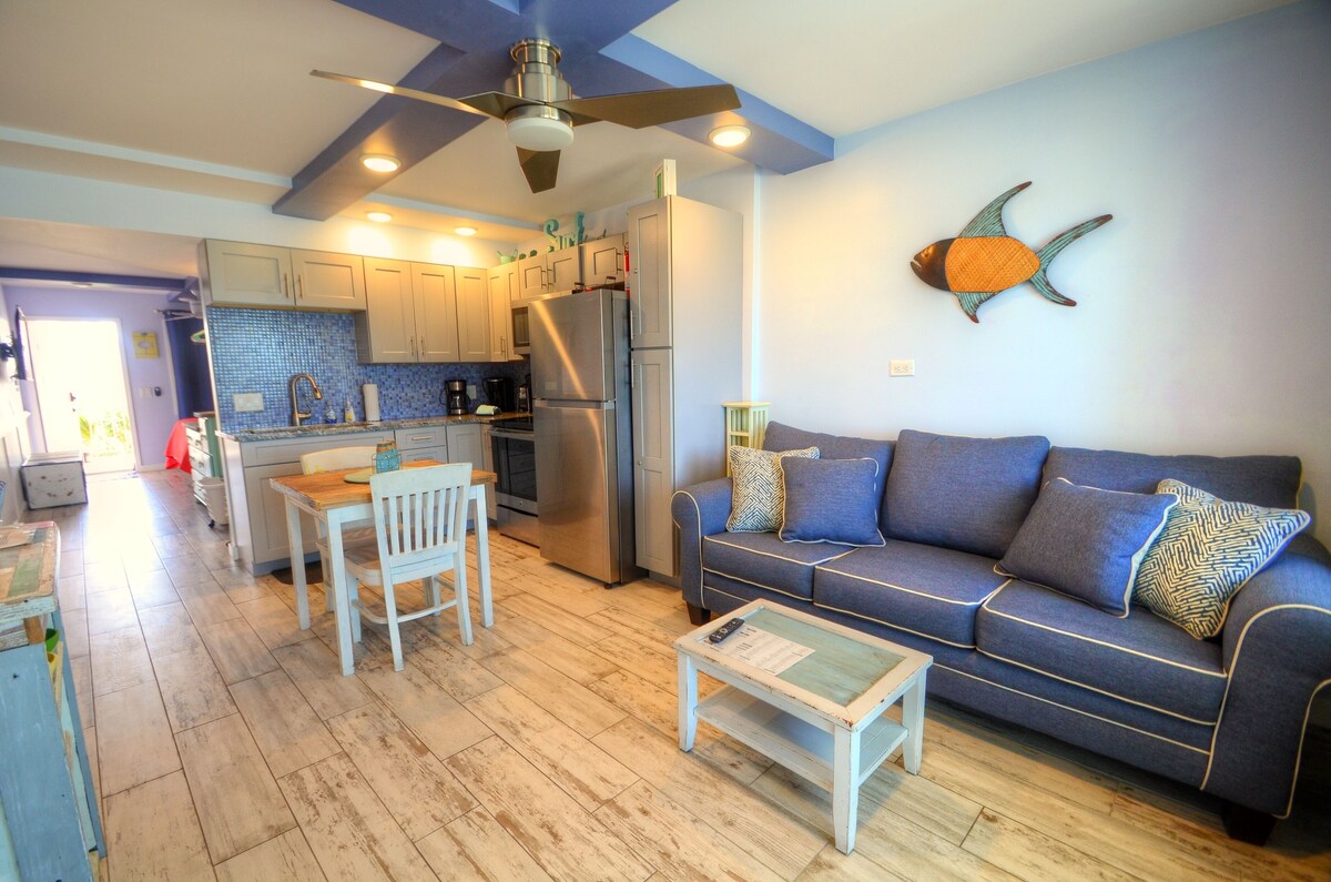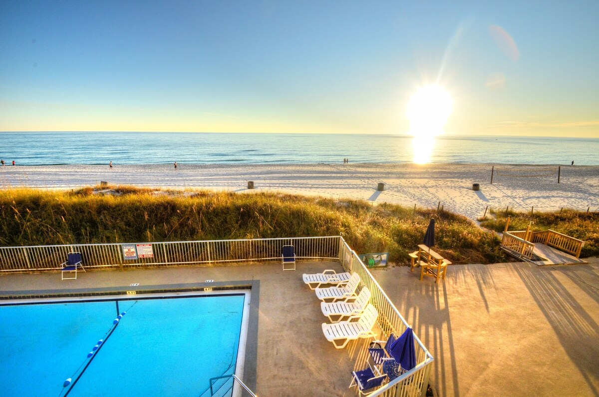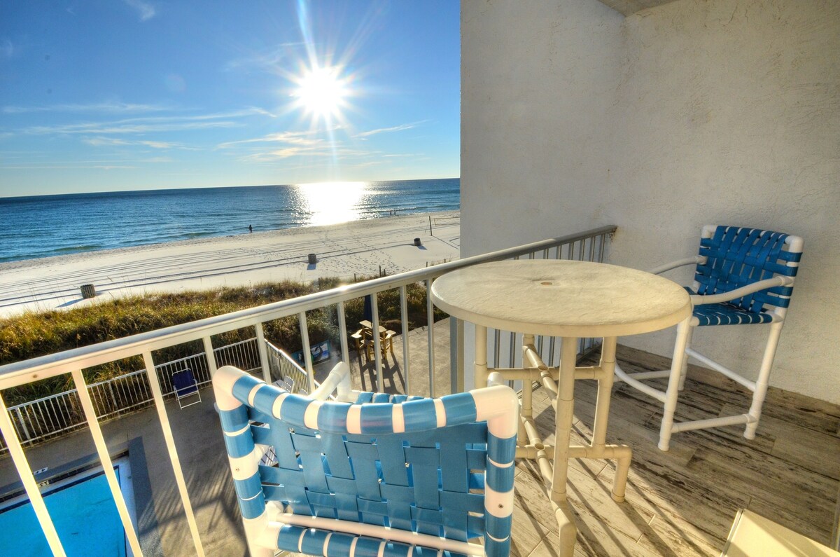 Remodeled gulf front condo (2nd floor) within walking distance to Pier Park! Dog friendly! (Small grass dog area on site. Approx 70lbs or under. Check dog fee box on VRBO.) We provide 2 beach loungers & umbrella on the beach from 3/15-10/31. Stunning kitchen features granite countertops & tile blue backsplash. Bath features ceramic tile walk-in shower w/ rain shower head. Master bedroom has a king bed & 55 inch Smart HDTV. Sitting area has a queen sleeper sofa with memory foam mattress & a 2nd Smart HDTV. Distressed plank tile flooring & eclectic coastal décor throughout. Amazing gulf, pool, & sunset views from your balcony & living room. Walk to Pier Park, Top Golf, Shuckums, Gulf World, Sharkys, Diegos, & the dog beach at Pier Park entrance. Five minute drive to Frank Brown Park for Gulf Coast Jam. Small complex so no elevators or complicated parking. Hot tub, patio, beach shower, & charcoal grills onsite. We also own 2 adjacent units (VRBO 1817520, 2381370) & a first floor unit (3262642).