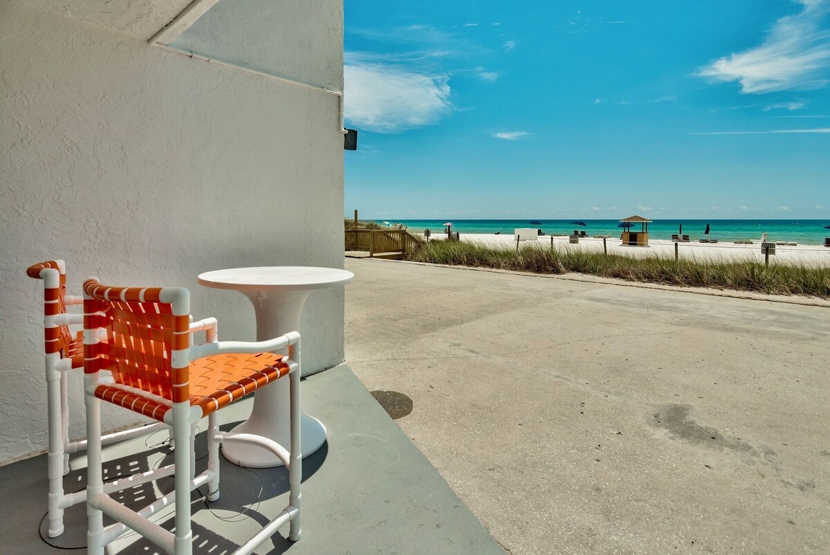THIS UNIT SLEEPS 3 ********* PET FRIENDLY ********** WE DO HAVE PET FEES depending Looking for a walk out to the beach and gulf front condo? Well we have it! This has NO parking garages NOT a high rise. This is a TRUE WALK OUT GROUND FLOOR CONDO . LOCATION LOCATION LOCATION walking distance from the NEW PIER PARK! restaurants, shopping, amusement park, movie theatre, and more! THIS condo is a 1 bedroom king bed 1 bath. It has a Futon that sleeps 1 Kitchen comes fully stocked . Towels and liens provided! CONTACT US about our TRUE BEACH FRONT CONDO TODAY! So, Come On, Bring FIDO. There are 25 Steps down the the Cabana ground floor with no elevator Our prices include all fees. No hidden fees.