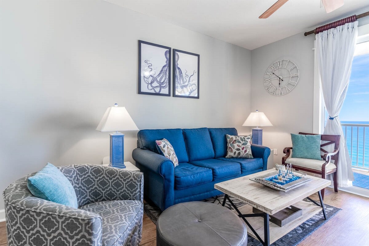 Welcome to Grand Panama 1508. You will love this condo right on the sparkling Gulf shores! Grand Panama Beach Resort is one of the newest and most luxurious resorts in Panama City Beach. Upon arrival at Grand Panama, you will notice the upscale quality and special touches that this fantastic property has to offer. Our beachfront unit 1508 is on the 15th floor, with a direct view of the Gulf, pool, and white sand, just steps away from the beach, pools, tiki bar, and hot tubs. This unit has been completely redecorated this year with NEW and FRESH designer furniture and bedding. Four beach chairs and a giant beach umbrella are provided in the unit, so no need to pay the daily service fee to rent them for yourself! This is a fully-furnished 2 bedroom, 2 bath unit, with a bunk bed alcove area. Enjoy free WiFi, cable, flatscreen smart TVs, and a fully-equipped kitchen with coffee maker, keurig, blender, and toaster. Watch the sun set right from your balcony while you enjoy dinner at your private patio table. This upscale resort has all of the best amenities, including two massive pools (one seasonally heated), two hot tubs, on-site fitness center, and a tiki bar with food and drinks right at your fingertips. The views from the private gated access patio are fantastic and unobstructed. And only steps away from the tiki bar! Our crystal clear blue-green water with white sand is the stuff dreams are made of, and the property is stunning, with fantastic views of the Gulf! The fishing pier is just down the beach, and you'll also be able to easily walk to: - coffee bar - ice cream shops - waterpark - miniature golf - bowling - arcade - trampoline park - scooter and golf cart rental - shopping center - famous local eateries such as Firefly, Shrimp Basket, Another Broken Egg Cafe, Dee's Hang Out, Bayou on the Beach, and Harpoon Harry's! There's roughly 55,000 square feet of retail shopping within the village of Grand Panama! In addition to the amenities above, we also offer the following: - gated access with 24-hour security - covered parking - jacuzzi tubs and kiddie pool - pedestrian walk-over to shops and covered parking INFO and FAQ Located on the Gulf of Mexico in Panama City Beach, Florida, Grand Panama Beach Resort is situated along twenty-seven miles of sugar-white sand beaches and emerald waters—the ultimate setting for a getaway. As a luxury beach resort, we have designed our policies to ensure that we consistently meet our guests' expectations. We encourage you to review the terms and fees we have itemized here. Also, feel free to contact us for answers to your specific questions. Age Restriction: to reserve a room at Grand Panama Beach Resort, our policy requires guests to be at least 25 years of age. Individual situations, however, will be addressed by request. Check-in Check-out Check-out time is 10:00 a.m. A $50 charge per room per hour will be charged for all departures after 10:00 a.m. Check-in time is 4:00 p.m. To guarantee your reservation, your credit card will be charged an advance deposit of $500 with the balance due 30 days prior to your arrival. Hurricane Policy: full refund to guests if a mandatory evacuation for the Panama City Beach area is ordered by the Bay County Emergency Operations Center. Pets (dog only) considered up to 25 lbs with the exception of emotional support pets. There is a $225 plus tax additional pet cost per dog and the pet must be registered in advance through the HOA. Grand Panama is the ONLY pet friendly modern condo on the gulf. Grand Panama HOA additional costs: The resort cost is 55.00 The resort cost includes 1 parking pass and wristbands for everyone in your reservation 13 and older. Wristband replacement is 10.00 Motorcycle parking is 55.00. Trailor Parking is 55.00(only during bike week). An additional parking pass can be purchased for 35.00 during registration. Only two parking passes are allowed per unit. Guests bringing a pet to a Pet Friendly unit must register the pet in guest registration system. Pet Sleeves are 25.00 per sleeve. Our prices include all fees. No hidden fees.