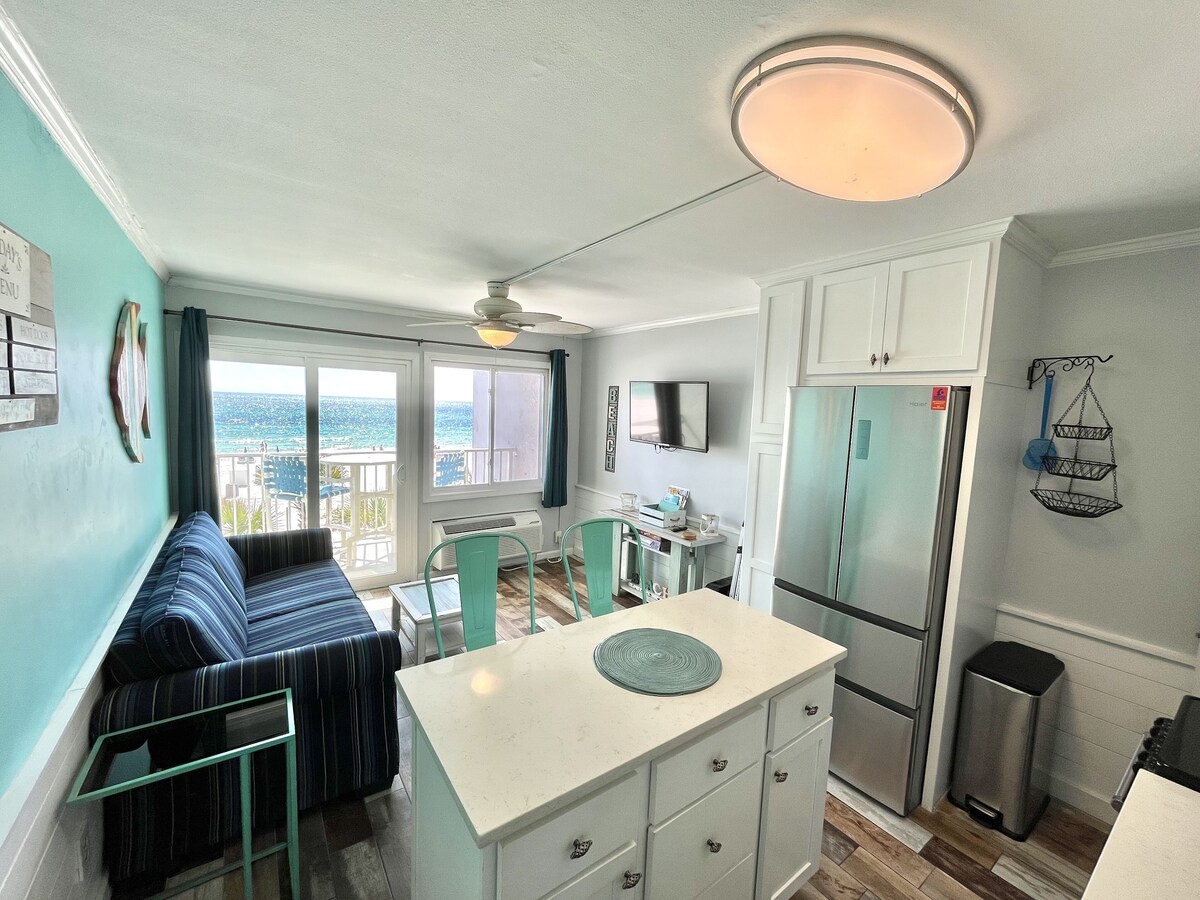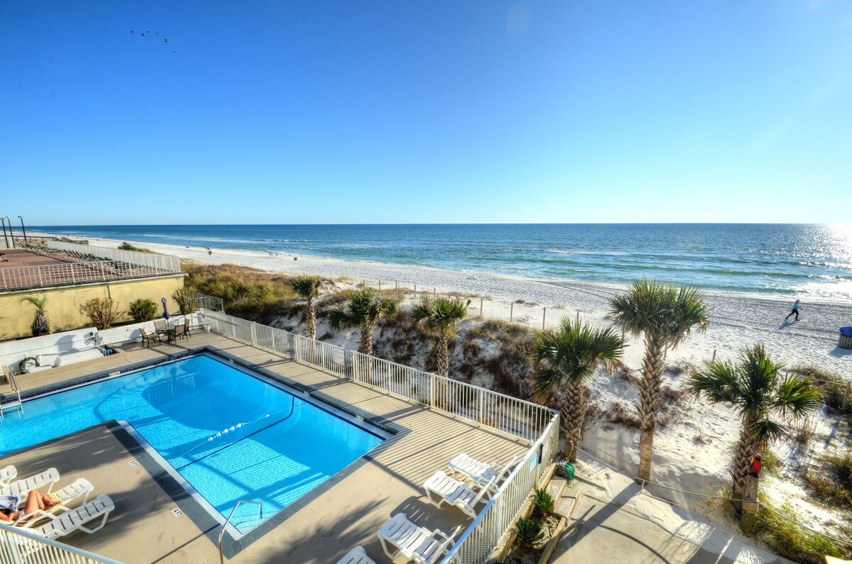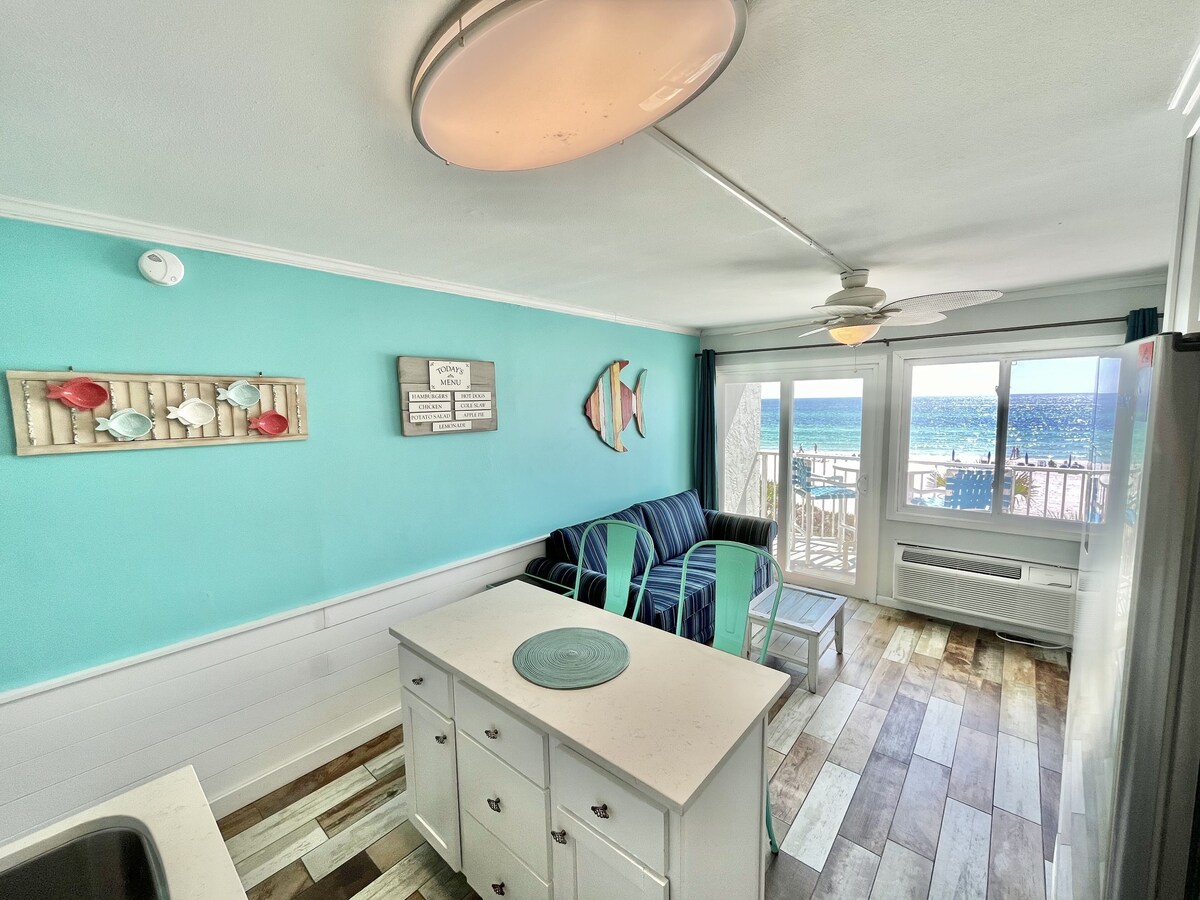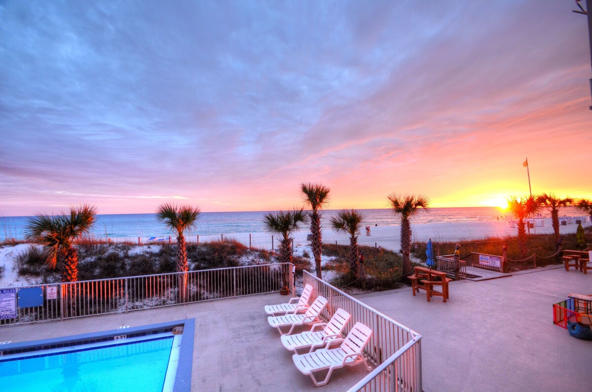 Gorgeous 2nd floor gulf front condo within walking distance to Pier Park and Top Golf! Dog friendly! (Small grass dog area on site on the right side of the building. Approx 70 lbs or less. Check dog fee box on VRBO.) 3/15-10/31 we will provide 2 lounge chairs & an umbrella on the beach for guests! Stunning kitchen features quartz countertops & island. Wonderful bath features ceramic tile walk-in shower. Master bedroom has a king bed & 55 inch Smart HDTV. Memory foam sleeper sofa & fold down murphy bed. Distressed plank tile flooring & eclectic coastal décor throughout. Amazing views from your balcony! Walk to Pier Park, Shuckums, Gulf World, Sharkys, Diegos, & the dog beach at Pier Park entrance. Five minute drive to Frank Brown Park for Gulf Coast Jam. Small complex so no elevators or complicated parking. Hot tub, patio, beach shower, & charcoal grills onsite. We also own 2 adjacent units (VRBO 1156050, 2381370) & a first floor unit (3262642). Our prices include all fees. No hidden fees.