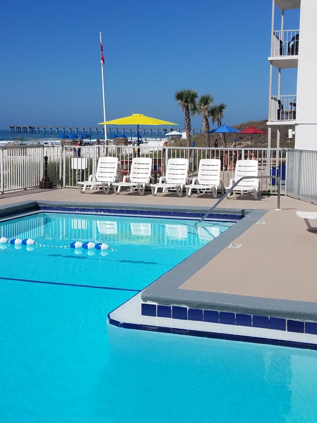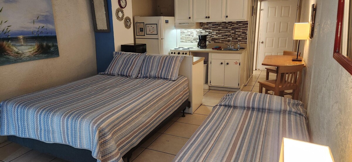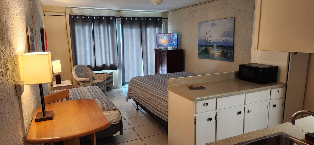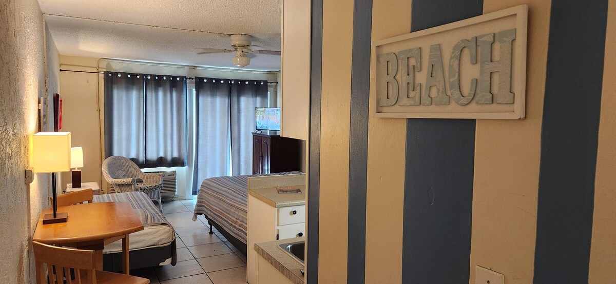 Cozy studio condo that accommodates up to 3. The property is right on the beach and this unit has a view of the Gulf of Mexico overlooking the pool. This property is located in the very popular area of Panama City Beach minutes to the Pier Park shopping and entertainment complex, Frank Brown Park Sports and Aquatic Center, Walmart, City Pier and Gulf World Marine Park. This unit is what we call \ i.e. a clean comfortable beach front property with out the high price. Pet Friendly, two dogs max. 50 lbs max each pet. We do not do daily maid service or linen exchange. We start you off with a set of linen and towels and these are yours to use and maintain during your stay. We do have a guest laundry on our third floor. This unit is on our first floor which is the parking lot level and one level above the beach. This property does not have an elevator. Our prices include all fees. No hidden fees.