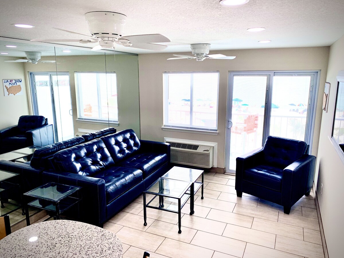 This Cute Updated Second Floor Unit but Actually 1 floor off Parking Area and two Floors off Back Beach PET FREINDLY fee applies Need some info on pets IT BOASTS Tile /Wood Floors Granite Counter Tops Thru Out Mirrors galore Stainless Appliances Walk in Glass/Tile Shower Recess Lights Fans Thru Out Leather Furniture Sleeper sofa Kind BED Built In Dressers/Cabinets Stain Glass window Sliders with Built In Mini blinds Between Glass Bar high Seating on private deck see over Rail Built in Dinning Table Our prices include all fees. No hidden fees.