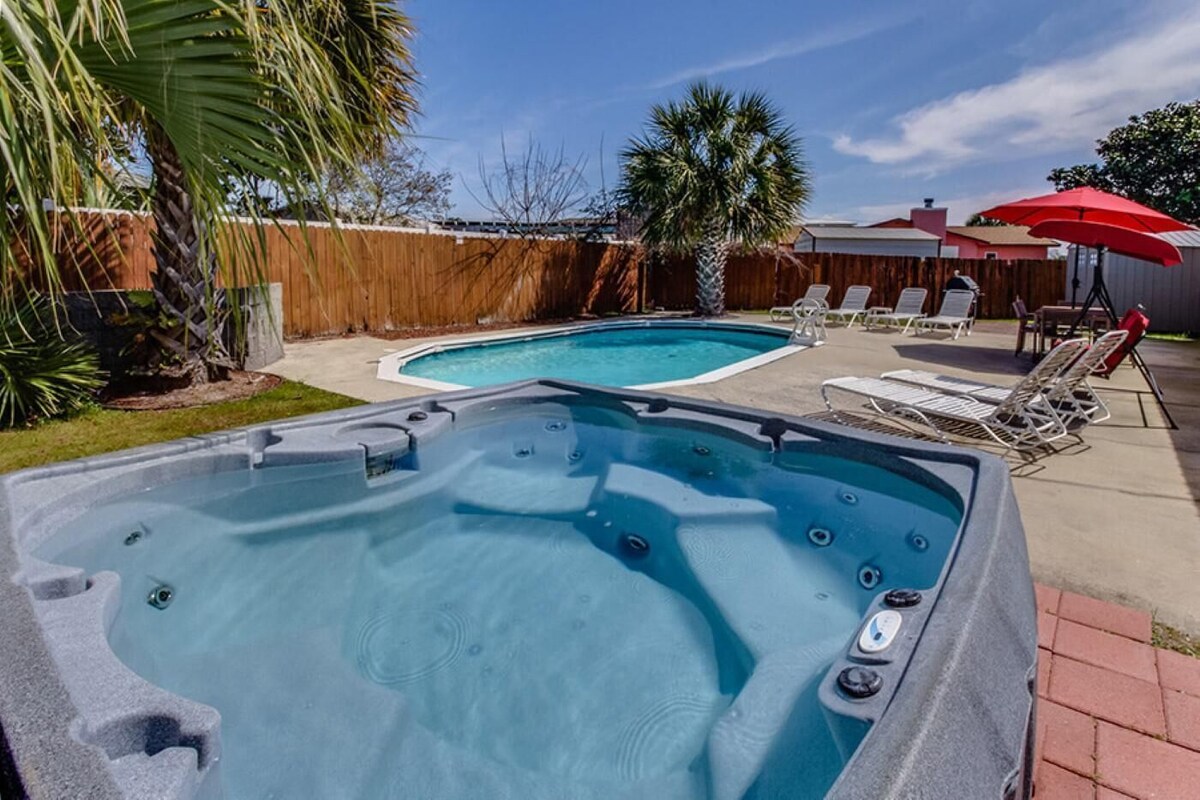 The Gulf View Home is one of our Closest Homes to the Beach without being directly beachfront! There are 3 Bedrooms, 2 Bathrooms, a nice living room and a large game room! The Gulf View Home can sleep up to 12 guests (Maximum Guests 14 allowed)! This home features its own Large Heated Private in-ground swimming pool (Pool Heated for additional Fee). The fenced in backyard has plenty of lounge chairs surrounding the pool for. Everyone will enjoy the Large Heated Private Swimming Pool. Kick back and relax in your own private hammock under the palm trees and enjoy a good book or just take a nap, island style. The large outdoor dining table set has seating. How about some grilled Mahi, Fresh Gulf Shrimp or Burgers? Yes, cook all you like on the large charcoal briquette BBQ. Inside the home we are you will enjoy the private Game Room containing a Billiards – Pool Table, Arcade Size Air Hockey and a Foosball table as well as a nice LCD / LED style TV. Dining in several places at the Gulf View Home. There is a large dining table that can seat up to TEN people. Additional small breakfast table is located in the kitchen overlooking the swimming pool. High Speed internet and WIFI available. The Gulf View Home is located only 500 feet to the beach! This home is within walking distance to the new Pier Park shopping center and amphitheater which hosts several concerts and festivals. Walking distance to the City Fishing Pier and Frank Brown Sports Complex & Aquatic Center (tennis courts, basketball courts, walking trails and a huge playground) Sleeping Arrangement: Room Bed Size Sleeps Master Bedroom King Size Bed Sleeps 2 Gulf View Bedroom King Size Bed Sleeps 2 3rd Bedroom 2 Twin Bunk Beds (4 Twin Beds) Sleeps 4 Game Room Two futons sleep 4 Total Sleeps 12 Walking Distance To: Beach – 500 feet Winn Dixie Grocery and Liquor store – 1.5 Blocks CVS Pharmacy – 1.5 Blocks Sand Bar Grill – 1/2 Block Community Center (public tennis courts, walking paths, pool) – 1 Mile Movie Theater – 1 Mile Pier Park Shopping Center – 1/2 Mile Restaurants, walking distance Fishing Pier – 1/2 mile Super Walmart, approx 1.4 miles Our prices include all fees. No hidden fees.