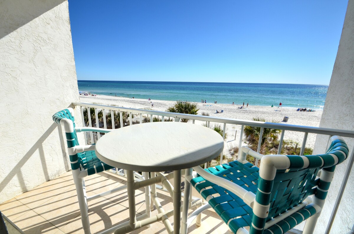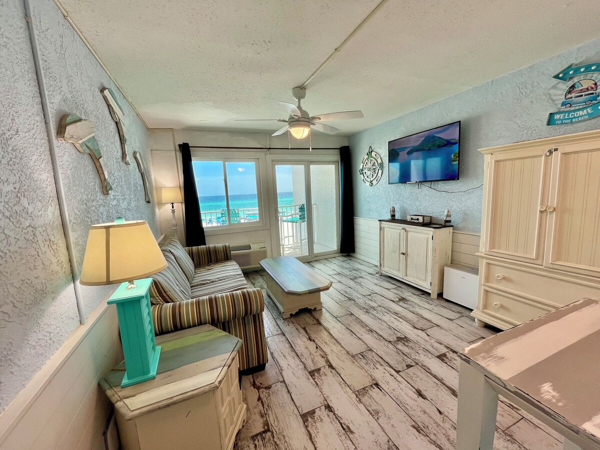 Beautiful remodeled gulf front condo (2nd floor) within walking distance to Pier Park and Top Golf! Dog friendly! (Small grass dog area on site to the right of the building - 70 lbs or less approx. Check dog fee box on VRBO.) 2 beach loungers/1 umbrella provided 3/15-10/31! Stunning kitchen features granite countertops & tile aqua backsplash. Cute dining table & coffee table. Master bedroom has a king bed & 55 inch Smart HDTV. Queen Sunbrella sleeper sofa & 2nd HDTV in living room. Distressed plank tile flooring & eclectic coastal décor throughout. Amazing gulf, pool, & sunset views from your balcony & living room. Walk to Pier Park, Shuckums, Gulf World, Sharkys, Diegos, & the dog beach at Pier Park entrance. 5 minute drive to Frank Brown Park for Gulf Coast Jam. Small complex so no elevators or complicated parking. Hot tub, patio, beach shower, & charcoal grills onsite. We also own 2 adjacent units (VRBO 1817520, 2381370) and a first floor unit (3262642).