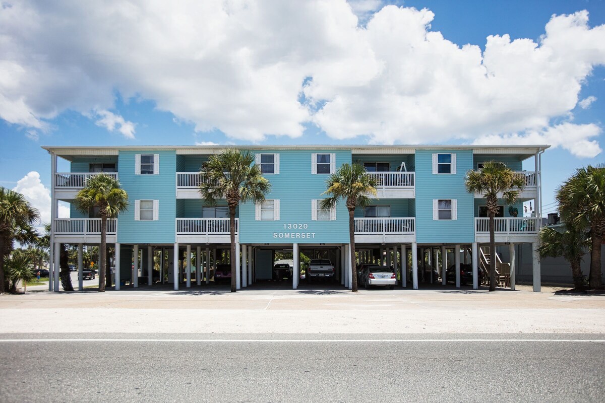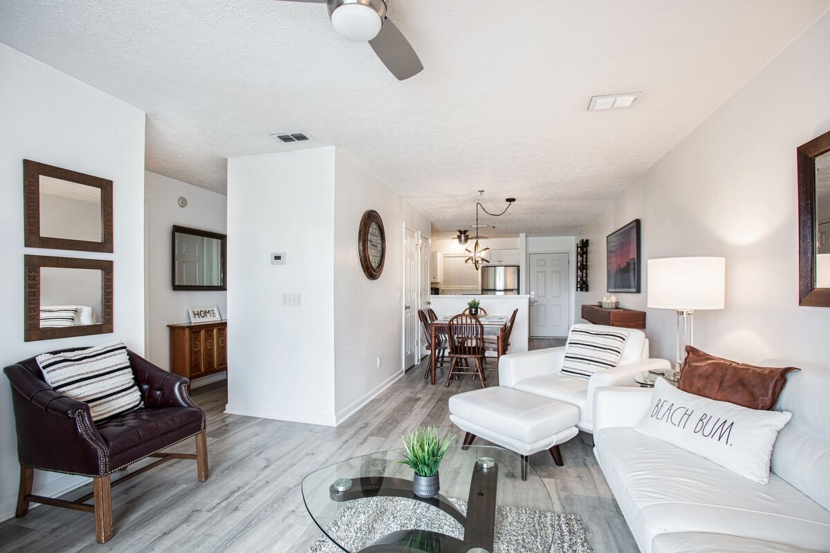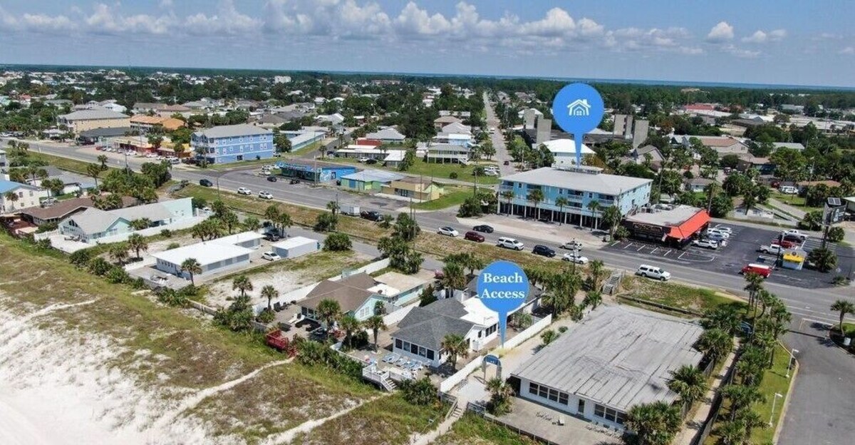 Why do we call our home “The Hidden Gem”? We are a condo community like none other in PCB! Only 16 privately owned homes! You wake up, walk down one flight of stairs and you are at the beach access directly across the street! Located in a residential neighborhood with public beach access in between beautiful beach front homes. No high-rise condo crowds, no trying to find beach parking! Three covered designated parking spaces right at the staircase and across street from the beach. “Owner also owns a single family home VRBO# 953503 which is one block away (2 minute walk) from this property which will sleep an additional 11 people if you have a large group! Sleep a total of 17! Walk next door to “The Salty Goat” for the most delicious food and drinks only locals know about! Or walk to “The Pour” for the best cup of coffee and breakfast sandwiches on the beach! Convenience stores, beach shops and ice cream shop all just steps away! Keep walking a few more blocks to the County Pier!! Only 2 miles to Pier Park, Target & Publix! In the heart of it all without all the commercial fuss. We are also Pet Friendly! Pet fee $125.00 So much detail was put into our condo to make you feel comfortable after a long day at the beach! Our entire condo community was fully renovated after Hurricane Michael in 2018! Our home was recently renovated with brand new luxury plank flooring throughout. Brand New Quartz countertops, New large deep kitchen sink and new faucet with sprayer. New paint, LG stainless steel appliances including stackable large washer/dryer. New bathroom renovation with shiplap, tub & custom antique vanity. Living room sofa and chairs are high grade soft leather. All beds feature new comfort mattresses, luxury sheets and bedding. Enjoy a large spacious balcony with seating. Entire home features high speed Xfinity WIFI/premium cable channels! The Living Space: 55\ ,