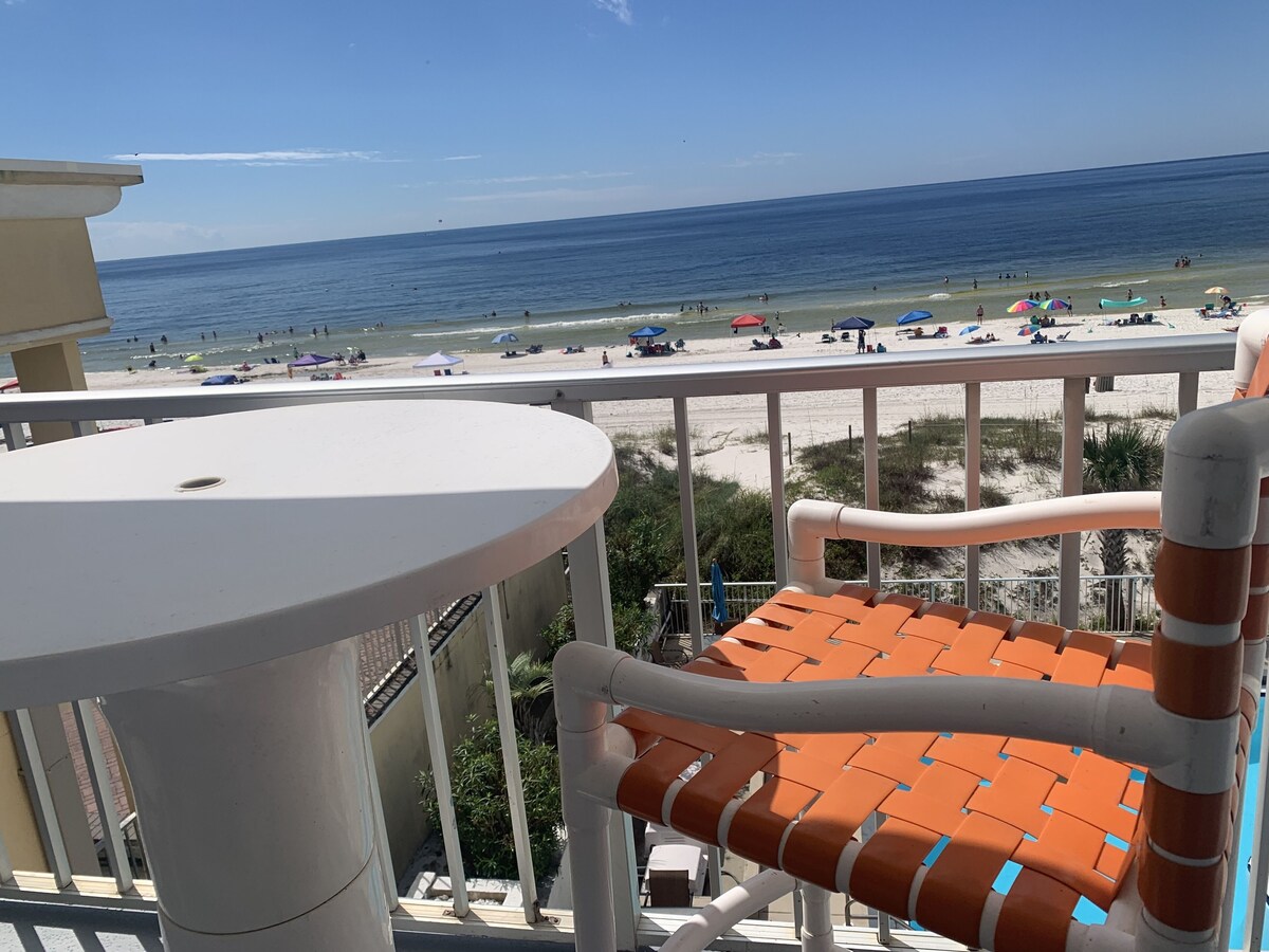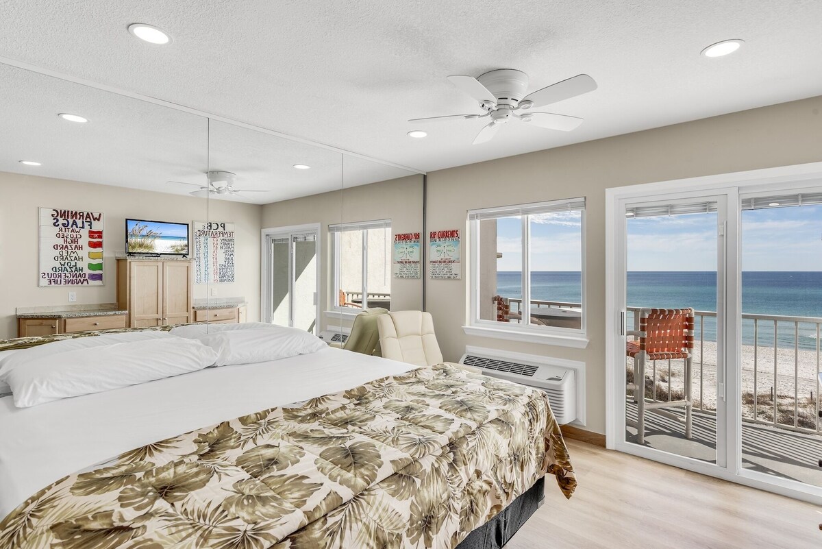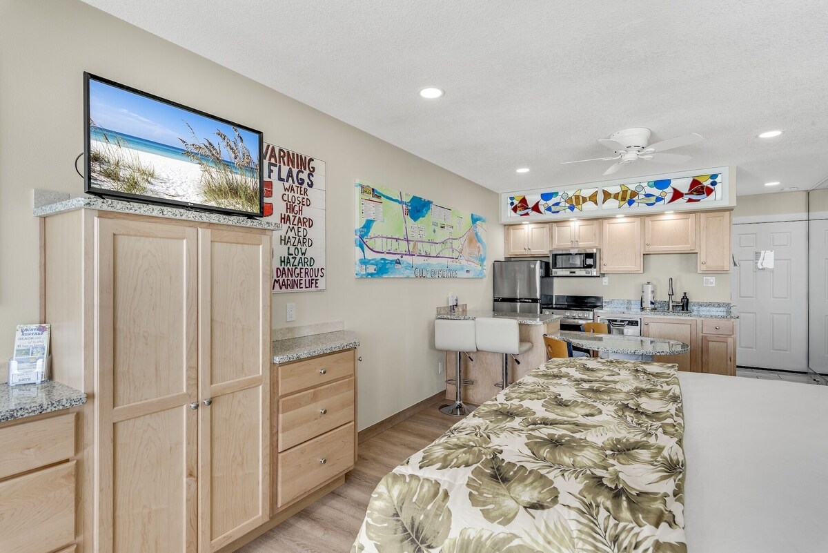 Pet Friendly Beach Front Super Studio at Ambassador Condos two floors off parking lot Granite/mirrors Galore Complete Stainless Kitchen Wood/tile Floors NO CARPET two Blocks East Pier Park across from Shuckums Oyster Bar ELEGANT Recess Lights/Fans No Elevator and Pet Friendly two pets Our prices include all fees. No hidden fees.