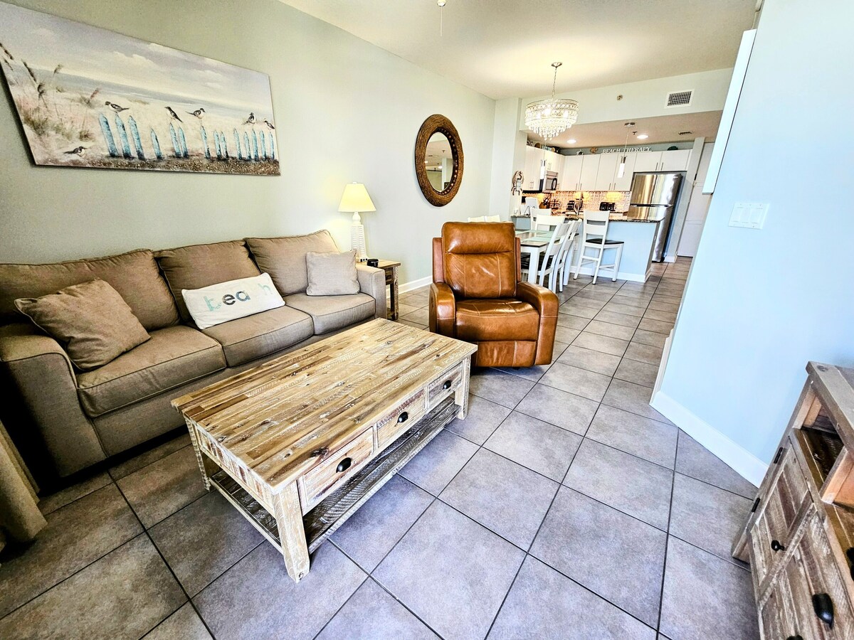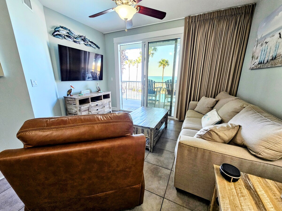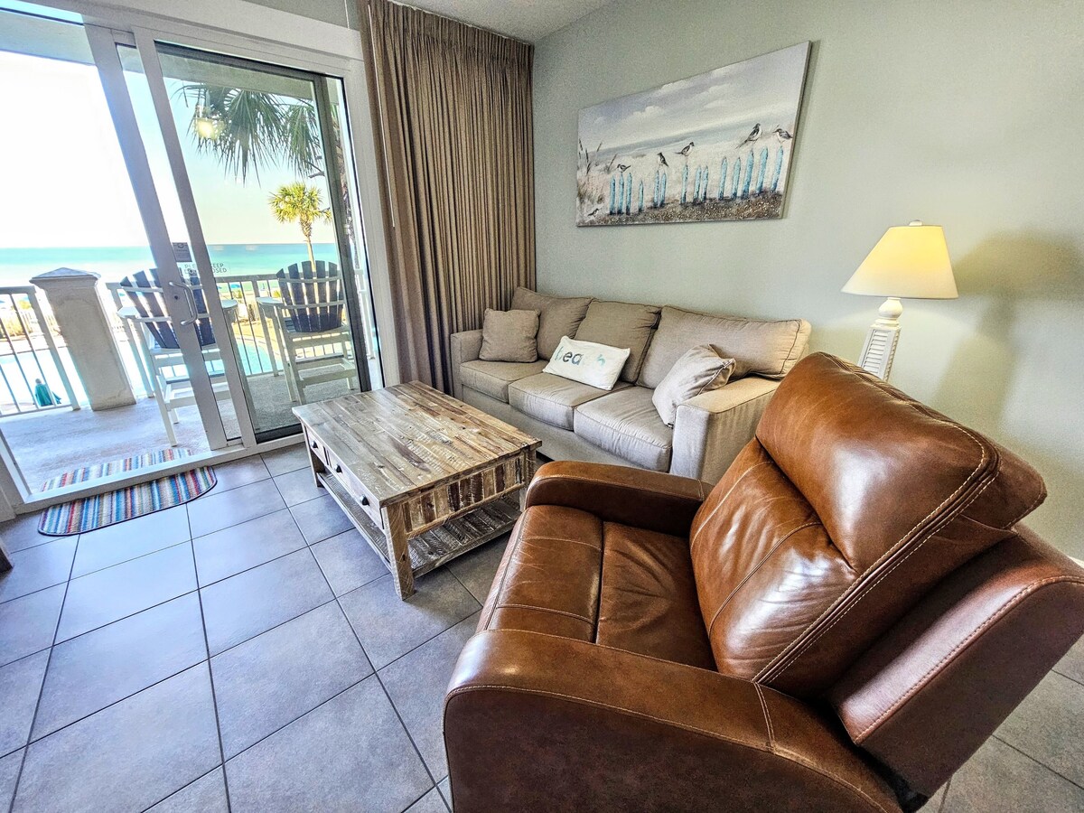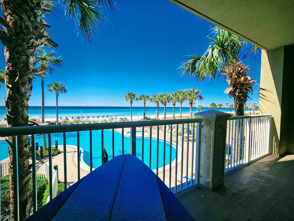 Commanding views of the Emerald Coast! This luxury beachfront unit has 2 bedrooms, 2 baths, and a full size bed in the hallway nook area. It sleeps 8 comfortably. This 2nd-floor condo overlooks Grand Panama's beautiful pool and hot tub and has unobstructed views. Enjoy the roaring ocean (Gulf) while relaxing on the balcony. Why wait for the elevator? This unit is adjacent to the stairwell. Just one flight of stairs is all that it takes to be enjoying the amenities! The quick and easy access to the unit is perfect for pet owners ($100 fee. See additional pet policy & only under 25 lbs). This is one of the very few beachfront resorts that allows pets. Enjoy making your own smoothies or daiquiris with the provided blender. Get a fresh start in the morning with a hot cup of Joe and spoil your family with a homemade breakfast, using our included appliances. The kitchen is equipped with all the necessary items to make your own home-cooked meals. The Gulf front master bedroom boasts a king-size bed with views of the Gulf of Mexico and has its own private access to the patio balcony. Enjoy movies in bed on the room's flat-screen TV. The master bathroom includes a soaker garden tub and a walk-in shower. You will find a queen size bed with private access to the hall bathroom in the 2nd bedroom. A full size bed is located in the hallway nook area. After a long day at the beach, relax in the living room on the unit's sofa sleeper couch or recliner while watching shows on the massive 65\ ,