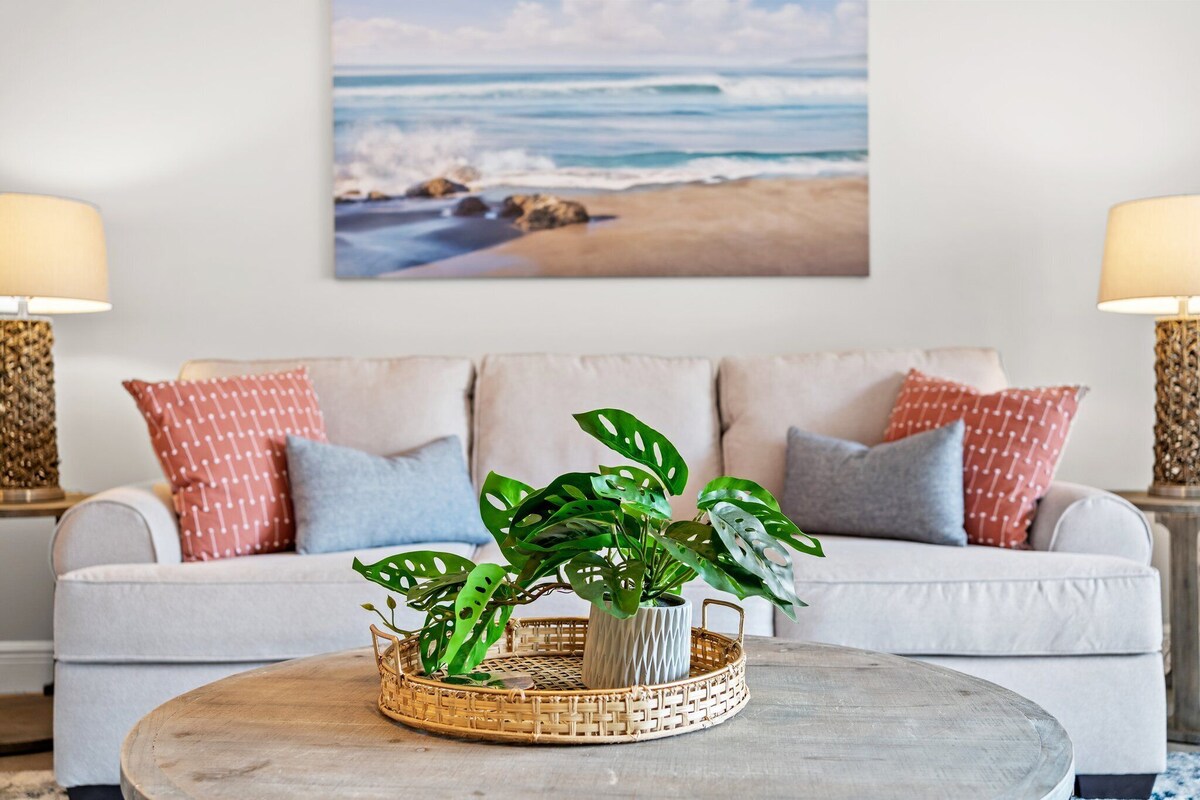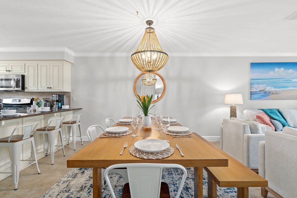With 2 bedrooms and 2.5 bathrooms, our townhome can accommodate up to 6 guests--and pets on a case-by-case basis. The fully equipped kitchen, complete with all the necessary appliances and cookware, is perfect for cooking up a delicious meal. The living room has comfortable seating, a game table and 75\