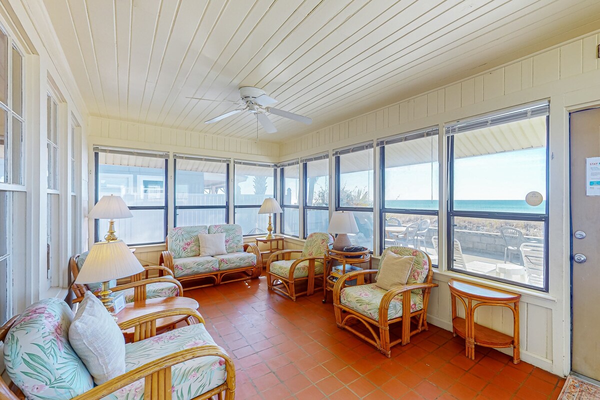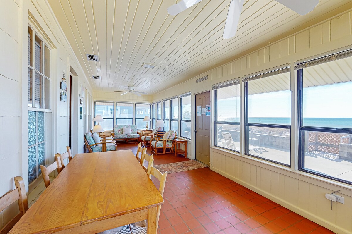 O'Grady's Full Sunset Our calendar is updated in real-time & our nightly rates are accurately displayed. Simply enter your desired dates and click 'Book Now!' You can’t beat the location at O’Grady’s Full Sunset, a large retreat set on a street with a row of private homes on the beach in the heart of Panama City Beach. With six bedrooms, four full baths and one half bath, a large sun porch, and spacious living/dining room – and a front patio overlooking the beautiful Gulf of Mexico – it’s a favorite for big families or groups. Terrazzo floors span the interior, which offers lots of cozy nooks to gather. The large, full kitchen features two refrigerators, lots of counter space and all the gadgets you need to feed the whole crew. When it’s time to eat, two separate dining tables – one in the sunroom and one in the dining area – each seat eight. Head out to explore that squeaky white sand and emerald water right at your doorstep, and rinse off with the convenient outdoor shower before heading back inside. At night, take your pick of five TVs to stream your favorite shows while you relax in the central AC. At bedtime, you’ve got six rooms to choose from: three offer a queen; one has two queens; one features a twin and a queen; and the kids will love the room with five twins and a queen. Before bed, take an evening stroll on the sand – it’s right there – and toast your good luck at booking the perfect beach getaway. THINGS TO KNOW Free high-speed WiFi Streaming is available with guest accounts Snowbird-friendly, contact Vacasa for details If you are bringing a dog on your trip, the pet fee is already included in your quote when selecting ‘Yes’ to pets. If you would like to add more dogs, please contact us. Parking notes: There is free parking available for 6 vehicles. Damage waiver: The total cost of your reservation for this Property includes a nightly damage waiver fee, plus tax if applicable (the “Damage Waiver”). (A discount may be applied for stays of 28 nights or longer, if permitted.) The Damage Waiver covers you for up to $3,000 of accidental damage to the Property or its contents (such as furniture, fixtures, and appliances) as long as you report the incident to the host prior to checking out. The Damage Waiver fee eliminates the need for a traditional security deposit. More information can be downloaded from the \ on the checkout page. Due to local laws or HOA requirements, guests must be at least 25 years of age to book. Guests under 25 must be accompanied by a parent or legal guardian for the duration of the reservation. Our prices include all fees. No hidden fees.