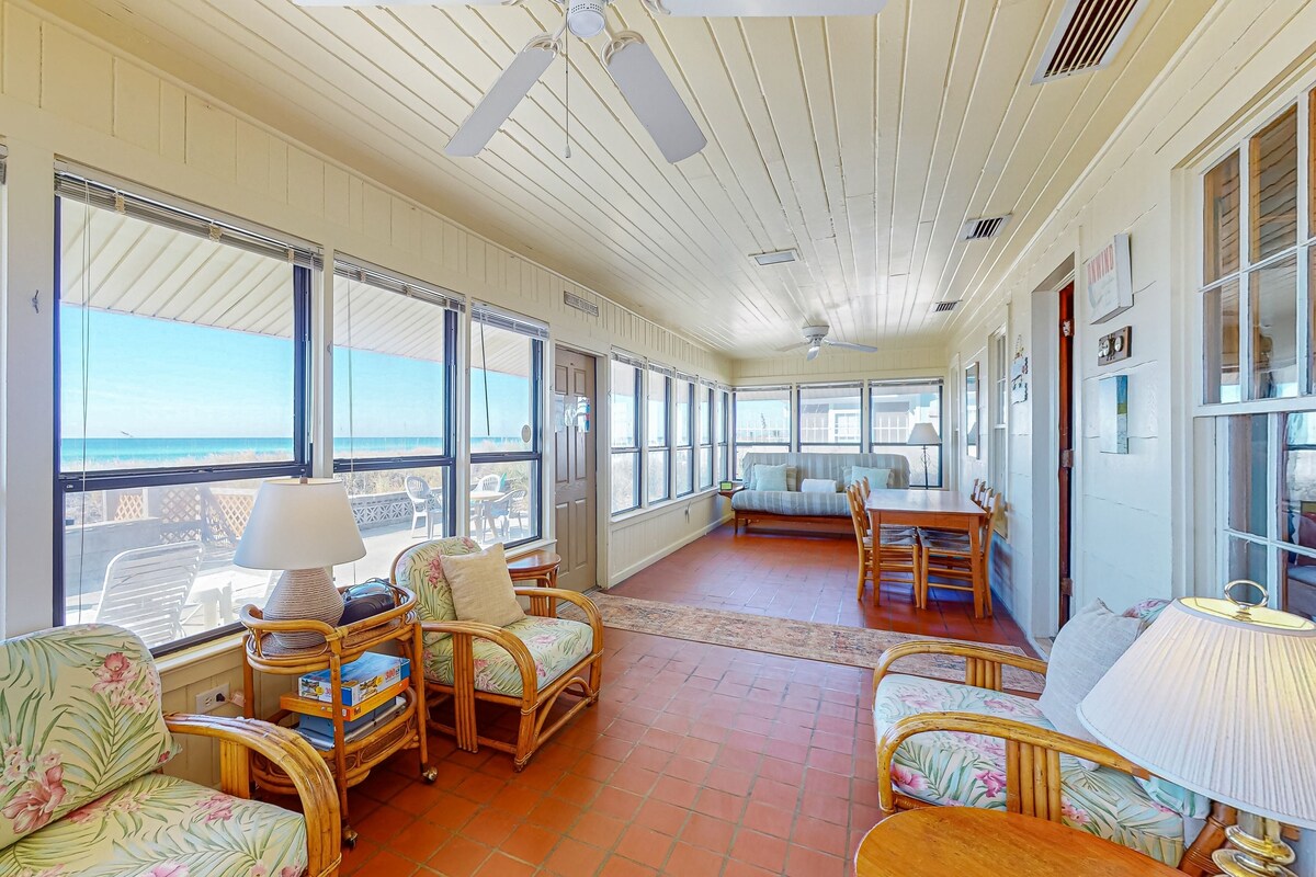 O'Grady's Main Sail Our calendar is updated in real-time & our nightly rates are accurately displayed. Simply enter your desired dates and click 'Book Now!' It's all about the location at O'Grady's! This getaway is set on a street with a row of private homes on the beach in the heart of Panama City Beach. The home features four bedrooms, three bathrooms, a large sun porch, and spacious living/dining room. With a front patio overlooking the beautiful Gulf of Mexico, it’s a favorite for big families or groups. Terrazzo floors span the interior, which offers lots of cozy nooks to gather. The large, full kitchen features two refrigerators, lots of counter space and all the gadgets you need to feed the whole crew. Head out to explore that squeaky white sand and emerald water right at your doorstep, and rinse off with the convenient outdoor shower before heading back inside. At night, stream your favorite shows while you relax in the central AC. Before you turn in, take an evening stroll on the sand – it’s right there – and toast your good luck at booking the perfect beach getaway. THINGS TO KNOW Free high-speed WiFi Streaming available with guest accounts If you are bringing a dog on your trip, the pet fee is already included in your quote when selecting ‘Yes’ to pets. If you would like to add more dogs, please contact us. Parking notes: There is free parking available for 6 vehicles. Security camera details: ring door bell Damage waiver: The total cost of your reservation for this Property includes a nightly damage waiver fee, plus tax if applicable (the “Damage Waiver”). (A discount may be applied for stays of 28 nights or longer, if permitted.) The Damage Waiver covers you for up to $3,000 of accidental damage to the Property or its contents (such as furniture, fixtures, and appliances) as long as you report the incident to the host prior to checking out. The Damage Waiver fee eliminates the need for a traditional security deposit. More information can be downloaded from the \ on the checkout page. Due to local laws or HOA requirements, guests must be at least 25 years of age to book. Guests under 25 must be accompanied by a parent or legal guardian for the duration of the reservation. Our prices include all fees. No hidden fees.