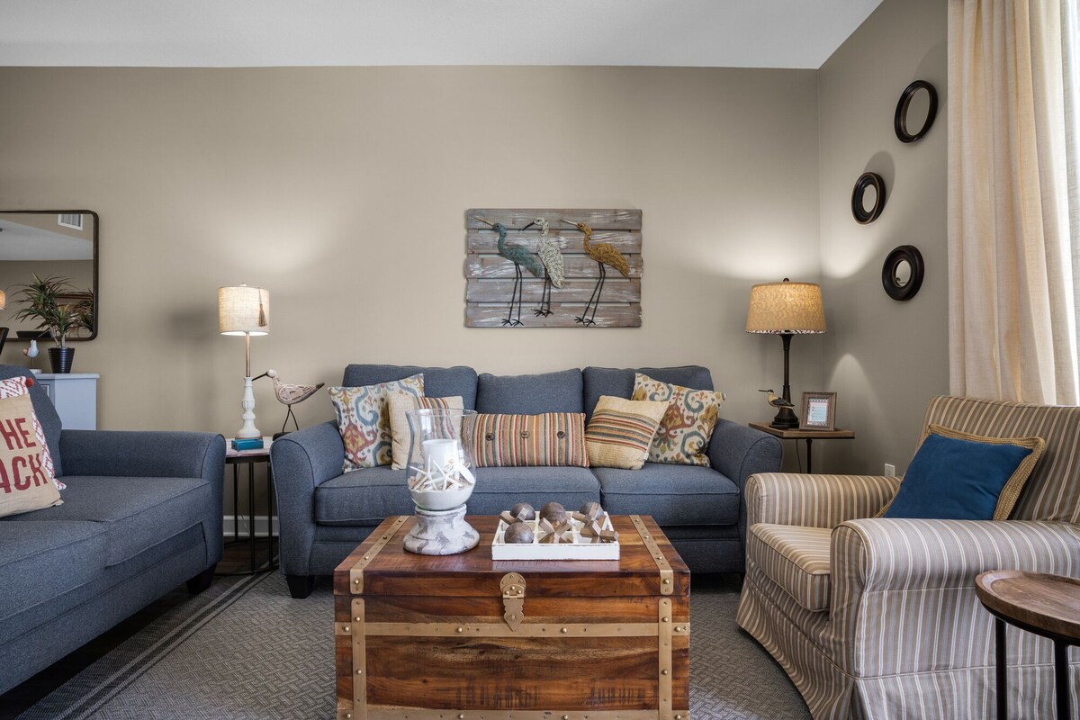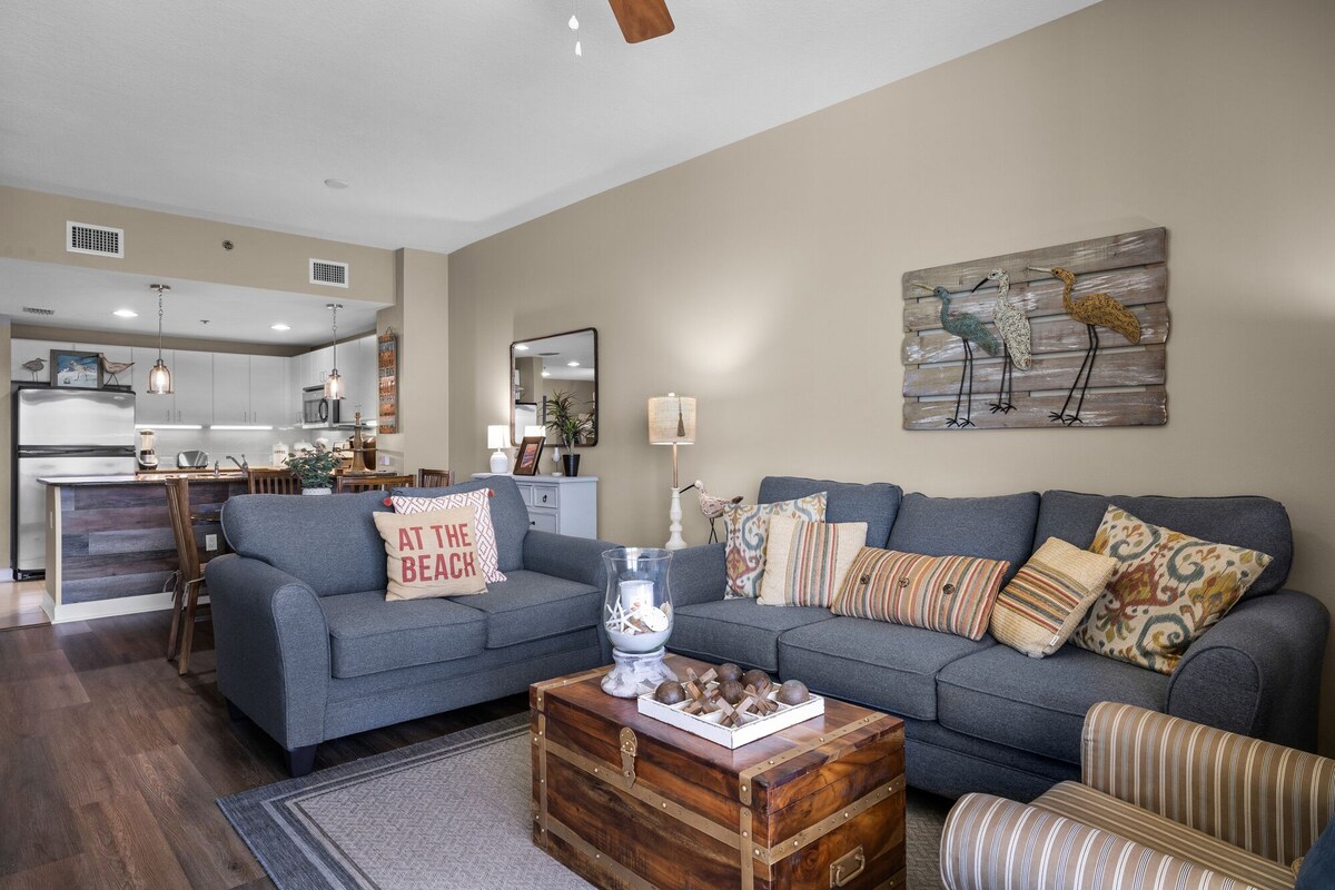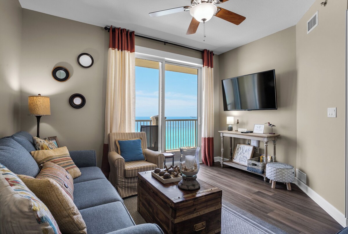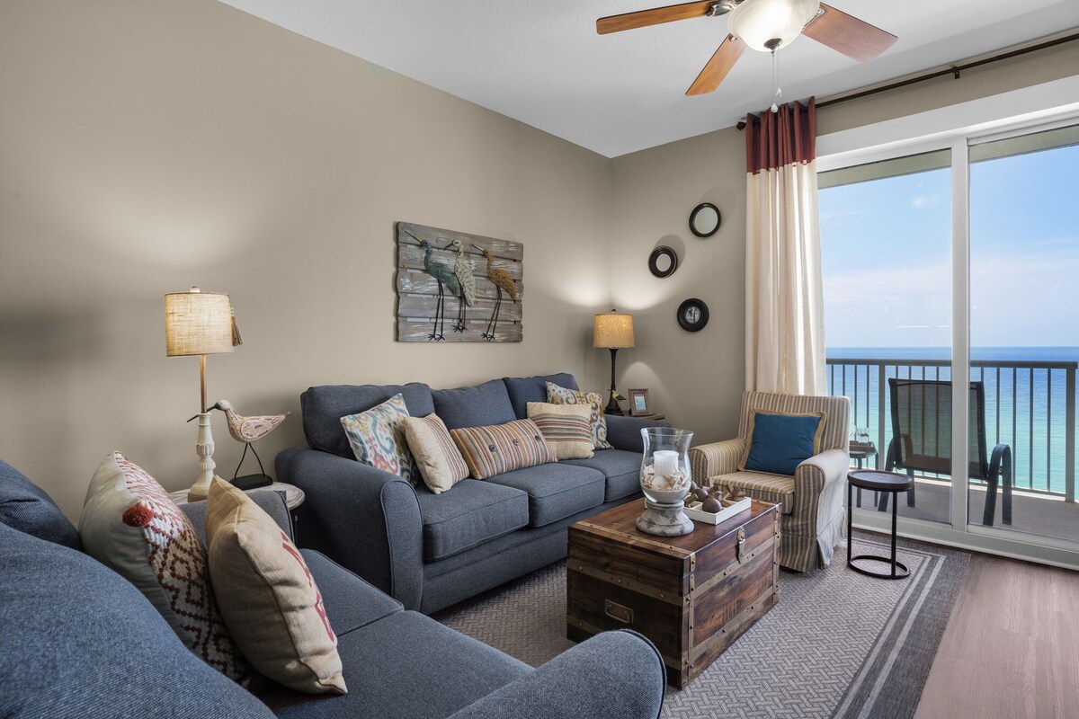 Welcome to our 13th floor oceanfront condo, aptly named the Salty Sandpiper, at Grand Panama Beach Resort Tower 1 condo 1305! Let's start with the bedding arrangements: 1 King, 1 Queen, and a Twin Bunk. That’s room for 8! Starting Sept 1st 2024 the resort will require a $20 fee to bring your pet. Top reasons to book this unit, the Salty Sandpiper, over others! *Beach service included during season *Gulf Front *Oversized balcony with shared access from living room and master bedroom *Privacy nook to/from the master bedroom balcony access *Amazing aerial views *New furnishings *Pet Friendly for dogs must be 25 lbs or under (extra fee applies) very strict policy The Salty Sandpiper features: *Living room has seating for 5 with a smart TV, also with a Brand New Queen Sleeper Sofa! *Dining area with kitchen table and bar seating *Fully equipped kitchen with Keurig, crock pot, and air fryer *Master bedroom with king bed and smart TV *Master En Suite with walk in shower and stand-alone tub and hair dryer *Second master with a queen bed with smart TV *Second master bath with a tub/shower combo *Kid friendly bunk area in hallway *Stackable washer and dryer *Closet with beach gear *Portable fan in case you need one *Free Wi-fi Grand Panama Resort: * Over 650 feet of beach on the Gulf of Mexico *Luxury resort with 24-hour security *2 pools, kiddie pool, and 2 hot tubs (1 pool heated during season) *Seasonal tiki bar *State of the art fitness center *Covered parking with sky walk to tower 1 *Grills What makes Panama City Beach special: *27 mile stretch of sugar-white sand beaches and clear, emerald waters of the Gulf of Mexico. *Lots of attractions from pirate ships and animal parks to go-carts and giant slingshots, see some oddities at Ripley’s Believe It or Not, float away at Shipwreck Island Water Park, or swim with the dolphins at Gulf World *Pier Park shopping and dining Note: Guests must register with the resort for parking passes and pool bands. The registration fee is $55 . This fee includes up to (1) one parking pass and armbands for each member of your party an extra pass is $35. Motorcycle parking is available at $55 per motorcycle. Adults and children 13 years of age and older are required to wear armbands while on property. Your 25 lb. dog is welcome to come along. There is a $200 non-refundable pet fee when you bring your pet along. You must be at least 25 years of age to rent this property. During Spring Break, the minimum acceptable ratio is one (1) person 25 years of age for every two (2) persons under 25 years of age. We provide a starter pack of amenities and bed and bath linens. You will need to bring your own beach towels and replenish amenities if needed. Parking passes and armbands will be available upon guest check-in within the Tower II lobby at the Owner Services desk. Our prices include all fees. No hidden fees.