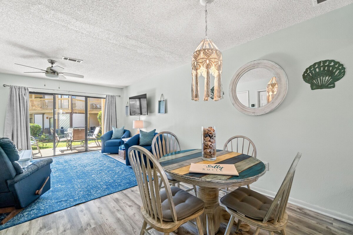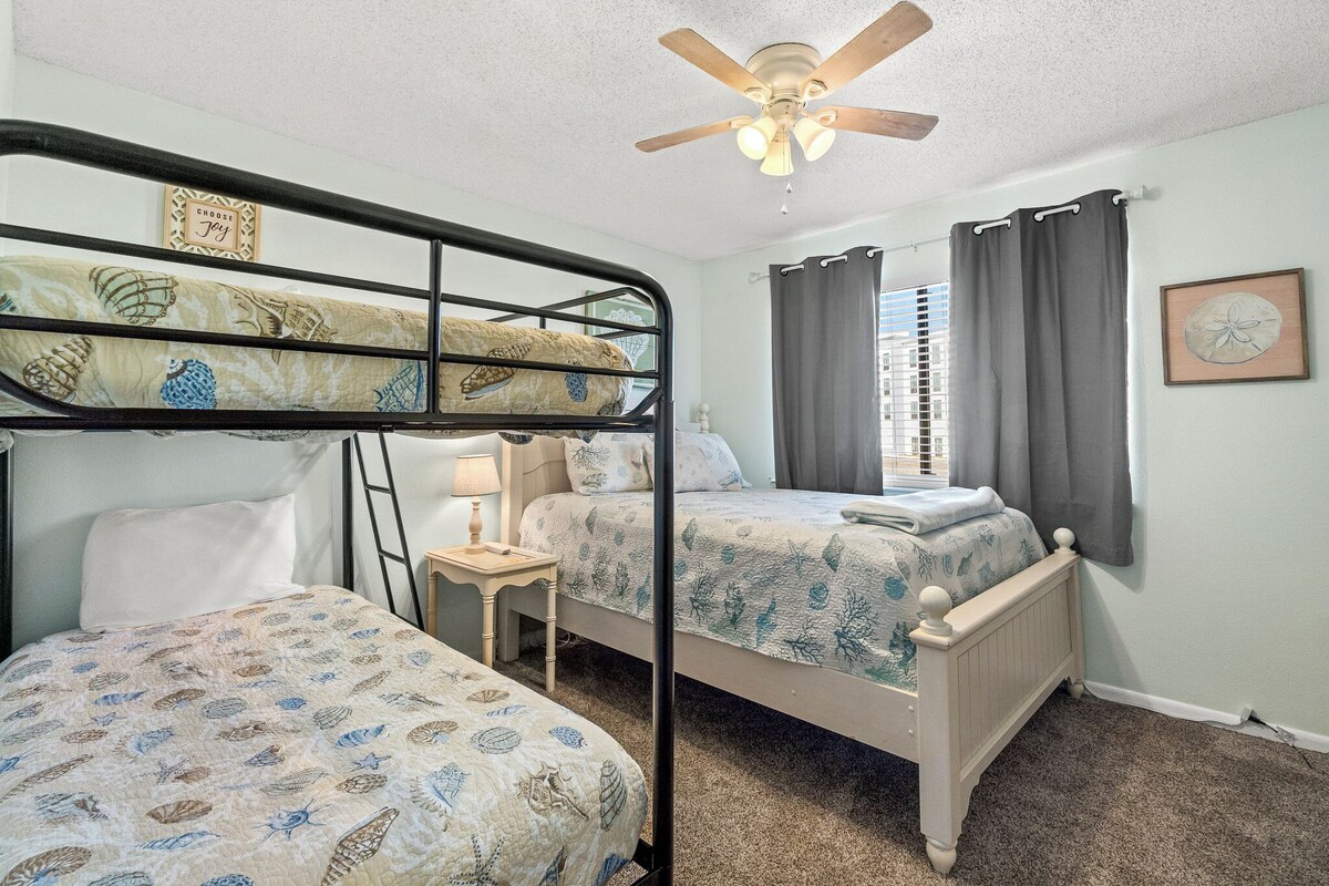 The Salty Suite Quick Notes: - Book 4 or more nights - FREE Parking & Resort Pool Passes - Direct communication with owner on VRBO, not a third party host - King bed, queen bed, and 2 twin beds - Rooms have comfy sheets, pillows, ceiling fans, floor fans, black out curtains - Short walk to the beach or 1 minute drive to the front of the resort to simply just cross the street to be at the beach - Fully stocked kitchen including a coffee bar with plenty of coffee pods, cream, sugar, and sweetener substitute - Three pools and a hot tub at the resort! - For your use we provide - beach towels, chairs, umbrellas, beach toys, and -more! - We put together a place that had all our families favorites from different past vacations to make your stay enjoyable from booking to the beach! The Salty Suite is a family and pet-friendly townhome in the Portside Resort located on the quiet west end beaches of Panama City Beach, FL. Our unit is at the back of the resort and has very little through traffic making it the perfect place for a peaceful getaway and safe for kids and pets. Wake up and draw back the black out curtains to see the Florida sunshine shining through the glass doors in the master bedroom. Then enjoy your morning coffee lounging on the cozy furniture on the second floor patio. Pack up the family for a short drive or walk to the beautiful white sand and clear waters of Panama City Beach. We provide beach towels, chairs, umbrellas and other beach essentials so you're ready to hit the surf as soon as you arrive. Our beach access, is generally much less crowded than other parts of the beach, so you will have plenty of room to spread out your towels, soak up the sun and build a big sand castle. There are plenty of places nearby where you can rent a golf cart so you can keep your car nice and clean for your trips to the beach. Or drive down to pier park for shopping galore and a ferris wheel ride! Bring your pooch along to enjoy the designated dog beach. After you wash off the sand from a relaxing day at the beach, enjoy drying off with our soft luxury extra large bath towels. Back at the resort, enjoy the two beautiful pools with waterfalls, a hot tub and fitness center free for your use during your stay. The pools are open until 11:00 pm and lit after dark. The back pool is heated during the winter. If it rains, we have board games to play inside, two vizio smart tvs with all the streaming apps connected to high-speed internet or check out the Dave & Buster’s right down the street. The kitchen is fully equipped to make meals at home if you don’t feel like going out to one of the many delicious restaurants in the area, and the in-unit washer and dryer make laundry a breeze if you are there for a longer stay. We even provide a pack and play, booster seat, baby gate, and toilet seat reducer for your little ones so you don’t have to lug them along on your trip (we know the struggle)! If you bring your fur babies along for the trip, we have bowls and a crate available for your use as well. Sleeping arrangements: The master bedroom has a king size bed with custom headboard featuring a memory foam mattress and luxury lightweight bamboo sheets. The second bedroom has a queen size bed and twin size bunk bed with 2 bunks featuring cool 100% cotton 300 thread count sheets. Weight limit is 200 pounds for the top bunk and 250 for the bottom. Parking notes: There is one designated parking spot available directly in front of the unit and plenty of visitor parking if you have an additional vehicle (up to 2 allowed). You must stop at the front office on your way in to get your parking pass and entrance codes and wristbands for the pool and fitness center. If the office is closed, there is an on site security guard available to assist. Parking passes are $20 each. Pet policy: 2 dogs max allowed per visit. Dogs must be in a crate if they are left alone in the house. Non-refundable fee is $50 per pet per trip. Watch our video tour on youtube: The Salty Suite tour, vacation rental in Panama City Beach, FL Our prices include all fees. No hidden fees.