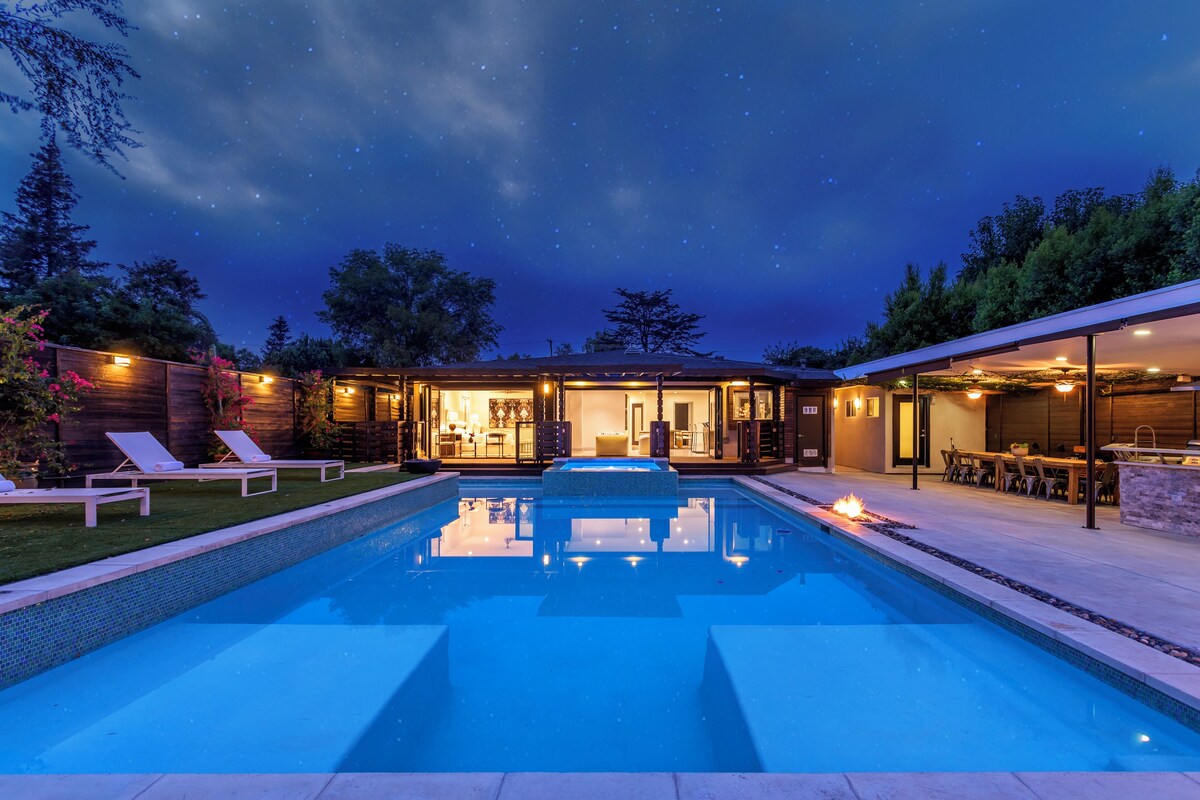 ONE of a kind modern compound for resort style living. Entertainer's paradise on 20k sq/ft private lot. 3 separate houses + vintage trailer on one property, & it's all yours! ✰Huge hotel size pool, jacuzzi, BBQ, fire pits, zen garden, parking, pool table, bird scooters, & gym! ✰ House 1- 4BR/5BA full kitchen, living room, laundry, dining room House 2- 3 BR/3BA full kitchen, living room, laundry, projector House 3- Studio w/ full bath + VINTAGE TRAILER w/ Queen & bunks *perfect for weddings* The space ฅ(⌯͒• ɪ •⌯͒)ฅ This entertainer's paradise consists of: ✰ House 1- (4 BR/4.5 BA) with an open floor plan, kitchen that merges into the dining area, and two living room areas with great indoor/outdoor flow. ✰ House 2- On the back wing of the property, you will find a 3000 sq/ft, 3 BR/3BA second house with its own full kitchen, living room, laundry room and 2 large suites with a beautiful view of the private landscaped zen garden. All 3 bedrooms in this home have their own private entrances. ✰ House 3- to the side of the pool, you'll find a bachelor studio apartment with full bathroom, mini fridge, smart TV, tempurpedic mattress, and desk ✰ JUST ADDED - beautifully renovated 24’ **vintage trailer** •Sleeps 2-4. One queen bed in main bedroom & two bunk beds off the kitchen. (bunks best suited for kids!) ✰As you step out of either house, you will find a fully decked pool area with multiple fire pits, fountains, grilling area, and a sunken seating area for entertaining under strung twinkle lights surrounding a spacious pool & spa. ✰Pool is HUGE with two Baja ledges and a tanning shelf. ✰Property sits on an 20k+ sq/ft flat lot on a beautiful tree-lined street ✰Garden has a walking path, spacious grass area, mojito garden, fruit trees, and an additional fire pit sitting at the back of the lot. ✰Folding glass doors in both main houses provide complete indoor outdoor living experience. AMENITIES ˓˓ก₍⸍⸌̣ʷ̣̫⸍̣⸌₎ค˒˒ ✰✰✰✰✰✰✰✰✰✰✰ ◦ Heated pool & hot tub off of main house ◦ complete BBQ grill area with fridge, sink, & outside bar seating ◦ Tons of outdoor seating & sun loungers ◦ Pool table, corn hole, giant jenga, beer pong, etc. ◦ Fully stocked board game closet ◦ Gas fire pits ◦ Easy on-site gated parking for 8+ cars ◦ Tons of unregulated street parking ◦ Pets allowed with extra conditions (listed below) ◦ Air conditioning & heat ◦ Laundry in both houses ◦ Wifi throughout all indoor and outdoor spaces ◦ All TVs are smart TVs with apps logged in ◦ Cribs, pet beds, and pretty much anything you can think of available upon request (additional fees may apply) MAIN HOUSE ✰✰✰✰✰✰✰✰✰✰✰ ◦ Bedroom 1: California King bed with en-suite bathroom with pool views from bed. Jacuzzi tub, extra large shower with 6 different water features, dual vanity, bidet, and walk in closet. Bedroom opens to patio with pool view. Blackout shades for the best nights sleep (✿◡‿◡ฺ)zzz ◦ Bedroom 2: California vibes, Tempurpedic Queen bed, ensuite full bathroom with shower ◦ Bedroom 3: Music Memorabilia themed, Tempurpedic Queen bed, ensuite full bathroom with shower & bathtub ◦ Bedroom 4: Office with daybed, ensuite full bathroom with shower & bathtub ◦ Kitchen with bar seating and stainless steel appliances, Nespresso machine, separate living area, kitchen sink overlooks pool area ◦ Dining area with view of pool ◦ Living room with cloud couch, large patio with pool views, smart TVs, fire features BACK HOUSE ✰✰✰✰✰✰✰✰✰ ◦ Bedroom 1: King bed with ensuite bathroom & private entrance ◦Bedroom 2: Cal King bed, sitting area with sofa, and two sets of French doors to the back garden. This room is quite large, it used to be two bedrooms! ◦ Bedroom 3: Queen bed with bathroom next door, private entrance ◦ Fire pit ◦ Full kitchen ◦ Washer/dryer ◦ Movie projector in living room STUDIO HOUSE ✰✰✰✰✰✰✰✰✰ ◦ Queen sized tempurpedic bed ◦ Private entrance ◦ Complete bathroom with shower ◦ Smart TV ◦ Desk ◦ Closet ◦ Mini fridge (stocked and everything is free!) GYM ✰✰✰✰✰✰✰✰✰✰✰ ◦ Garage has been converted into a gym ◦ Gym includes- ◦ interactive commercial Nordic Track treadmill & rower ◦ full weight bench and squat bar ◦ Nordictrac smart workout mirror ◦ heated inversion table ◦ mats, bands, medicine balls, etc (ᵒ̤̑ ₀̑ ᵒ̤̑)wow!*✰ We *do* allow weddings! ◦ Choose from 3 different THEMES for your stay! 1. Family Fun theme w/ colorful fun pool floats, yard games, & more! 2. Classic California theme w/ palm leaf & flower floats + a bottle of rose! 3. Minimalist theme w/ 0 pool floats and most additional decor tucked away if you have another theme in mind we can certainly accommodate with enough advance notice. *Additional charges may apply Guest access (☞ ͡° ͜ʖ ͡°)☞ Guests have access to all areas! Other things to note- we offer a full concierge service for literally anything you need, don't hesitate to ask! nothing is too big or small for us to handle. (additional charges do apply) Licence number HSR20-001244 Our prices include all fees. No hidden fees.