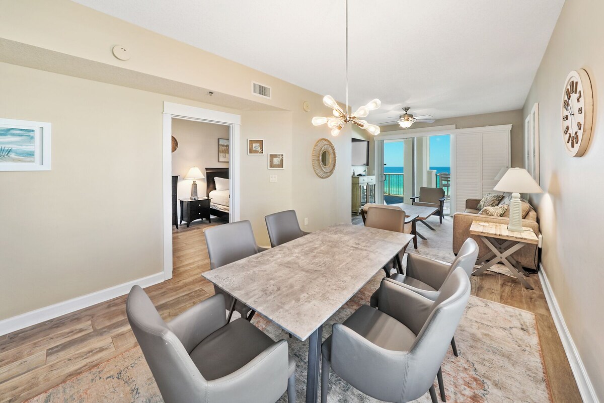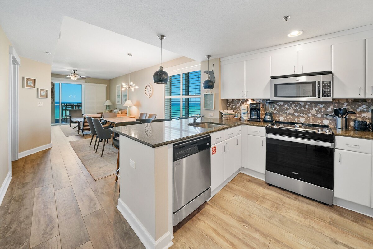 Warren Beach Rentals is proud to represent Grand Panama Resort 501 This Elegantly remodeled 3 Bedroom is a corner unit on the west end of the gulf front tower with incredible views that defy description and features the largest outdoor living area in the resort. It offers the huge convenience of being on the walkover level from the parking garage to the building. Just walk right across into your condo with no additional elevator. The unit offers a large Gulf front master with king bed and ensuite bath that spills out onto the spacious outdoor veranda. Views are endless thanks to the floor to ceiling glass. The living area has direct access to the balcony and views of the beach, sunsets, coastline and crystal clear sparkling water of the gulf from every angle. The living, dining, and kitchen areas are surrounded by windows which bathe the area in natural light. This is exclusive to corner units only. The living area is graced by coastal casual furniture that is functional, elegant and extremely comfortable. Step into the modern kitchen and you will find everything you need. Included are all small appliances and utensils, new frying pans, coffee maker and four slice toaster. Enjoy your morning coffee at the kitchen island or make a full breakfast to enjoy at the separate dining space. There is a NEW, large Smart TV and ample seating making it perfect for movie nights. Step out onto the balcony for dining or simply to relax with sunset cocktails in one of the chairs. The view is AMAZING! The are two additional Guest rooms. Guest Room one has a Queen bed with ample light and a large window with views of the gulf. Guest room two also offers a queen bed and city views. For additional sleeping there is also a Bunk Area with two Twin beds- perfect for the kids! A full size sleeper sofa in included in the living area if needed. A washer and dryer are provided for your convenience. Grab your beach towels and chairs and head out to the beach or enjoy the shade at one of the multiple pools just steps away. Water sports such as sailing, jet skiing, kayaking or parasailing are located nearby. Take a break in one of the many restaurants or head to the Village of Grand Panama to do some shopping located on the North side of the resort. Grand Panama also offers a full fitness center and event space which can accommodate up to 120 people. There is something for everyone at Grand Panama 1-501! Pets (dog only) considered up to 25 lbs with the exception of service pets. There is a $225 plus tax additional pet cost per dog and the pet must be registered in advance through the HOA. Grand Panama is the ONLY pet friendly modern condo on the gulf. Grand Panama HOA additional costs: The resort cost is $55.00 The resort cost includes 1 parking pass and wristbands for everyone in your reservation 13 and older. Wristband replacement is $10.00 Motorcycle parking is $55.00. Trailer Parking is $55.00 (only during bike week). An additional parking pass can be purchased for $35.00 during registration. Only two parking passes are allowed per unit. Guests bringing a pet to a Pet Friendly unit must register the pet in guest registration system. Pet Sleeves are $50.00 per sleeve. Garage Clearance: Main garage 7'6”: Stand alone 2-story garage 9' Please note: Our rentals book weekend to weekend from Memorial Day until the first weekend in August. We also offer monthly rentals in January until Mid March. For stays over 3 weeks, please contact Reservations directly. Must be 25 or older to reserve the condo. No exceptions. No college or high school party groups allowed. No party or event groups (ie. takeover) without express permission. No smoking, vaping, or illicit drug use. At no time should the occupancy exceed the max posted on the site. Our prices include all fees. No hidden fees.