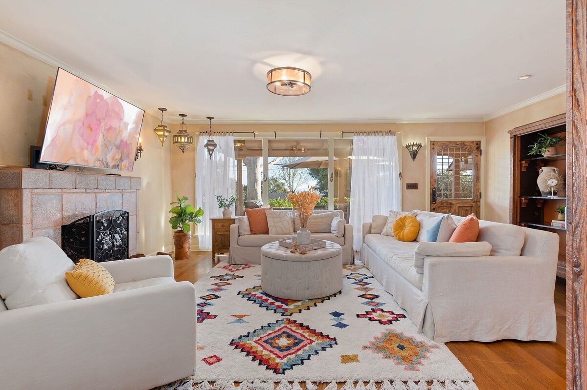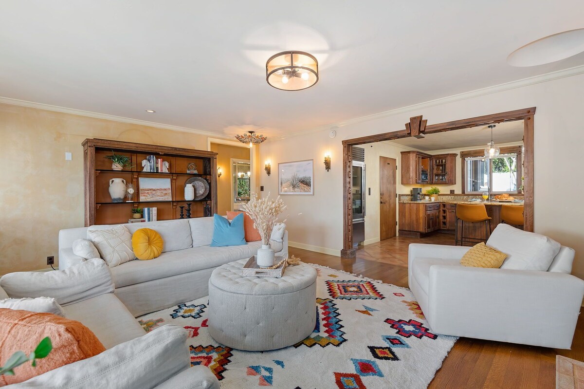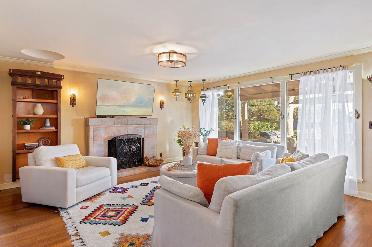 With ocean and mountain views, the home is located on a quiet street in a friendly neighborhood where locals walk, hike, bike, and live, yet it is so close to all that visitors will want to explore. It is a mere 5-minute drive to the heart of downtown State Street or head to the ocean; it too is only minutes away. The home is set up perfectly for dual living with two kitchens, yes, TWO kitchens! Though the home flows beautifully from one space to another as one residence, there is also the option of closing off one area from another to create two separate living spaces, each with its own entrance. Enter the home from the front terrace, where a sectional sofa, barbecue, and a dining table for eight set the scene for entertaining, or just hanging out. Below is a hidden garden with a fire pit as well. Inside, the mood is comfortable and inviting. The unique pendant fixtures, distressed oak floors, and Spanish tile accents throughout the home bring out the intended Santa Barbara style with a unique point of view. The kitchen offers stainless steel appliances, colorful dishes, and plenty of serving pieces. It is anchored by a Viking gas range that sits beneath an inlaid tile mosaic backsplash, continuing the Spanish theme found throughout. Have a casual lunch at the granite peninsula or whip up a batch of salsa and guacamole with fresh ingredients from the Mesa Produce open-air market nearby. Enjoy grazing and tasting samples of local fare at Lazy Acres Market, or grab an espresso at Lighthouse Coffee. In all there are three bedrooms. On the main level are two bedrooms, each with queen-size beds. The south bedroom opens to the front terrace through Fleetwood, stacking glass doors that create an indoor-outdoor sanctuary. The other bedroom features French doors leading to a private back patio; a hall bathroom services the main level with a large glass shower, dual shower heads, a garden-view bay window, and an Italian porcelain sink. From the main kitchen, walk through the laundry corridor, with a front-loading washer and dryer, to the second kitchen and the staircase to the primary suite. This is also where the units can be divided for more autonomy. A banquette in a sunny corner of this efficient kitchen looks out to the raised backyard with turf and cafe table seating. Up the Spanish tile staircase, the primary suite, with a king-size bed, resides solely on the second floor. It is a striking, bright, and private escape. More Fleetwood, stacking doors open to a lengthy terrace with alluring ocean views. Such a lovely place from sunrise to sunset making this a spectacular and perch to begin and end the day. In split-level design, several steps lead down to the sunken primary bathroom. A dramatic, stunning copper bathtub takes center stage; a glass, walk-in shower and a dramatic trough-style sink in a custom vanity complete this luxurious bathroom. As is typical with many Santa Barbara homes, this property does not have AC. Open windows and the use of fans allow ocean breezes in to keep the house cool during hot summer months. Proximity to numerous Santa Barbara attractions makes this property ideal for those seeking to venture out and explore. Walk or bike to Cliff Drive on the Mesa, where numerous locally-owned restaurants with international twists offer everything from vegan fare, locally brewed ale, pizza, tapas... and burgers and fries! It is all there! Shoreline Park, Wilcox Preserve, Cabrillo Boulevard beaches, The Harbor, and Stearn's Wharf all offer superb outdoor fun nearby, or head downtown for shopping, fine dining, and after-hours hot spots! Know anyone graduating from Santa Barbara City College? This is a great spot for visiting family and friends to have a great place to call home for the celebration. No matter the adventure, Skyline Dream is a reality not to be missed. Our prices include all fees. No hidden fees.