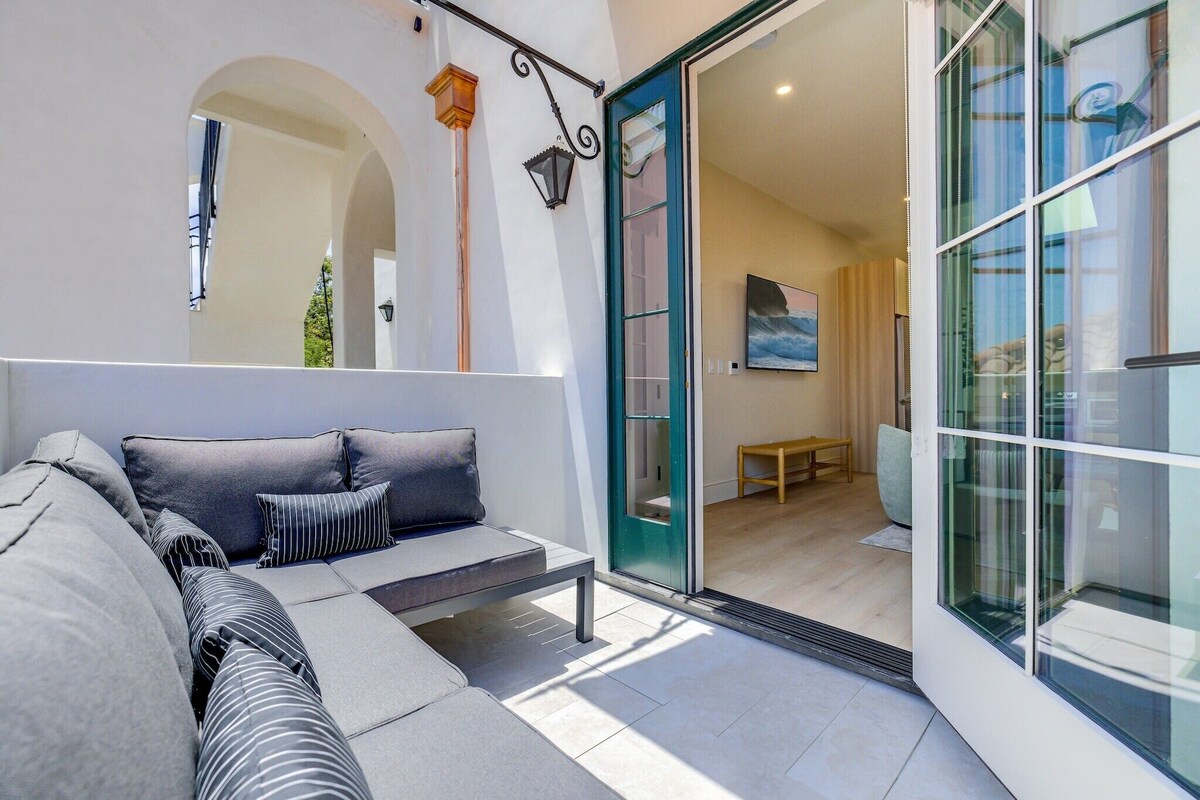 ## Space The unit has been immaculately renovated, with its upstairs exterior access in a multi-unit building only two blocks from downtown Santa Barbara & State Street. This 922 sqft, two-bedroom, two-bathroom, fully equipped apartment features a full kitchen set in a large open space with a living room, a private terrace, a bistro table, and chairs. The primary bedroom has a deluxe en suite bathroom with a deluxe shower. The second bedroom has a queen bed and direct access to a Jack and Jill-style bathroom with a walk-in shower. The bathroom is also accessible from the main living area. This high-end unit includes all amenities to provide a comfortable short or longer stay for up to 6 guests, with two sleeping on the high-quality queen-size pull-out sofa. Adjacent to the kitchen, you will find a laundry room with a brand-new LG washer and dryer stack and ironing amenities. The original Spanish architecture has been preserved while offering modern upgrades & conveniences. Enjoy the stunning communal rooftop terrace with breathtaking mountain views, open for guests between 8 am and 10 pm. The living room offers a 65\ Sony Bravia with features similar to the living room TV. The full kitchen is equipped for all your cooking needs and features a stovetop, oven, dishwasher, microwave, and a Nespresso Vertuo coffee maker. Vertuo pods, as are sugar, sweetener, and coffee creamer, are provided for your stay. Pets are welcome with a small fee per stay. *NO PARTIES: We have a strict 'No Party' policy, and parties or events are prohibited. Quiet hours are enforced from 10 pm to 8 am.* *PETS: ONLY 1 PET ALLOWED (N/A to service animals, applicable to ESA's). A pet fee will apply; pets can not be left unattended in your room. Please add your pet to the reservation, or disclose your pet to our hospitality team after booking. Pets will enjoy fresh water from the SIBAYS pet fountain with filtration system, located next to the ice machine in the covered garage. *LIVING WAGE PLEDGE: Our cleaning fee includes cleaning the unit and outdoor space professionally. As part of The Living Wage Pledge, we are committed to paying our cleaners fairly. A living wage is a minimum income necessary for someone to meet their basic needs and participate in their community.* *SUSTAINABILITY: To support sustainable tourism and reduce our carbon footprint, we provide Public Goods toiletries and green cleaning products.* *BABY / CHILD AMENITIES: Pack n' play and high chair are available and stored in the laundry room of the apartment. ## Access This is a self-serve stay. We provide contactless self-check-in. The doors are all equipped with smart locks, and a unique code matching the last four digits of your phone number on file will be generated and sent to you on check-in day via SMS. There are stairs leading to the unit and no elevator. We do not provide daily cleaning; however, we are happy to refresh rooms for stays longer than five days upon appointment. Please get in touch with our hospitality team to switch out towels or request extra supplies. Parking and EV charging (shared amenities): Casa De La Vina offers free guest parking in its private parking lot and additional parking spots in the covered garage on the right side of the building. One parking spot per unit on a first-come, first-served basis. Free street parking is available if the lots are full. 5 EV chargers are available for guests to use during their stay; logging into the Tesla pay app is needed to charge ($0.30/kW). Casa De La Vina staff does not monitor parking spot use, and we are unable to request guests to move their vehicles. ## Interaction This is a self-serve stay. We are off-site hosts; there is no front desk or office, and we provide contactless self-check-in. We have a dedicated hospitality phone line in case of emergencies (24/7) and our team is available on call, text, or chat from 5 am to 1 am to help assist you during your stay! ## Neighborhood Located within walking distance to nearly all restaurants and retail stores on the State Street corridor, 20+ tasting rooms, 10+ breweries, and countless choices for eating or drinking make this an ideal location for anything that may bring you to the world-renowned Santa Barbara Coast. ## Transit Santa Barbara Transit Center is five blocks away. ## Notes For security, there are cameras on the exterior of the building. This complex does not have live TV service. Instead, all TVs have apps (Netflix, Hulu, YouTube TV, and Amazon Video) for your streaming pleasure. The property has gigabit wifi, and the unit has a private network for guests to cast directly onto the TV. Cancellation policy: Full refunds are available up to 24 hours in advance. A 4% credit card charge is assessed for cancellations made through direct sites and VRBO. Our prices include all fees. No hidden fees.