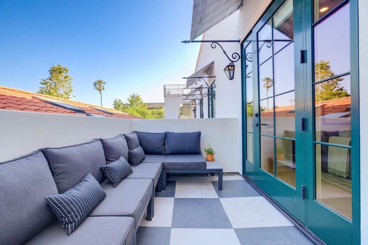 ## Space The unit has been Immaculately renovated, with its upstairs exterior access in a multi-unit building only two blocks from downtown Santa Barbara & State Street. This 922 sqft, two bedroom, and two bathroom, fully equipped apartment features a full kitchen set in a large open space with the living room with a private terrace with a bistro table and chairs. The primary bedroom has a deluxe en suite bathroom with a deluxe bathtub. The second bedroom also features a king bed and has direct access to a Jack and Jill-style bathroom with a walk-in shower. The bathroom is also accessible from the main living area. This high-end unit includes all amenities to provide a comfortable short or longer stay for up to 6 guests, with two sleeping on the high-quality queen-size pull-out sofa. Adjacent to the kitchen is a laundry room with a brand-new LG washer and dryer stack and ironing amenities. The original Spanish architecture has been preserved while offering modern upgrades & conveniences. Enjoy the stunning communal rooftop terrace with breathtaking mountain views, open for guests between 8 am and 10 pm. The living room offers a 65\ Sony Bravia with features similar to the living room TV. The full kitchen is equipped for all your cooking needs and features a stovetop, oven, dishwasher, microwave, and a Nespresso Vertuo coffee maker. Vertuo pods, sugar, sweetener, and coffee creamer are provided for your stay. Pets are welcome with a small fee per stay. *NO PARTIES: We have a strict 'No Party' policy, and parties or events are prohibited. Quiet hours are enforced from 10 pm to 8 am.* *PETS: ONLY 1 PET ALLOWED (N/A to service animals, applicable to ESA's). A pet fee will apply; pets can not be left unattended in your room. Please add your pet to the reservation, or disclose your pet to our hospitality team after booking. Pets will enjoy fresh water from the SIBAYS pet fountain with filtration system, located next to the ice machine in the covered garage. *LIVING WAGE PLEDGE: Our cleaning fee includes cleaning the unit and outdoor space professionally. As part of The Living Wage Pledge, we are committed to paying our cleaners fairly. A living wage is a minimum income necessary for someone to meet their basic needs and participate in their community.* *SUSTAINABILITY: To support sustainable tourism and reduce our carbon footprint, we provide Public Goods toiletries and green cleaning products.* *BABY / CHILD AMENITIES: Pack n' play and high chair are available and stored in the laundry room of the apartment. ## Access This is a self-serve stay. We provide contactless self-check-in. The doors are all equipped with smart locks, and a unique code matching the last four digits of your phone number on file will be generated and sent to you on check-in day via SMS. There are stairs leading to the unit and no elevator. We do not provide daily cleaning; however, we are happy to refresh rooms for stays longer than five days upon appointment. Please get in touch with our hospitality team to switch out towels or request extra supplies. Parking and EV charging (shared amenities): Casa De La Vina offers free guest parking in its private parking lot and additional parking spots in the covered garage on the right side of the building. One parking spot per unit on a first-come, first-served basis. Free street parking is available if the lots are full. 5 EV chargers are available for guests to use during their stay; logging into the Tesla pay app is needed to charge ($0.30/kW). Casa De La Vina staff does not monitor parking spot use, and we are unable to request guests to move their vehicles. ## Interaction This is a self-serve stay. We are off-site hosts; there is no front desk or office, and we provide contactless self-check-in. We have a dedicated hospitality phone line in case of emergencies (24/7) and our team is available on call, text, or chat during 5 am - 1 am to help assist you during your stay! ## Neighborhood Located within walking distance to nearly all restaurants and retail stores on the State Street corridor, 20+ tasting rooms, 10+ breweries, and countless choices for eating or drinking make this an ideal location for anything that may bring you to the world-renowned Santa Barbara Coast. ## Transit Santa Barbara Transit Center is five blocks away. ## Notes For security, there are cameras on the exterior of the building. This complex does not have live TV service. Instead, all TVs have apps (Netflix, Hulu, YouTube TV, and Amazon Video) for your streaming pleasure. The property has gigabit wifi, and the unit has a private network for guests to cast directly onto the TV. Cancellation policy: Full refunds are available up to 24 hours in advance. A 4% credit card charge is assessed for cancellations made through direct sites and VRBO. Our prices include all fees. No hidden fees.