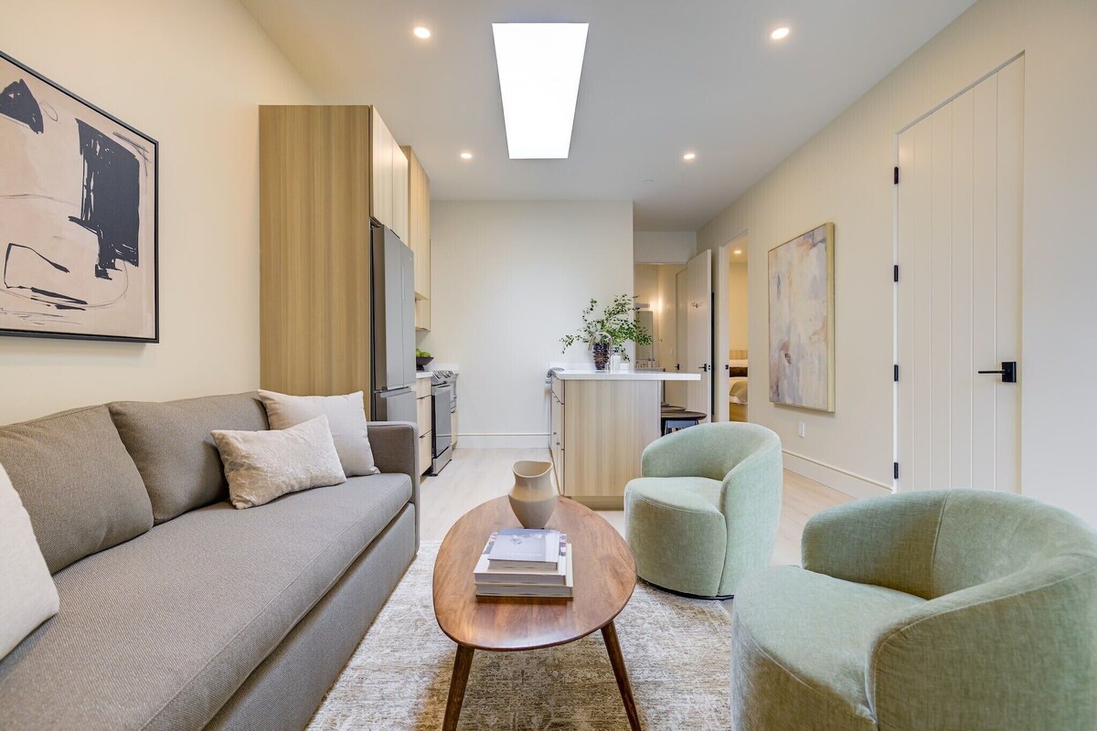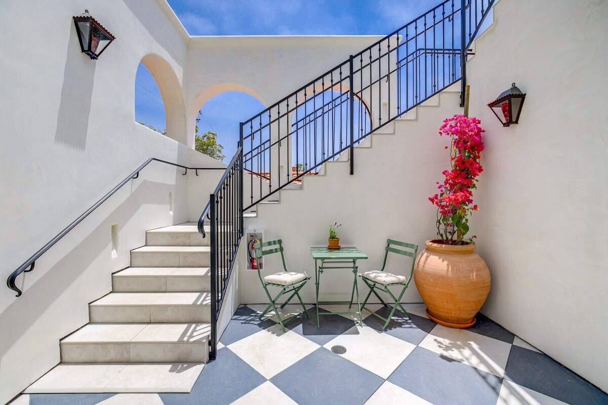 ## Space The unit has been immaculately renovated, with its upstairs exterior access in a multi-unit building only two blocks from downtown Santa Barbara & State Street. This 822 sqft, 2-bedroom, 2-bathroom, fully equipped apartment features a full kitchen with an island and counter seating set in a large open space with the living room. The primary bedroom has a deluxe en suite bathroom with a deluxe bathtub. The second bedroom also features a king bed and a private street-view balcony. It also has direct access to a Jack and Jill-style bathroom with a walk-in shower. The bathroom is also accessible from the main living area. This high-end unit includes all amenities to provide a comfortable short or longer stay for up to 6 guests, with two sleeping on the high-quality queen-size pull-out sofa. Adjacent to the kitchen is a laundry room with a brand-new LG washer and dryer stack and ironing amenities. The original Spanish architecture has been preserved while offering modern upgrades & conveniences. Enjoy the stunning communal rooftop terrace with breathtaking mountain views, open for guests between 8 am and 10 pm. The living room offers a 65\ Sony Bravia with features similar to the living room TV. The full kitchen is equipped for all your cooking needs and features a stovetop, oven, dishwasher, microwave, and a Nespresso Vertuo coffee maker. Vertuo pods and sugar, sweetener, and coffee creamer are provided for your stay. Pets are welcome with a small fee per stay. *NO PARTIES: We have a strict 'No Party' policy, and parties or events are prohibited. Quiet hours are enforced from 10 pm to 8 am.* *PETS: ONLY 1 PET ALLOWED (N/A to service animals, applicable to ESA's). A pet fee will apply; pets can not be left unattended in your room. Please add your pet to the reservation, or disclose your pet to our hospitality team after booking. Pets will enjoy fresh water from the SIBAYS pet fountain with filtration system, located next to the ice machine in the covered garage. *LIVING WAGE PLEDGE: Our cleaning fee includes cleaning the unit and outdoor space professionally. As part of The Living Wage Pledge, we are committed to paying our cleaners fairly. A living wage is a minimum income necessary for someone to meet their basic needs and participate in their community.* *SUSTAINABILITY: To support sustainable tourism and reduce our carbon footprint, we provide Public Goods toiletries and green cleaning products.* *BABY / CHILD AMENITIES: Pack n' play and high chair are available and stored in the laundry room of the apartment. ## Access This is a self-serve stay. We provide contactless self-check-in. The doors are all equipped with smart locks, and a unique code matching the last four digits of your phone number on file will be generated and sent to you on check-in day via SMS. There are stairs leading to the unit and no elevator. We do not provide daily cleaning. However, we are happy to refresh rooms for stays longer than five days upon appointment. Please get in touch with our hospitality team to switch out towels or request extra supplies. Parking: Casa De La Vina offers free guest parking in its private parking lot—one parking spot per unit on a first-come, first-serve basis. Free street parking is available if the lots are full. ## Interaction This is a self-serve stay. We are off-site hosts; there is no front desk or office, and we provide contactless self-check-in. We have a dedicated hospitality phone line in case of emergencies (24/7) and our team is available on call, text, or chat during 5 am - 1 am to help assist you during your stay! ## Neighborhood Located within walking distance to nearly all restaurants and retail stores on the State Street corridor, 20+ tasting rooms, 10+ breweries, and countless choices for eating or drinking make this an ideal location for anything that may bring you to the world-renowned Santa Barbara Coast. ## Transit Santa Barbara Transit Center is five blocks away. ## Notes For security, there are cameras on the exterior of the building. This complex does not have live TV service. Instead, all TVs have apps (Netflix, Hulu, YouTube TV, and Amazon Video) for your streaming pleasure. The property has gigabit wifi, and the unit has a private network for guests to cast directly onto the TV. Cancellation policy: Full refunds are available up to 24 hours in advance. A 4% credit card charge is assessed for cancellations made through direct sites and VRBO. Our prices include all fees. No hidden fees.