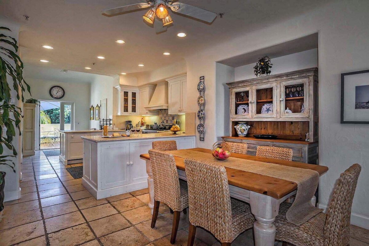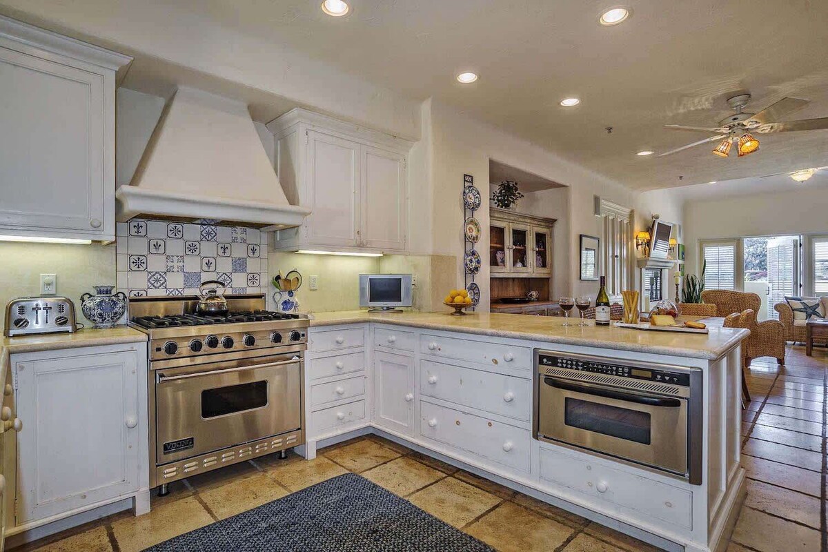 Summary: Mykonos is a luxurious 2 bedroom/2.5 bathroom Santa Barbara vacation home perfect for a small family. The Space: The spacious interior can accommodate up to 4 guests, and don't forget to bring your pup along as Mykonos is pet friendly! Surrounded by white walls and fine furnishings, guests can get their Greek island fix without even leaving California. Enjoy sunny days on the many outdoor decks or take a short bike ride down to the beach. Please be advised there is construction noise in the neighboring unit and common garage area, during daytime hours, at least until, and possibly beyond the end of November. We are working with the neighbor to minimize any disruption during your stay. City allows for construction between 7am and 8pm. Upon approaching this vacation rental guests will have access to a 1 car garage through the gated entry on the ground floor. he main level (3rd floor) of the home features a crisp white interior with blue coastal finishes. The living room is furnished with comfortable seating options placed around a gorgeous fireplace and mounted flat screen TV. After a day of exploring the city, light a fire and curl up on the couch to watch a movie. A DVD player and WIFI are provided for family entertainment. Continuing past the living room guests will find an open floor plan seamlessly connecting the kitchen and dining area. Laundry closet is located off of the kitchen. The kitchen is fully equipped with modern stainless steel appliances and a generous amount of counter space. Anyone will love cooking their favorite dishes in here, some may even be tempted to try out some new recipes. When your meals are ready to be served have all guests take a seat at the dining table. The dining table has seating for six, so everyone can enjoy a home cooked meal together. The second floor holds the two bedrooms and 2.5 bathrooms. At the end of the night when you are ready to receive a good night's rest, choose from the master and guest bedroom. The master bedroom is furnished with a luxurious King-size bed, TV, has a private deck, and an ensuite bathroom. The master bathroom offers a tranquil morning - soak in the jacuzzi bathtub or enjoy the walk-in shower and dual sinks. The guest bedroom holds a Queen-size bed, TV, reading nook, and similarly has an ensuite bathroom. On the 4th floor, the rooftop terrace may be the best feature of this home. A variety of outdoor seating is sprawled along the deck. Settle down in front of the outdoor fireplace or fire up the grill to dine alfresco. While lounging in this area you are sure to witness some breathtaking sunsets as the sky transforms to pinks and golds. THINGS TO NOTE: - Please note that this home can accommodate up to 2 Dogs, with an additional Pet Fee of $250 per stay. This fee is not included in your final booking price. If you are bringing Dogs, please contact our Customer Care Team after booking to pay the pet fee. Other Things to Note: Please note: If you are bringing a pet - the pet fee is not included in this total price. An additional pet fee will be applied after booking is complete. A maximum of 2 pets can be brought to the unit. If you have any questions or concerns please feel free to contact us. To avoid fines please make sure your pet is on a leash and you pick up after your pet. Our prices include all fees. No hidden fees.
