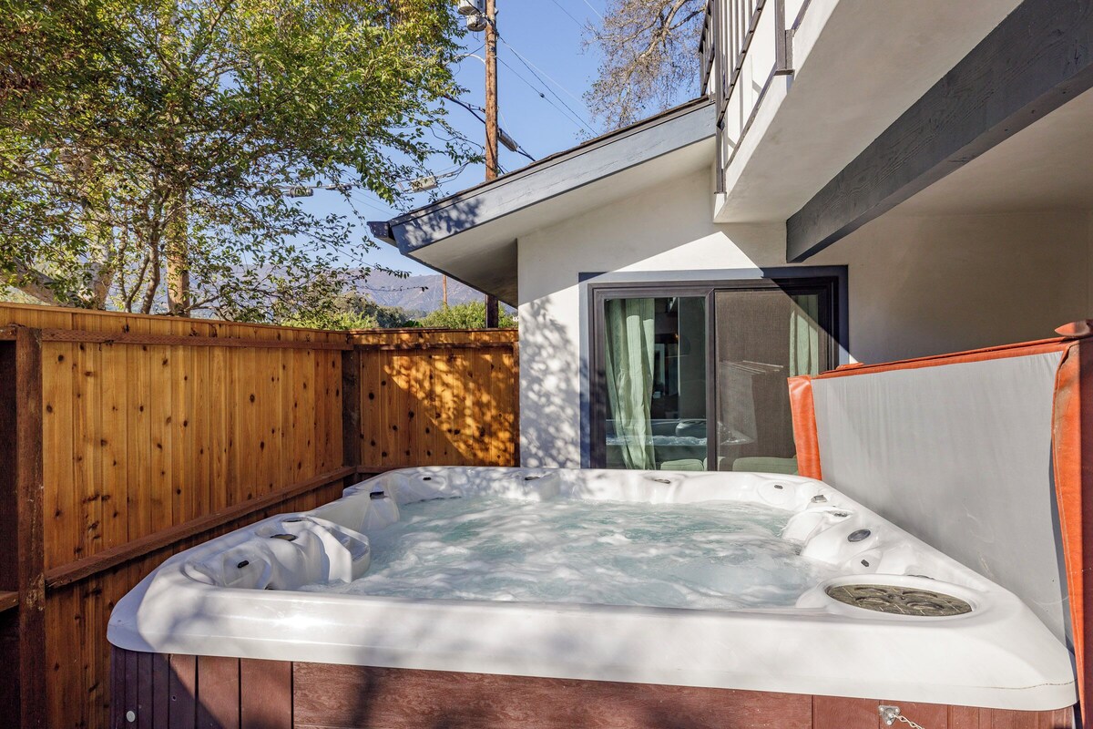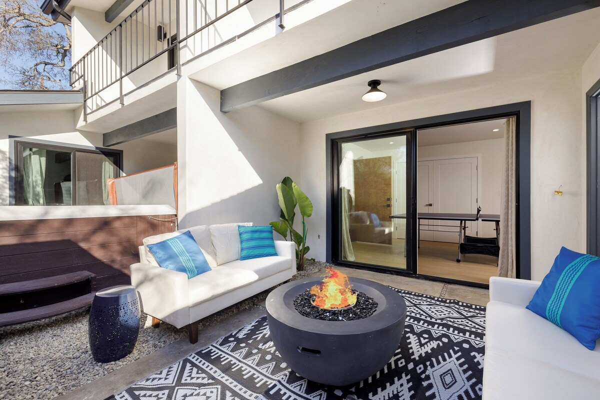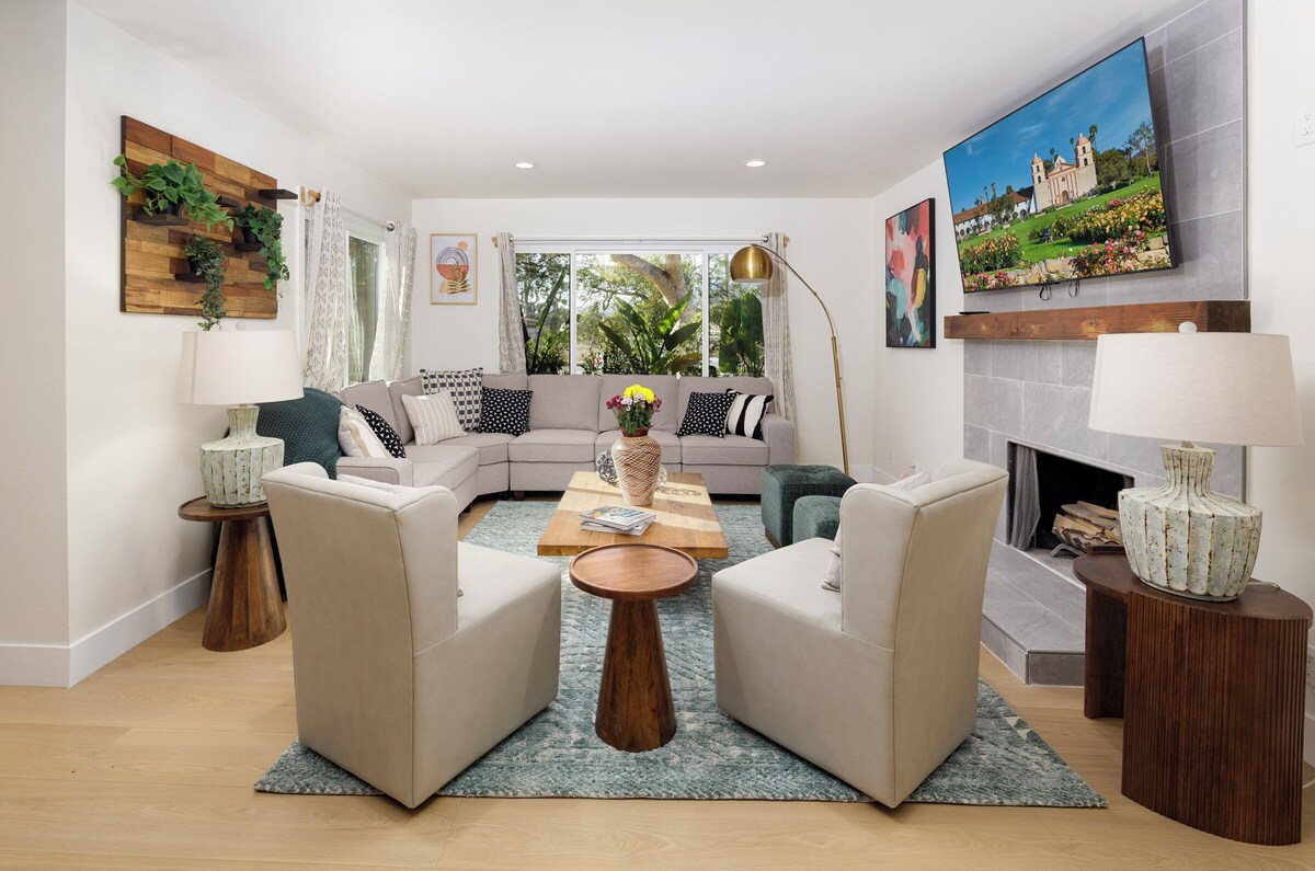 Walk to the Beach! Newly Remodeled 5 bedroom, 4 FULL bathroom Beach House right down the street from Santa Barbara's most iconic beaches and parks. Enjoy modern design & luxe decor in a fantastic beach location Large 8 person jacuzzi, firepit & BBQ. One of the most child friendly homes with a full game room & separate wings of the house for kids. Packed with luxurious amenities- newly remodeled kitchen & bathrooms, AC, beach cruiser bikes, Beach equipment, etc! Pet friendly! ($125 fee) KITCHEN Designer chef's kitchen equipped with 36\ Smart TV, regal fireplace, and abundant comfortable seating for large groups. Snuggle up on our comfy 8 person L-shaped sofa for movie night or sports games. We provide Netflix and Youtube live tv (similar to cable). The living room has large dual pane windows that bring in abundant natural sunlight. The modern open floor plan transitions directly into the dining room with large sliding door, creating the perfect indoor-outdoor flow. DINING ROOM Lovely dining area with open floor plan that seamlessly connects to the kitchen and living room - perfect for entertaining. Our oversized dining table can comfortably fit 10 people (12 people can fit if you squeeze together). Large glass sliding doors open to our 8 person jetted hot tub. 5 BEDROOMS Extremely comfortable (brand new) mattresses from Sit & Sleep's luxury line. Enjoy plush pillows, luxury linens, and blackout shades to get the perfect night's sleep, plus AC for perfect temperature control. Our sleeping arrangements include: Bedroom 1: King Bedroom 2: King Bedroom 3: King Bedroom 4: Set of Full/Double (2 beds) Bedroom 5: Set of 2 Twin bunks (4 beds) - Designed as a kid's room Please note: 4 of the 5 bedrooms are upstairs, so if you cannot walk up or down stairs this may not be the best house for you. 4 FULL BATHROOMS We are proud to be one of the few airbnb's in town that can boast 4 full bathrooms. Why share a bathroom when you can have your own? Our bathrooms are newly remodeled with marble floors, stunning tile work and plush luxury towels. The 2 full bathrooms upstairs each have a large dual vanity sink, toilet, and tub+shower combo. The 2 beautiful full bathrooms downstairs each have a single vanity sink, toilet room (for extra privacy), and a shower only (no tub). Stacked with luxury amenities, we provide all the following complementary to each of our guests: Shampoo, conditioner, body wash, q-tips, makeup wipes, cotton swabs, tissues, wash clothes, abundant towels, body lotion, hand soap and hair dryers. OUTDOOR SPACES Awesome 8-person jetted spa set to peak 104 temperature, along with outdoor seating area with firepit and a outdoor BBQ grill. The perfect get-away to soak up the beautiful Santa Barbara weather. Tall redwood fencing provides great privacy and seclusion. THE AREA Picturesque Santa Barbara location close to countless beaches, parks, restaurants, wine tasting, shopping, hiking trails, the Pier, and only 2 miles from Downtown Santa Barbara. Quick 2 minute walk to East Beach and a 10 minute walk to Santa Barbara's Zoo. Only a short drive to Hendry's Beach (incredible off-leash dog beach). Located right across the street from various restaurants and Tri-County Produce (a local favorite for fresh groceries). The perfect coastal get-away! The garage is used for storage and supplies and is generally not accessible to our guests. We have 3 exterior off-street parking spaces (2 of the 3 are tandem). Our home is located close to the freeway and the train. This doesn't bother the majority of our guests, but we just wanted to let you know because we believe in full disclosure! Our prices include all fees. No hidden fees.