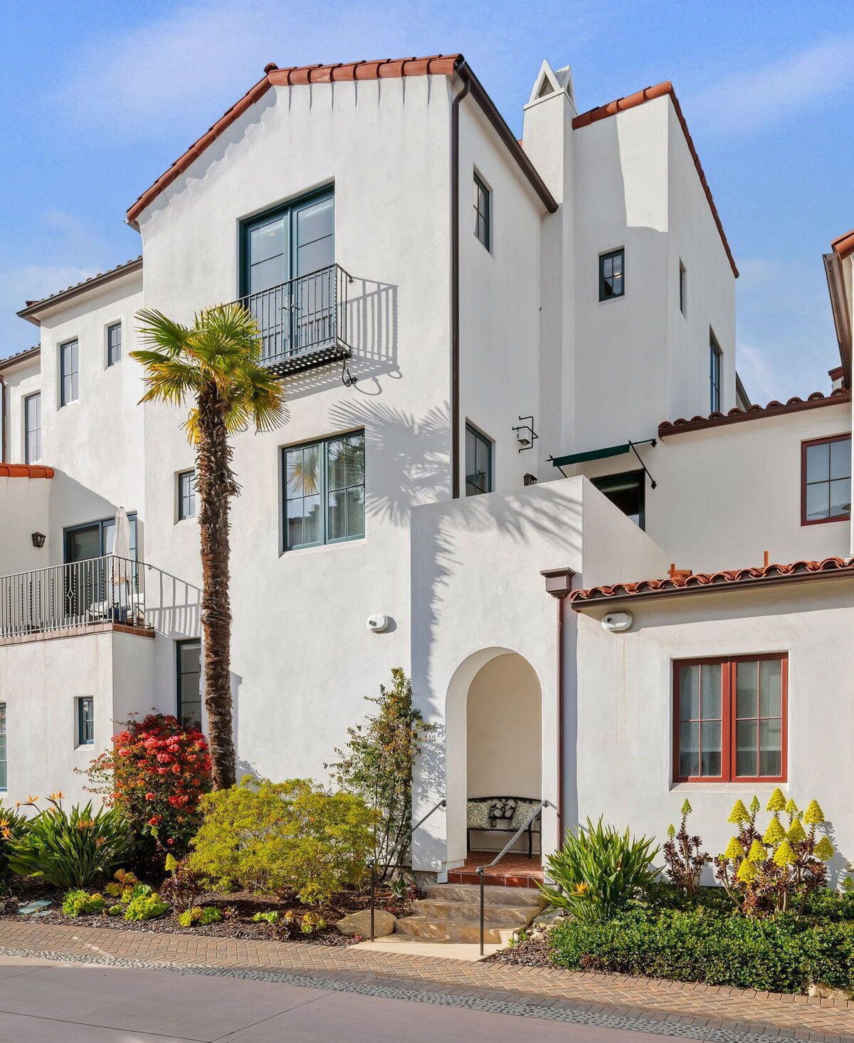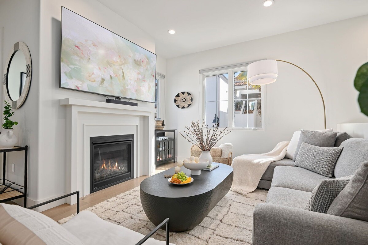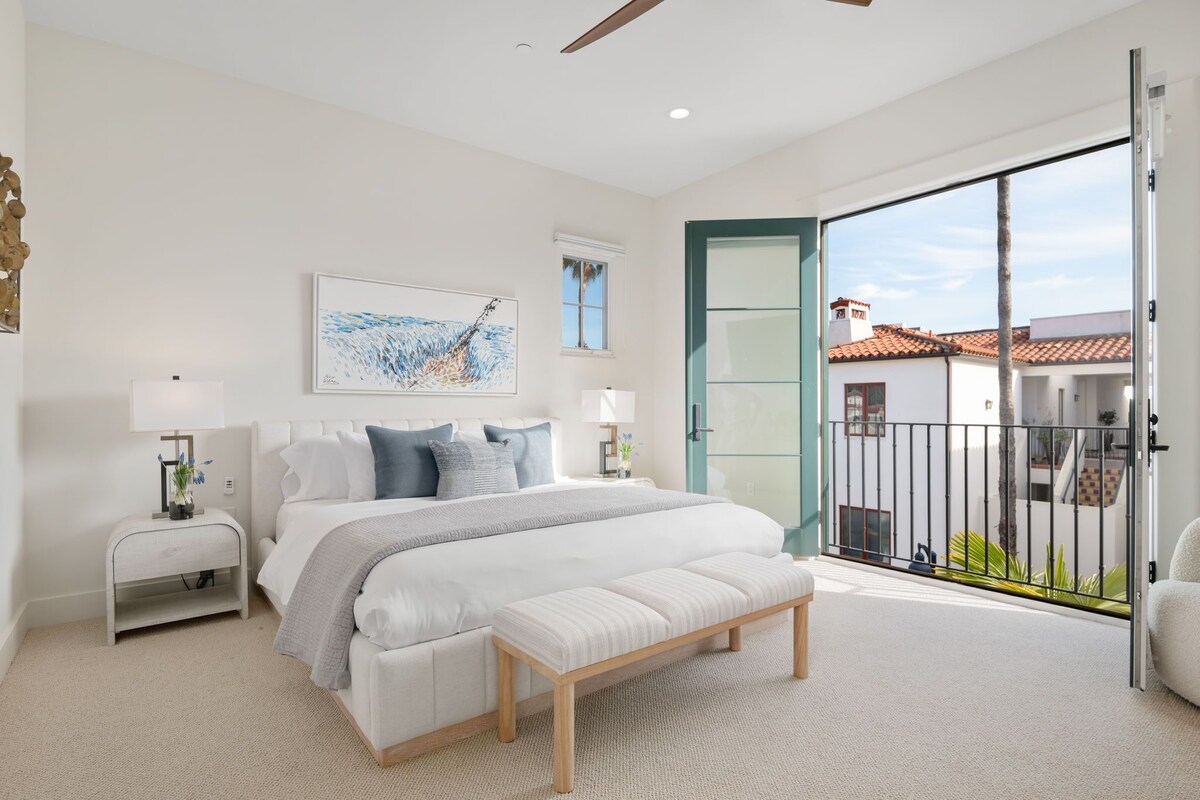 Uptown Luxe resides within Estancia, a well-respected new development of townhomes on upper State Street. The vibe here is upscale, relaxed and convenient to great amenities in Uptown Santa Barbara. Indulgent and immersive experiences are part of a perfect vacation. At Uptown Luxe, whether soaking in a luxurious free-standing tub, relaxing on the living room sofa sectional with a great novel, or sleeping soundly in the spacious primary suite in the king-size bed, luxurious, experiential living is a given. In a Vacation Rentals of Santa Barbara-managed home, the stage is set for guests to feel pampered and well cared for. Did you know our Property Care Specialists do a final inspection right before you arrive? We pride ourselves on making sure every home has been cleared for take-off! With a calming neutral palette as backdrop, the home's pops of color and great art punctuate an upscale design aesthetic. Enter the home on ground level and ascend to the main floor great room where guests can stay connected when it comes time for meals, conversation, movies, and healthy competition for game night around a large circular dining table. A well-stocked kitchen, anchored by a large center island with seating, means meal preparation involves everyone! Whether the morning calls for a quick cup of coffee and pastry from Jeannine's Bakery down the street, or holiday meals with a more gourmet theme, it's all there. The main level terrace provides a cozy space to relax, and with a grill and a Ooni pizza oven, the chef in the bunch can fire off a perfect pizza or grill up the fresh catch of the day. Visit Whole Foods right across the street for fresh ingredients and picnic inspiration! On this same level is one bedroom with a twin day bed and desk; a hall bathroom and laundry complete this level. Upstairs, the primary suite is an excellent escape from a busy workday or a place to grab a rejuvenating nap after an active sightseeing adventure. Even the simplicity of a comfy corner chair provides a quiet spot to curl up to listen to a great podcast, chat with a friend far away, or sit back and do nothing. Ah, that sounds lovely. The luxurious primary bathroom is spa-like, with a large walk-in shower, dual-separate vanities, and a luxe, free-standing soaking tub. Ahhhhhhhhh, now that's living. The third bedroom suite with a queen-size bed and en suite bathroom completes the sleeping accommodations beautifully. Estancia is a well-constructed and laid out community providing a central common area with covered outdoor seating in front of a large stone fireplace, sunny patio seating around a fountain, and colorful tile-accented Spanish-influenced architecture seamlessly sitting just below the majestic foothills. The proximal location near Highway154 makes heading to Santa Ynez Valley for wine tasting, glider rides, and fabulous dining and shopping in Los Olivos a must! E-bikes are all up and down State Street; log onto the app to find the nearest ones available and head downtown or to the beach. Looking for curated experiences? Visit our website for CONCIERGE SERVICES to help you plan the perfect day. Enjoy a stay at Uptown Luxe; the possibilities are endless, as are the adventures, quiet moments, and memory making to be enjoyed long after you depart this wonderful property. Our prices include all fees. No hidden fees.