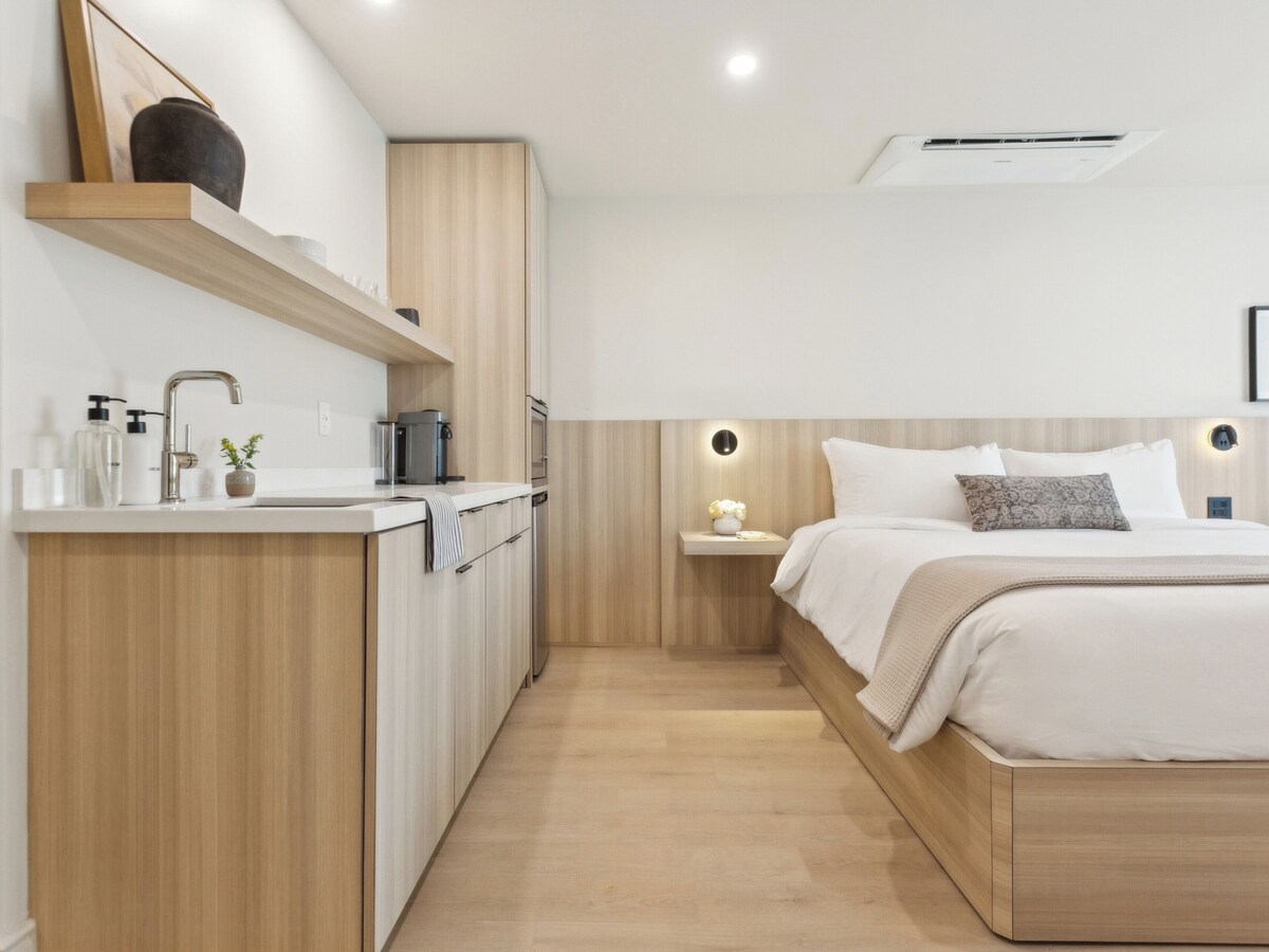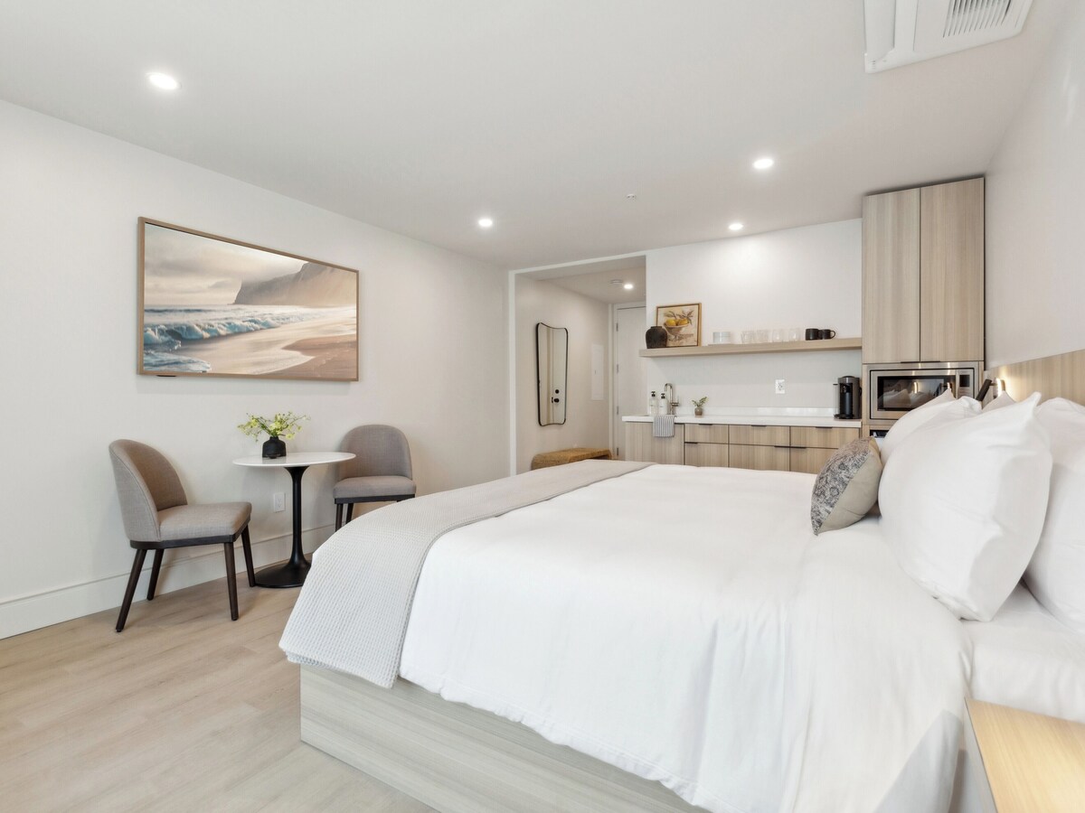 Nestled on the ground floor (no stairs), in a charming multi-unit Spanish-style property, just three blocks from State Street, this 341 sq ft retreat seamlessly blends historic architectural charm with modern luxury, minimalism, and convenience. - King-size bed, sleeps 2 (Cool Gel Chill memory foam mattress) - Two pillow types are available for each guest stay—a firm non-feather pillow and a softer feather pillow—for your comfort and selection. - 65\ n Play, high chair, and changing mat available upon request - (please reserve in advance) - Casa Riviera 3 is located on the first floor of a two-story, 30-unit boutique hotel Access - The doors are equipped with smart locks, and a unique code matching the last four digits of your phone number on file will be generated and sent to you on check-in day via SMS. - Free parking in private underground garage, on a first-come, first-served basis; accessible by elevator to all floors - Free street parking if the garage is full - No daily housekeeping; refresh service available for 5+ night stays (by request) Interaction - Contactless stay - no front desk or office - 24/7 emergency hospitality line - Hospitality team is always available via text/call/chat from 5 am–1 am Neighborhood You ,
