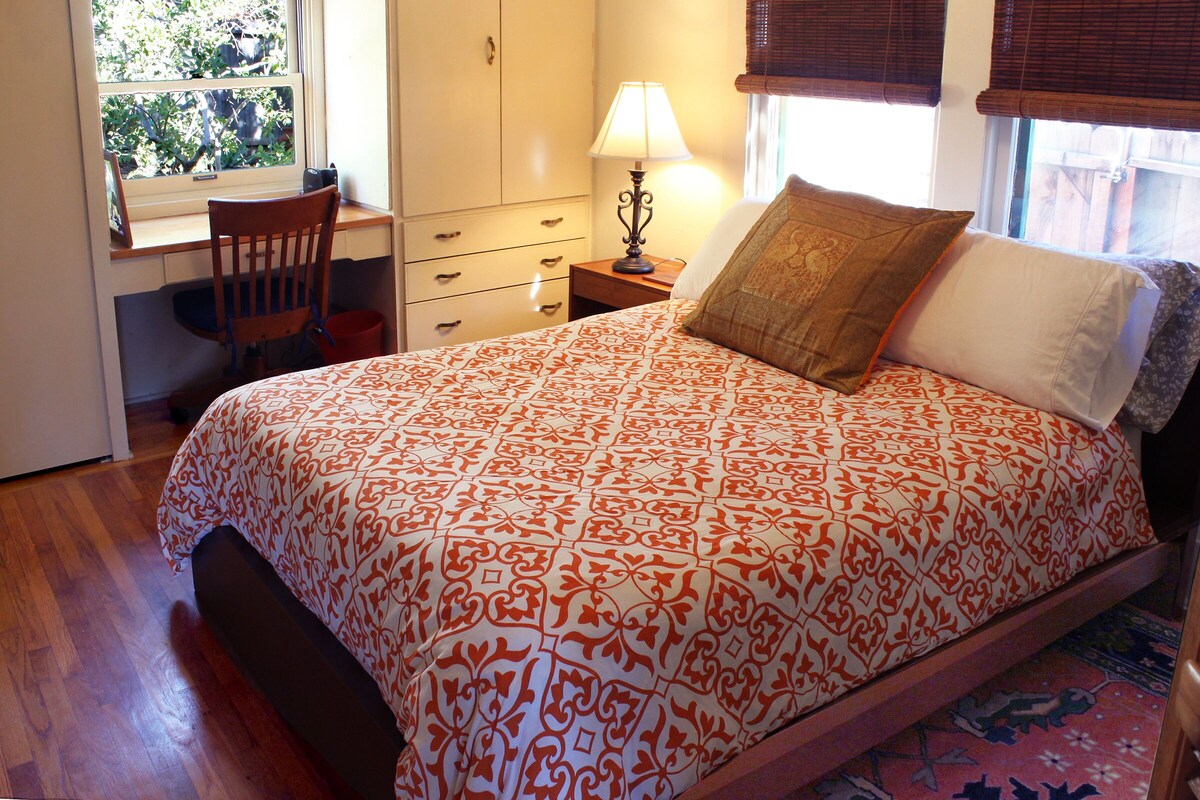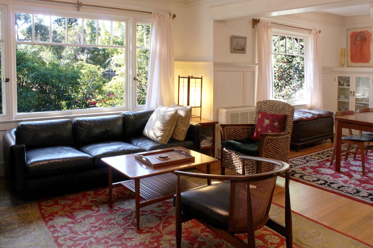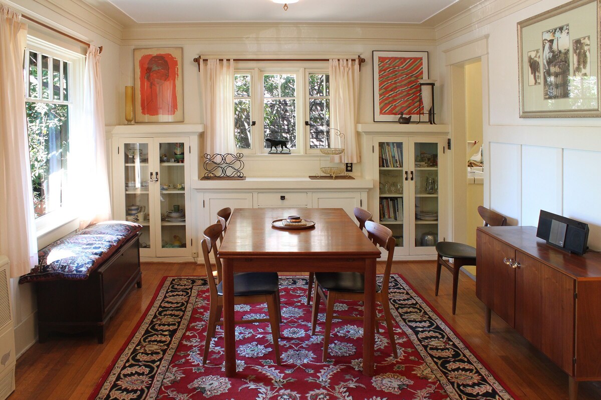 Welcome to the Painted Pony Bungalow. Take a step back in time in this century old bungalow secluded from the street by a giant oak tree. With two bedrooms and one bath, it accommodates three long term guests in comfort. The master bedroom with the queen bed, has a newly installed air conditioner (window style) that states it cools up to 400 plus sq. feet. The dining table is set for four people but can easily expand to serve six guests. Dog friendly, please inquire. Our bungalow is located on a quiet, three block long street in the Bungalow Haven neighborhood that includes a large number of intact Craftsman-era bungalows in a four block square area. It's only six blocks from State Street, close enough for an easy walk and far enough to escape traffic and noise. We are twelve to fourteen blocks from the beach. At State Street you'll find the Museum of Art and the newly rebuilt Granada Theater. The Santa Barbara County Bowl is three blocks away. The beach is two miles by car or bicycle. It’s only a mile to Santa Barbara Mission and Rose Garden. Painted Pony Bungalow features these amenities: Charming kitchen with original cabinetry, and a 50’s era Wedgewood stove, microwave, bright red corner booth, a microwave, a coffee maker & grinder, with a washer & dryer tucked away in a cabinet. The kitchen has a new kitchen sink with a drinking water filtration fully installed, and generously equipped with pots and pans, utensils and tableware for the inspired cook. A new sliding glass door opens to the backyard garden and deck with a patio table for outdoor dining, complete with a natural gas barbecue, and a nicely tucked away private hot tub/spa that seats six. The relaxed garden filled backyard is fully enclosed and dog-friendly. The patio table is there for your morning cuppa, and for easy entertaining. There is also power source in case you'd to take your laptop out on the back patio for a change of work space & some fresh air. Regarding access and mobility preferences, as you can see from the photos of the front of the house, there are five steps up the front porch from the front yard walkway. From the backyard there is one step from the back deck through the sliding door to enter via the kitchen. The interior of the bungalow is all on one level. It is not , however, wheelchair friendly. Your off street parking spot is located in a small back lot, with easy access to the front door or back yard. VRBO Pet fees are for each pet by the month. Longer stays can be discussed. High-tech goodies include broadband Wi-Fi, 40” HDTV with Cable. The living and dining rooms feature early 20th century cabinetry and trim, oak floors and a gas fireplace. The master bedroom has a queen bed with a new window mounted air conditioner, the front bedroom has a full size bed. Both beds have memory foam toppers, and are extremely comfortable. Both bedrooms have shades and /or curtains for a good nights sleep. Fresh cotton bed linens and towels are provided. The Jack & Jill bathroom has a low-flow toilet, refinished full size tub and shower tub, and vanity located between the two bedrooms. Keywords: bungalow, cottage, craftsman, painted, pony, house, hot tub, garden Our prices include all fees. No hidden fees.