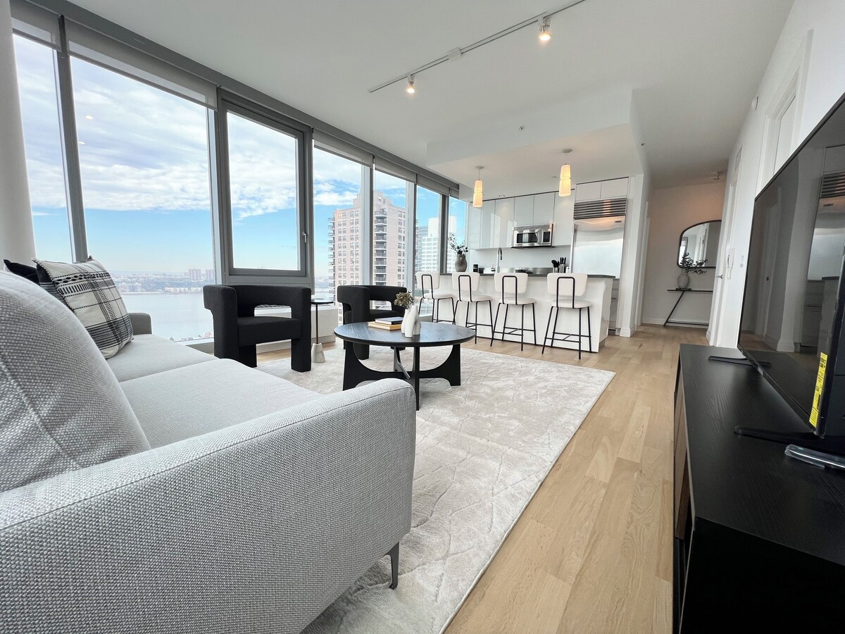 Furnished, spacious modern 2 bedroom/2 bathroom. In unit washer/dryer, state of the art appliances. Corner unit, west and south facing with spectacular river and city views. Pet friendly, 24 hour doorman.
