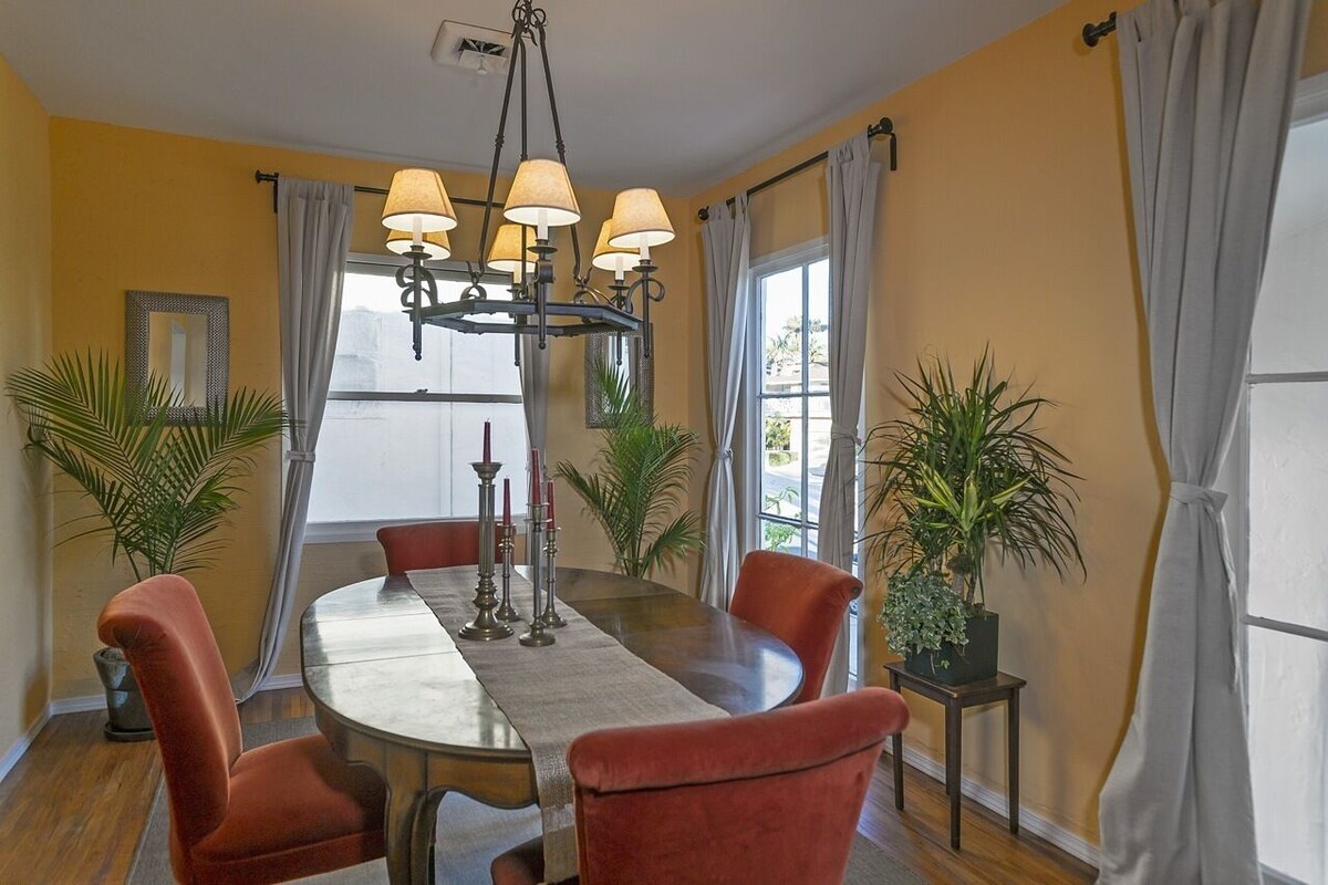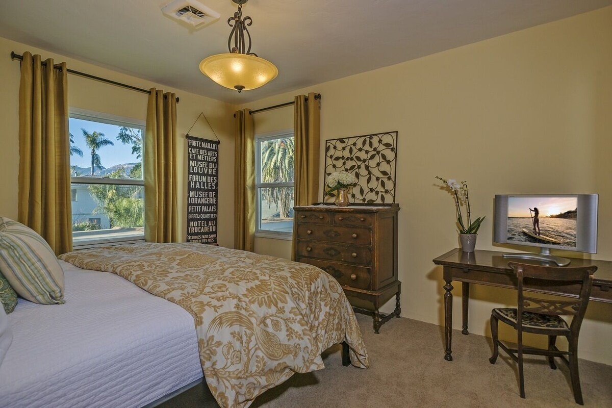 Located on a quiet street just a five minute walk to State Street sits this well-appointed Spanish home. Beautiful, comfortable, elegant, and loaded with charm. This property is a luxurious and relaxing retreat in the heart of Santa Barbara. Nearby you'll find trendy wine tasting rooms, a variety of shops and an abundance of restaurants, and a stunningly beautiful natural environment. The home is located two blocks from the world's most picturesque walking/running path bordering Cabrillo Boulevard and the beach. Dining and living areas offer ample space to unwind or entertain. Unit is two bedrooms and one bathroom with tub/shower. The master bedroom has a CA king-size W hotel Signature Bed, TV, and workspace. The second bed room has two twin beds. The cook's kitchen boasts new appliances and is fully equipped with all of the amenities you'll need to dine at home. There are several local Farmer's markets within walking distance. Thoughtfully appointed with HDTV, books, DVDs, and WiFi. Front yard, BBQ patio area, off-street parking. Perfect for two couples, a family, or a romantic getaway. Our prices include all fees. No hidden fees.