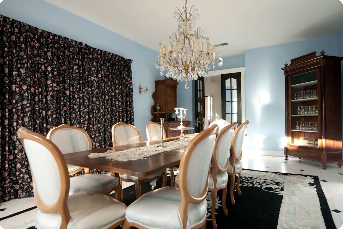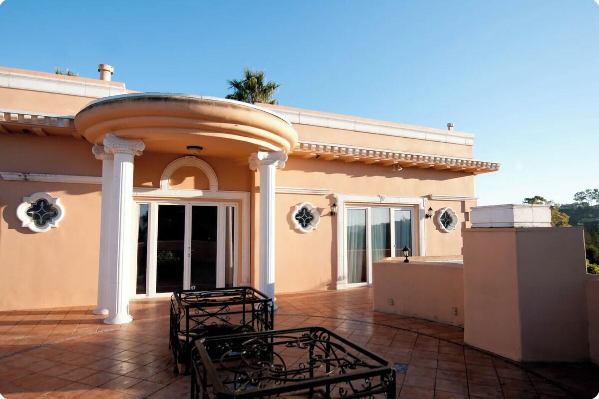 Situated on a hilltop overlooking beautiful Santa Barbara, this custom built home is a Mediterranean style mansion with breathtaking views of the city, ocean and mountains. This property is ideal for a get-a-way weekend, extended stay and provides an incredible setting for weddings and events with a very large backyard and terraces surrounding the home on the main and upper levels. The master bedroom has a canopy bed, marble fireplace, private bathroom with a large custom made spa tub and a separate double size shower adjoining his and her marble sinks. There are three guest rooms, each with its own full bath and terrace. Elegantly furnished the interior is accented with four carved marble fireplaces and luxurious European crystal chandeliers. The home features a very large formal dining room. The spacious family room has a flat screen TV and bar. The impressive round living room spans 28 feet in diameter. The kitchen has everything you need including two sinks, two dishwashers, a five burner cook top, a large built in refrigerator, a large built in freezer and a cozy breakfast nook. WiFi High Speed Internet and cable T.V. are included.. Conveniently located just minutes from downtown, shopping and the beach, in a quiet, peaceful and conveniently situated neighborhood.Upon reserving, an advance of $3,000 is payable. Balance is due in full 90 days prior to the initial date reserved. Cancellation 90 days in advance is subject to 20% cancellation fee. Cancellation less than 90 days prior to the event and more than 60 days prior is subject to a 50% cancellation fee. No refund shall be provided for any cancellation less than 60 days prior to event. • Near Beach • Near Town • Near Shopping • Near Restaurants Our prices include all fees. No hidden fees.