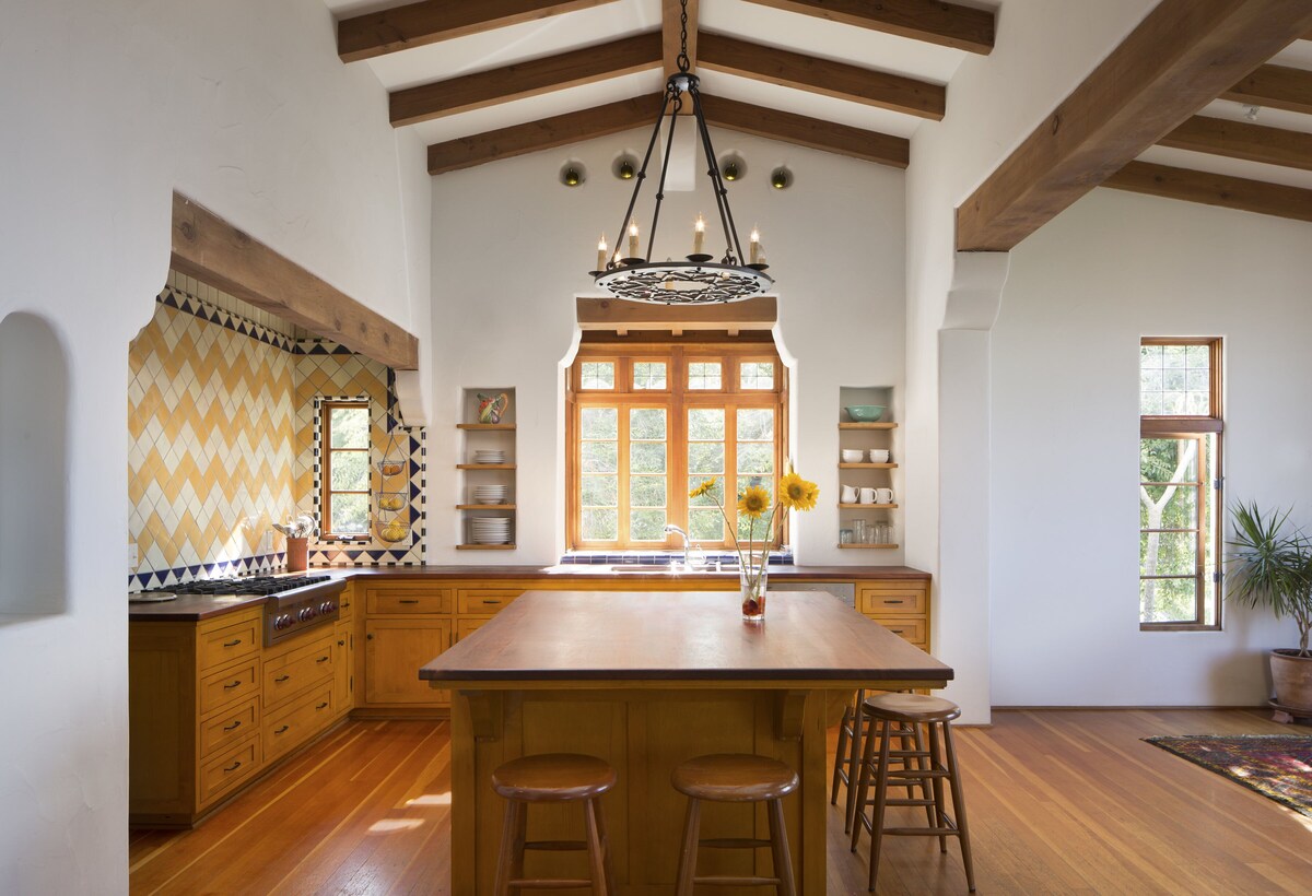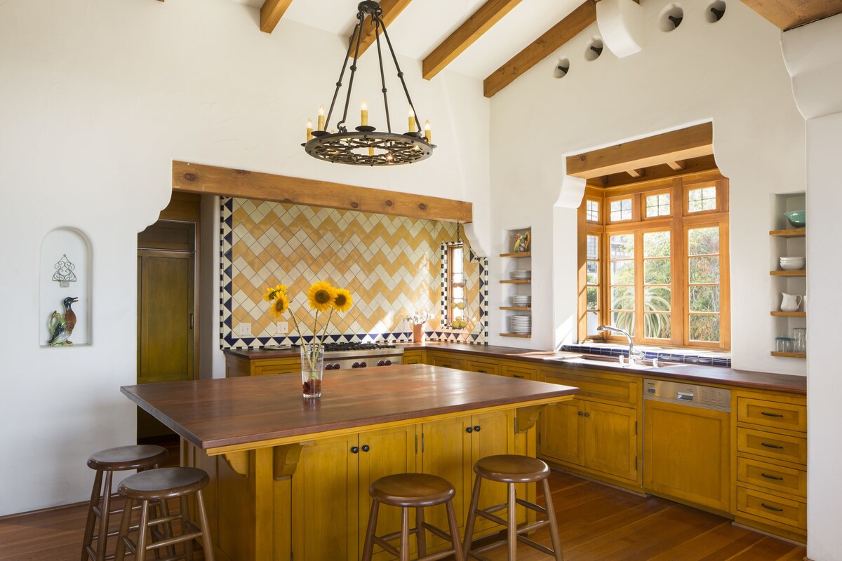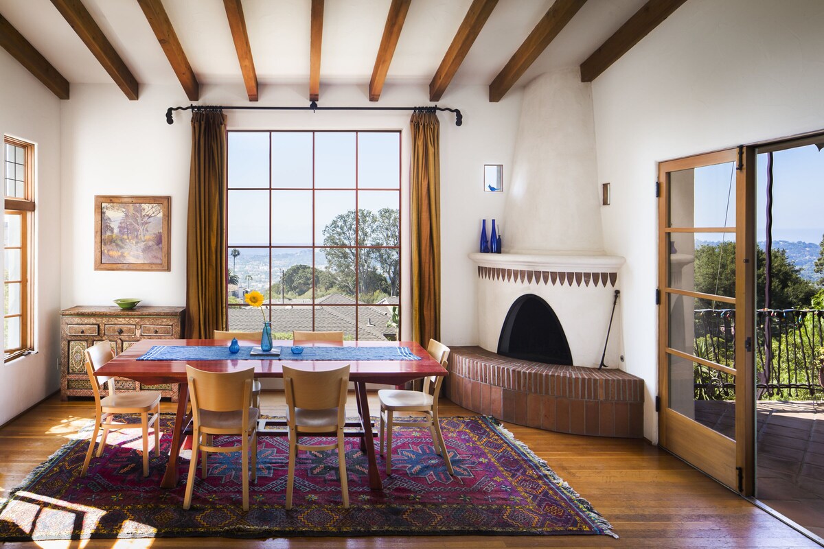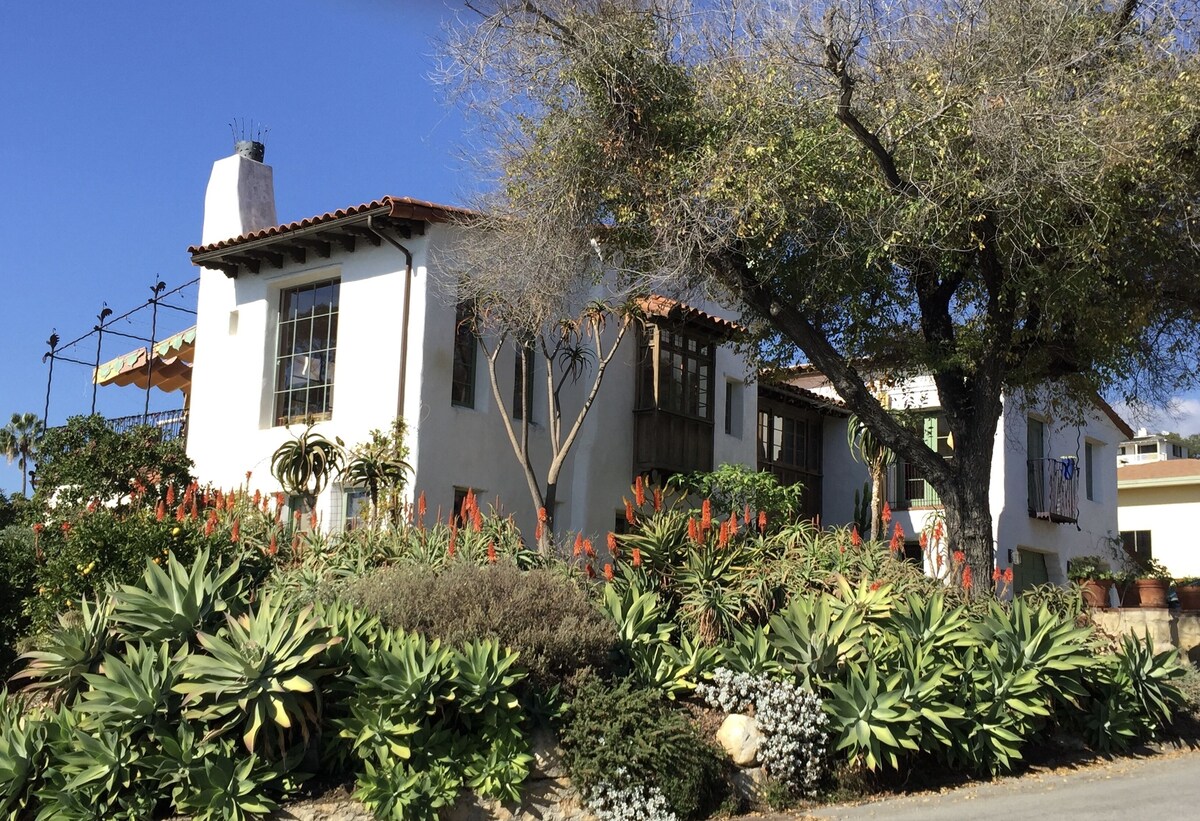 COME RELAX IN A CLASSIC SANTA BARBARA LOCATION -- GET DRENCHED IN SPANISH ARCHITECTURE, OCEAN VIEWS, COMFORT AND HAPPINESS. Available for three months to 1 year This is a gorgeous, supremely livable gem of a house, designed by Santa Barbara’s well-known architect, Jeff Shelton. Spanish Colonial with an attitude. Situated amongst other striking homes in the very walkable/bikeable/runnable Upper Riviera. Built in 2003 but feels like the 1920's. Three bedrooms; 2-½ bath rental in a perfect Santa Barbara setting. The spacious \ and master suite are on the second story. Every room has a terrific view of red tiled rooftops to downtown Santa Barbara, to the harbor, ocean and the Channel Islands. The kitchen has top-of-the-line cooking facilities: Wolf 6-burner stove and oven, Viking refrigerator., teak countertops and a huge teak island to prepare food and sit around. Off the kitchen, a TV/family/reading room is outfitted with a comfy L-shaped couch, two club chairs, a wall of books, a 50-inch flat TV (HBO, Netflix, and Amazon....) . The dining table (seats 6-10) and sits in front of a ceiling-to-floor window. A powder room is located close to the great room. Both the dining area and the TV room open onto an awned patio. The patio is amazing view of City roof-tops, Channel Islands and the ocean. The patio is equipped with a gas BBQ and an L-shaped, very comfortable couch with two armchairs. It is a perfect place to visit with friends, nap, or read the paper. The master suite (queen) is set away from the public space, across an enclosed wooden bridge. The bedroom consists of a cozy and romantic sleeping alcove (ocean view, queen-sized bed) with a more extensive sitting area . The master bath contains a washer and dryer (one of two in the home), a big tub, and separate shower with sea-glass tiles. In addition there are his and her dressing areas and a closeted commode. The ground floor has two bedrooms (queen and double) that share a single, full bathroom, a full size washer and dryer and a fully-outfitted kitchenette. This wing can serve as an independent living space, with one bedroom converted into a living room. A separate and alternative entrance, through 8-light French doors, makes this wing a flexible and functional private apt. for guests, or a totally cool space for the teenagers in your life. Open the door separating the wing from the main entrance and it's seamlessly part of the main house. Close the door and use the alternative entrance and it's a private living space. The kitchenette and W/D can be hidden behind thick-woven southwestern drapes. A small patio with orange, lemon and guava trees is just outside the downstairs bedrooms. A newly built, well appointed Gym, including a Peloton, dumbbells, adjustable bench, squat rack and olympic size barbell, is housed in a room filled with. natural light. Step out onto a sweet patio to relax after the workout. This room also contains a desk, file cabinets and office supplies Further afield, the El Encanto Hotel is only one and a half blocks away, along a “locals only” pathway that winds through the grounds to the famed dining patio. The historic Riviera Theater, three blocks away, is home of the Santa Barbara International Film Festival and a year-round source of foreign and Indie films. Many downtown restaurants have outdoor patios lining State Street. This main road is closed to traffic, a delightful holdover from the time indoor dinning was not popular. The pedestrian-only main road now gives downtown a festive feeling. Beautiful eclectic furnishings, locally-collected plein-aire paintings and top of the line construction blend with the award-winning architecture to create a peaceful, inspiring and happy place to call home. Dog-friendly, with $500 extra one time fee. Small, fenced dog run. In addition to the house, there is a private and self-contained studio apartment with a separate entrance, a full bath and kitchenette (no oven). This unit is currently rented long-term to a mature professional woman.. For rent for 3-12+ months. No nightly or weekly rental inquiries, please. Thie City of Santa Barbara does not allow short term (less than a month) rentals. House: 3 bds. 2½ ba. Rate: $14,000month. 3 month minimum. Refundable ($1,4000) security deposit. Insurance, available through VRBO, to cover any damage, is also available. One-time cleaning fee ($750). Our prices include all fees. No hidden fees.