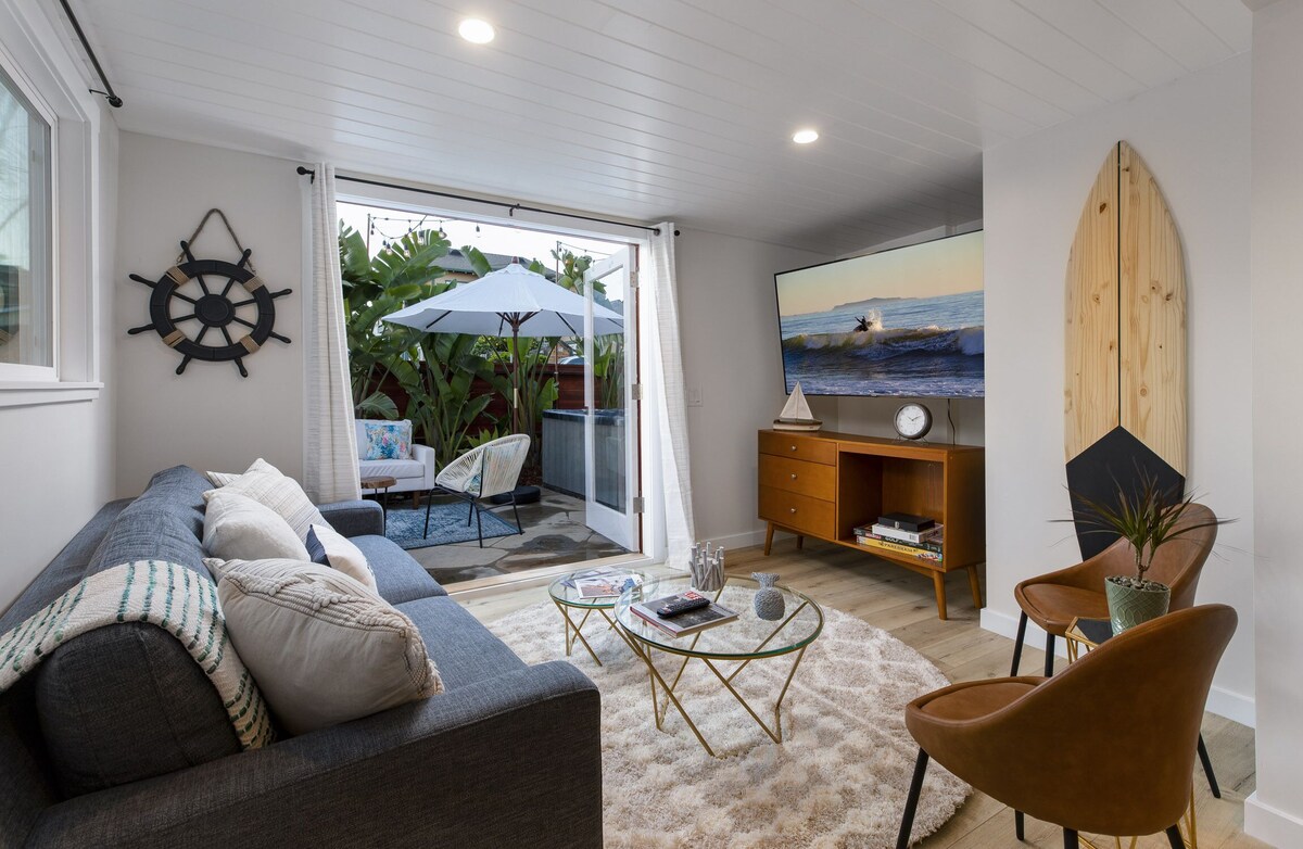 Walk to the beach! Newly remodeled 3bed/3full-bath home with a luxurious jetted spa - located just 2 blocks from Santa Barbara's favorite beach. This sleek and luxurious private home boasts high-end finishes, an open floor plan with incredible natural sunlight, and stunning outdoor spaces. Incredible location only .2 miles (5 min walking distance) from Leadbetter Beach & Shoreline Park, and only 2 miles from Downtown. The living room has French doors that open directly to the stunning flagstone patio - perfect for enjoying the sunny Santa Barbara weather. The open concept kitchen is equipped with modern appliances and Quartz countertops to fulfill all of your cooking desires. All bedrooms have new mattresses from Sit & Sleep along with memory foam pillows to ensure you are comfortable throughout the night. The outdoor seating area is surrounding by lush tropical landscaping set beneath string lights which cast a romantic ambiance. Packed with amenities from head-to-toe in a charming beach location. Pet friendly ($250 pet fee). The perfect coastal getaway! LOVELY OUTDOOR SPACES: The exterior of the home boasts stained Brazilian Ipe wood, lush tropical landscaping, and a stunning flagstone patio with outdoor furniture - perfect for enjoying the beautiful Santa Barbara weather. Not to mention a 6 person jetted spa! All set beneath lovely string lights which cast a romantic ambiance. REMODELED KITCHEN: This open floor plan kitchen is bathed in natural sunlight and is equipped with quartz countertops, stunning tile backsplash, and farmhouse sink. Enjoy abundant pots, pans, glassware, dishware, silverware, an array of spices and seasonings, and a beautiful 30\ Smart TV loaded with Netflix and Youtube TV. All set beneath a pitched ceiling with beachy wood paneling. Brand new stackable Samsung washer/dryer in unit at your disposal :) COMFORTABLE BEDROOMS: Two bedrooms have an ensuite bathroom, while the third bedroom is right outside a full bathroom in the hallway - so every bedroom has its own private bathroom with shower. All bedrooms have high-end mattresses from Sit & Sleep and memory foam pillows, to ensure you will rest comfortably. The bedrooms have all new windows, new floors, and new recessed lighting. NEWLY REMODELED BATHROOMS: Remodeled to perfection with new marble/tile floors, newly tiled shower, new vanities, new toilets, new everything :) We pack our bathrooms with shampoo, soaps, blow dryer, body wash, and lush luxury towels and hand towels - everything you need for a perfect experience. Our prices include all fees. No hidden fees.