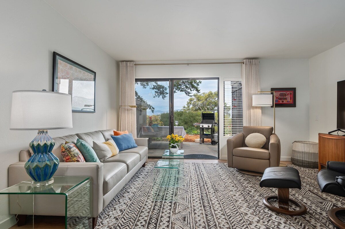 This condo was completely remodeled in 2018 and has all new appliances. In 2021, the owners redecorated the unit with modern Scandinavian furniture and artwork that complements the Santa Barbara setting. The comfortable living room looks out to the garden and patio which is excellent for entertainment with wonderful views. The patio has a dining table and new Weber grill.