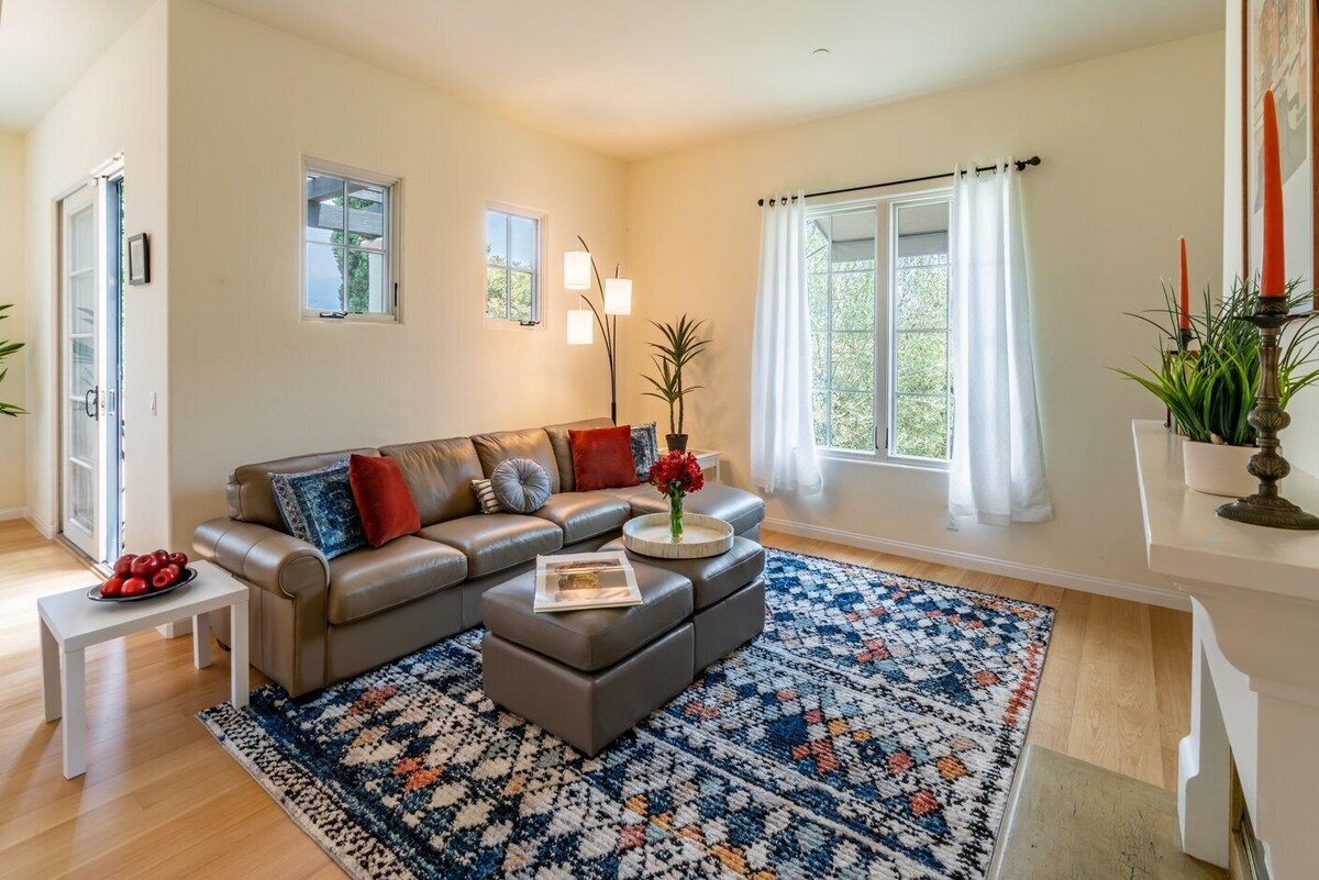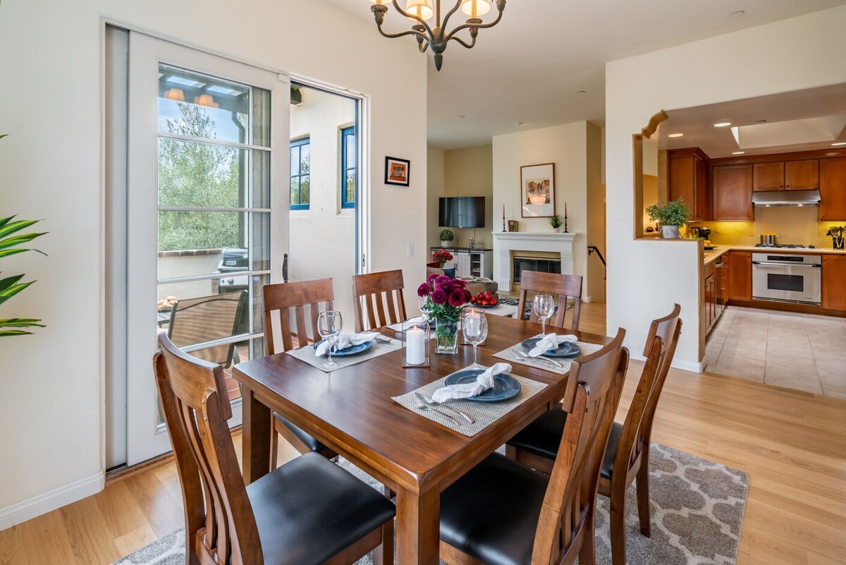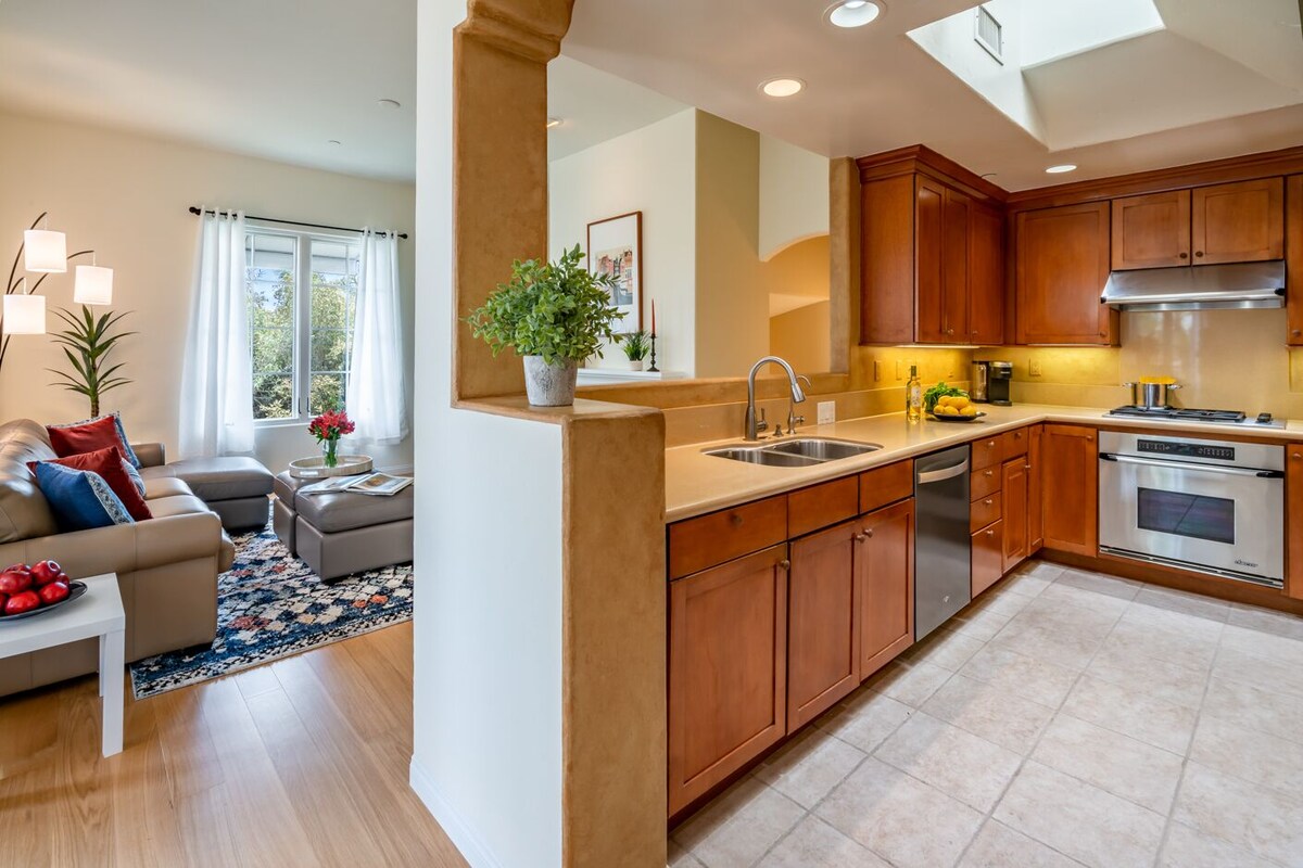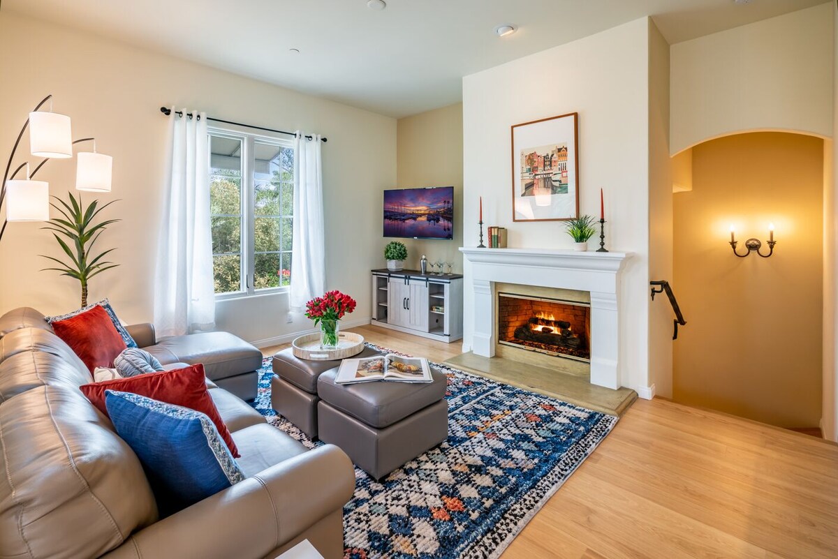 This two-bedroom, two-bathroom condominium offers an ideal location in the midst of one of Santa Barbara's now-famous urban neighborhoods. The home proudly occupies a front-row seat to all this area has to offer. Enter the house at street level from the attached garage, a rare commodity in this part of the city. Then, ascend the stairs to the main salon with vaulted ceilings, television, a supple grey leather sectional/sofa sleeper, and a fireplace that adds an element of warmth and coziness to the home. After preparing a delicious feast in the kitchen, the dining room or the covered terrace with barbecue and a table for four offer the perfect landing for any meal. With a pretty \ balcony overlooking the colorful, bougainvillea-studded Spanish-style complex, the home's primary suite has a king-size bed, and an attached bathroom with a luxurious oval soaking tub, a spacious shower, and a walk-in closet. The second bedroom features two twin beds. The laundry room and a hall bathroom with a shower complete the conveniences offered, but this is only the beginning to a memorable stay. As is typical with many Santa Barbara homes, this property does not have AC. Open windows and the use of fans allow ocean breezes in to keep the house cool during hot summer months. When it comes time to explore, it is simply a matter of walking out the front door on foot! Purveyors of eclectic art, style, wine, recreation, craft ale, and more set the stage for sheer enjoyment with something for everyone. The Funk Zone spans a several-block radius on the south side of Highway 101 and caters to Santa Barbara's energetic, culturally curious, contemporary side. MOXI, the Wolf Museaum of Exploration will cater to the kids curiosity too and is just a couple blocks away. The complex is also next to Santa Barbara's busiest European-style deli, Metropolis. Order up a sandwich on freshly-baked artisan bread, indulge in hand-made baklava, or browse the shelves for gourmet grocery items not found anywhere else in town and fill your pantry to overflow. The area attracts locals and world travelers alike, offering an endless array of opportunities to mix and mingle, sip and socialize, taste and treasure hunt, or just sit on the second-story balcony above it all and watch the day unfold. And remember, this area borders Cabrillo Boulevard, where the enticing blue coastal waters and miles of wide sandy beaches and the boardwalk await. Within minutes of Funk Zone Haven, there is a year-round open invitation to take advantage of all forms of recreation. Sail, paddle board, kayak, play volleyball all day long, or simply languish in the sun and surf. The new walking promenade Downtown, nearby Stearn's Wharf, and The Harbor have more great places to dine and devour local fare and are the final punctuation to a perfect Santa Barbara vacation here. So, to sum things up, well, need we say more? Our prices include all fees. No hidden fees.