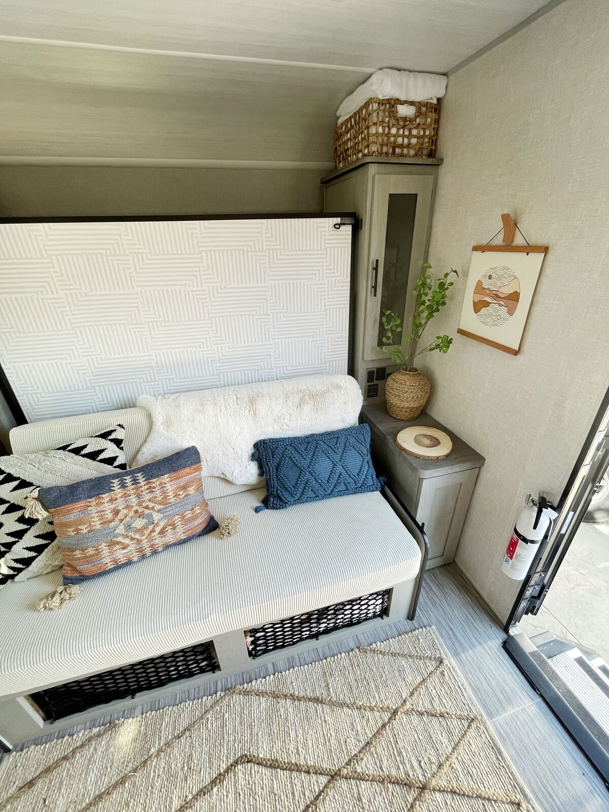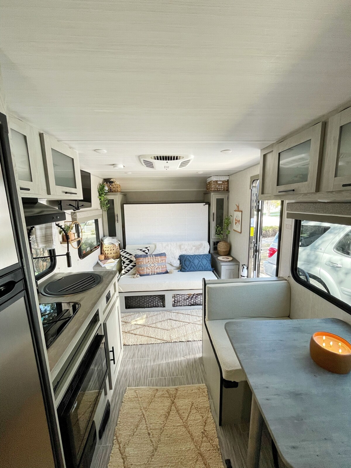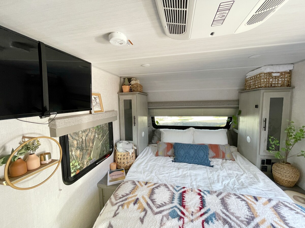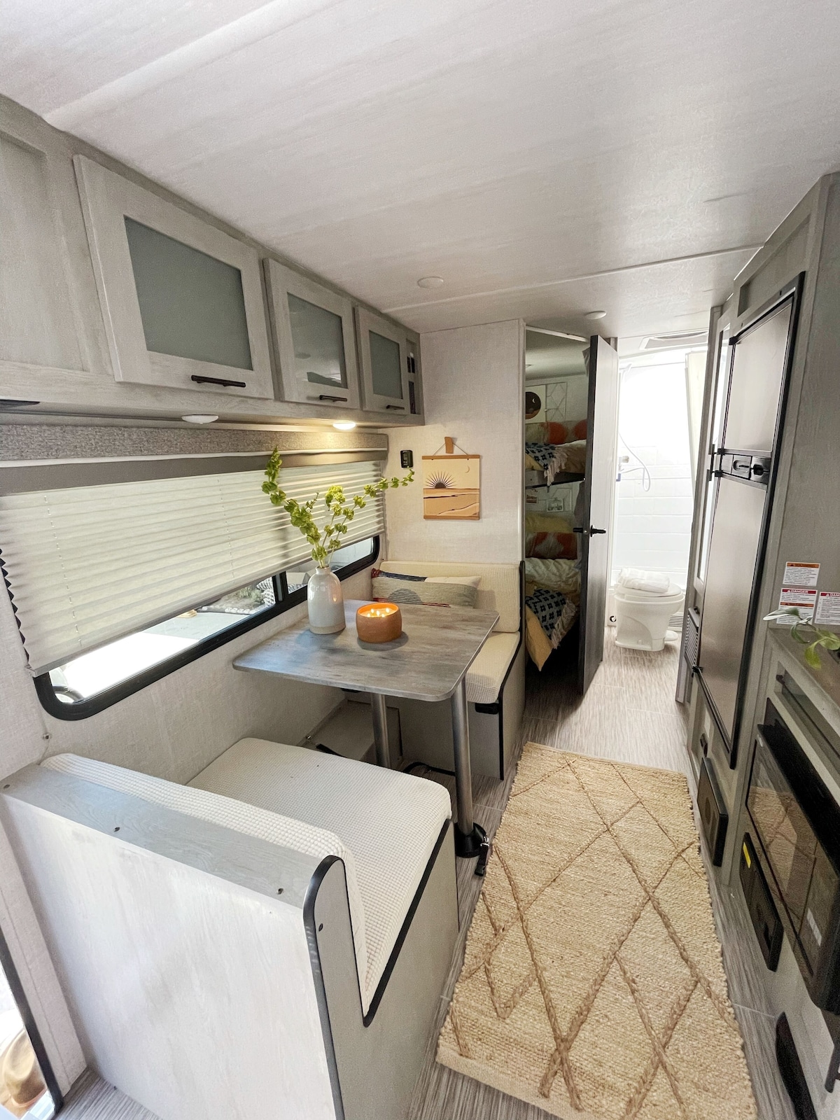 *Ideal for SB locals who are remodeling or hosting extended family stays* ATTN: This camper does NOT come with a location. It is perfect for parking in your driveway or a long term camping spot. This boho chic 2022 camper is comfy and cozy with high-end linens and brand new appliances. It is short enough to fit in your drive way (19 ft), while having an open and spacious feel inside. It comes with full/double mattress bunk beds with curtains for privacy, a queen sized Murphy bed (that folds up for more space during the day) and a dinette that folds into another twin. The shower, fridge, and freezer are all good-sized and everything is brand new. Comes fully stocked with everything you need to make it your temporary home. Extras include: -Built in central vac -Flatscreen TV -Outdoor kitchen -Solar panels -Convection oven We are a family that loves campers. We've spent time both living and traveling in them with our four kids and we love the simplicity and usability. With Santa Barbara's housing shortage we know many are in need of extra space. This house comes to you and fits in a parking spot. Our prices include all fees. No hidden fees.