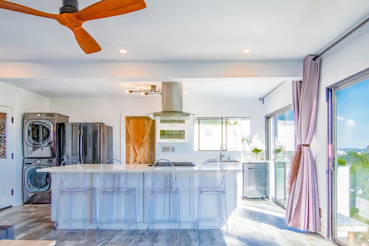 Upon arrival, enjoy floor-to-ceiling city-scape views just steps from your covered carport. The home features an updated kitchen perfect for preparing meals or enjoying takeout from nearby hotspots. Our design leans into an eclectic style — with a mix of new and vintage pieces that give the home charm and warmth, while still feeling clean, comfortable, and uncluttered.