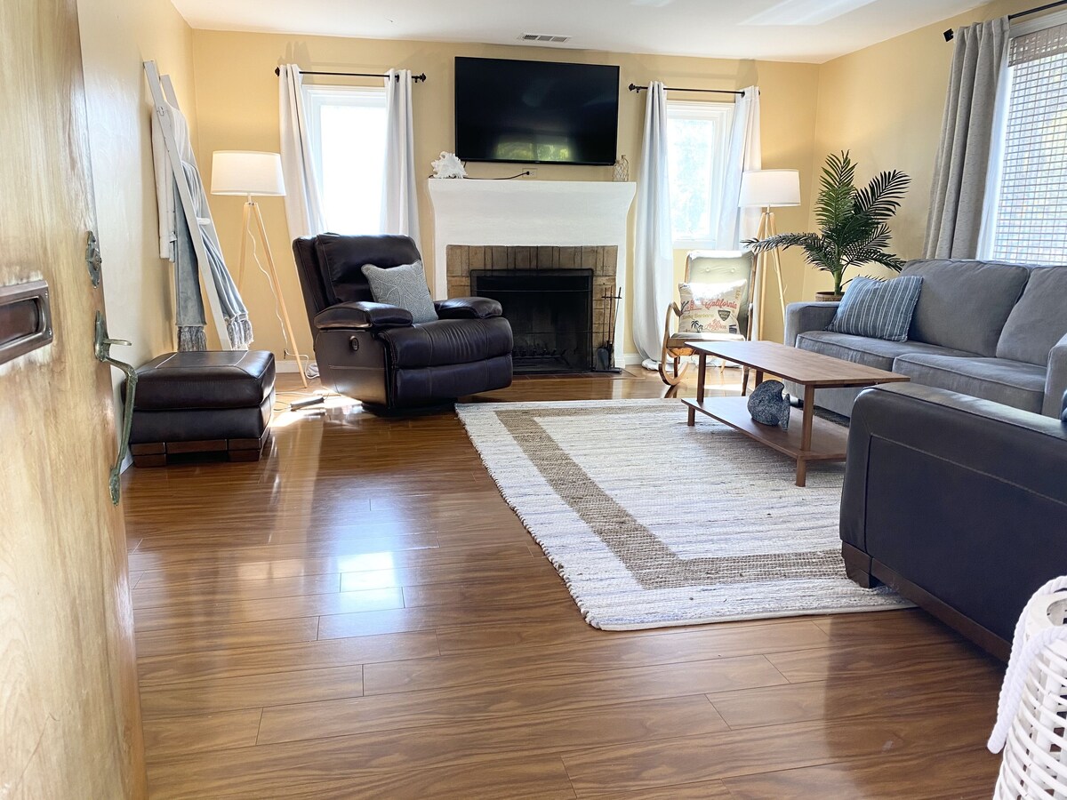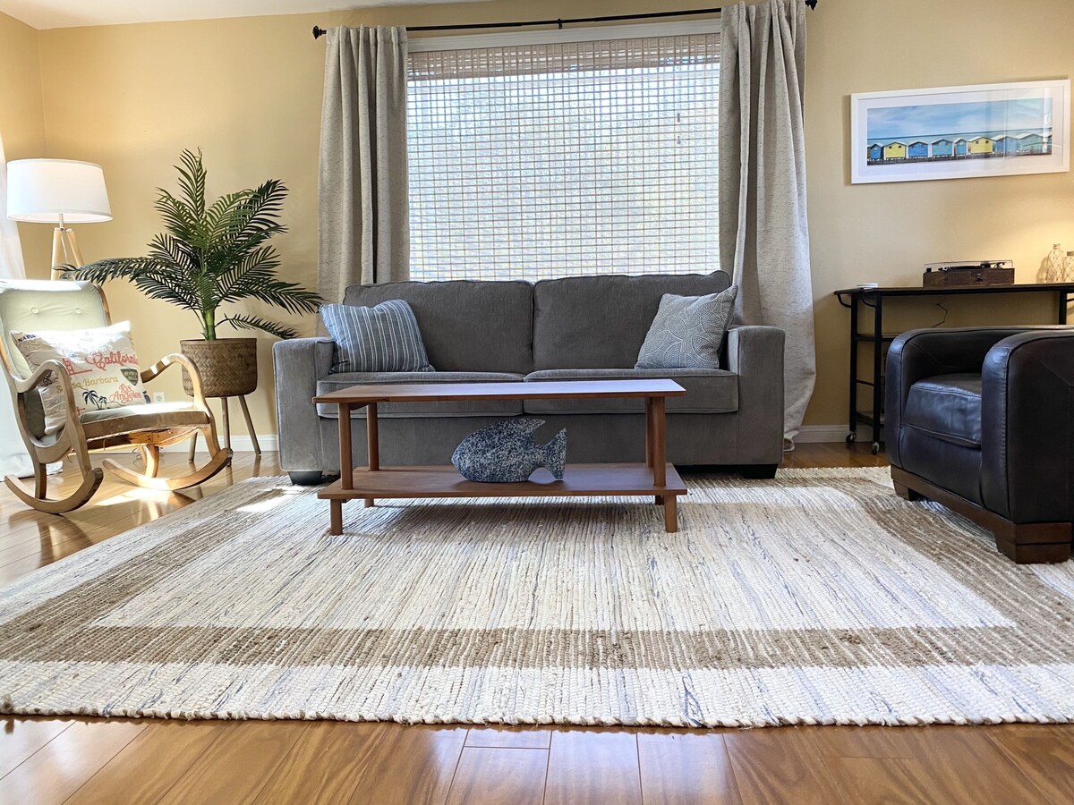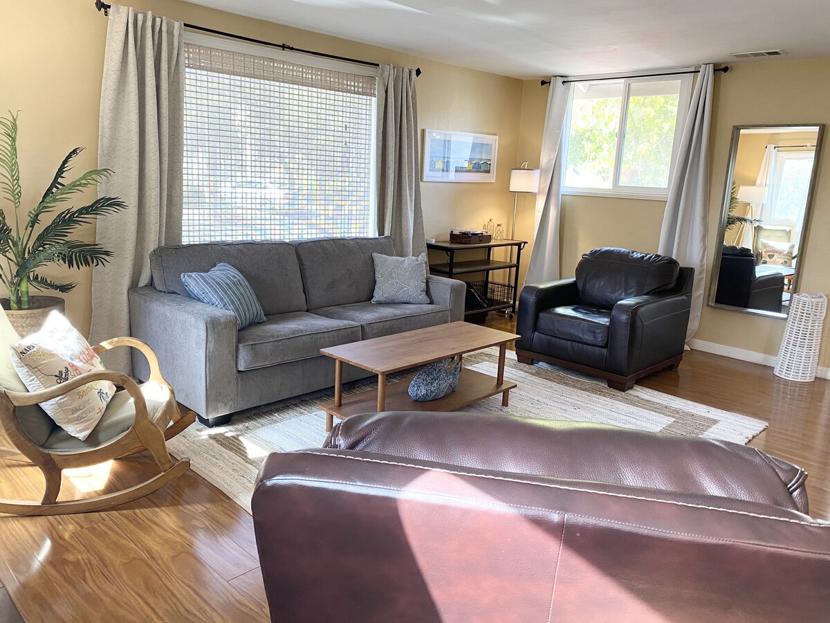 This is not your typical downtown Santa Barbara house. With over 1500 square feet inside and sitting on a 6000+ square foot lot, you will feel like you are in your own slice of paradise. Morning sun hits the back patio perfectly to enjoy a cup of coffee or an evening glass of wine. This is a house you can really sprawl out in with a large open living room and a picture window looking out onto the tree lined street. Seating for the whole family as well as a sleeper sofa for guests. Since this house was built in 1942, we thought it would be fun to have a record player in the living room as a vintage throw back. We love to meander through the various antique shops just blocks away and pick up old records to play back at the house. The largest bedroom offers a comfy king bed, large sofa for reading or relaxing and and an office just off the bedroom for those of you working from home. There is a also a full bathroom just off the office with a walk in shower. We have two bedrooms just down the hallway, one with a queen bed and one with a bunk bed. The bunk offers a twin on top and a futon on bottom that can be used as a full size bed. Both bedroom are rather large for the age of the home. The second bathroom is located just across the hall from these bedrooms and has a soaking tub as well as a walk in shower. The galley kitchen has been updated with granite counter tops, ample cabinets that go all the way to the ceiling and a beautiful gas oven with center griddle for making meals for the family. While the dining room is on the smaller side, we have outfitted the room with a dining table that can be extended to seat 6. This home is a perfect vacation spot due to the walkable location to so many amazing restaurants, shops and outdoor gems that Santa Barbara has to offer. We do have a 30 day minimum at this home and would be happy to host you! Inquire about longer stays as well if one month is just not enough. Our prices include all fees. No hidden fees.