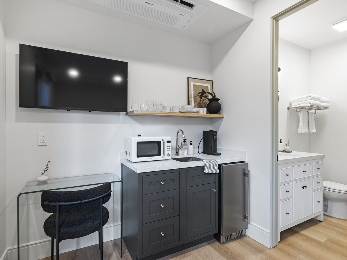 ## Space Immaculately renovated downstairs micro-studio in a multi-unit building only two blocks from Downtown Santa Barbara & State Street. The original Spanish architecture has been preserved while offering modern upgrades & conveniences. This 209 sqft queen-bed unit has a flat-screen smart TV with streaming, casting, or Airplay features and a Samsung split heating/AC system for ultimate comfort. A private en-suite bath with a rain shower and a kitchenette with Nespresso, microwave & mini fridge complete this stay in Santa Barbara. NOISE DISCLAIMER: This unit is below the upper units. It is possible to hear noises coming from above you. We notify the upstairs guests of this and ask them always to respect their noise level to avoid disturbing downstairs guests. Should you have any issues with this, please call us on our dedicated hospitality line, and we will contact the guests above to remedy the situation immediately. *NO PARTIES: We have a strict 'No Party' policy-parties or events are not allowed. Quiet hours are enforced from 10 pm-8 am.* *PETS: ONLY 1 PET ALLOWED (N/A to service animals, applicable to ESA's). A pet fee will apply; pets can not be left unattended in your room. Please add your pet to the reservation, or disclose your pet to our hospitality team after booking. *Our cleaning fee includes professional cleaning of the unit and outdoor space. As part of The Living Wage Pledge, we are committed to paying our cleaners fairly. A living wage is a minimum income necessary for someone to meet their basic needs and participate in their community.* *To support sustainable tourism and reduce our carbon footprint, we provide Public Goods toiletries, compostable sponges, trash bags, and green cleaning products.* ## Access This is a self-serve stay. We provide contactless self-check-in. The doors are all equipped with smart locks, and a unique code will be generated and sent to you on check-in day. Parking and EV charging (shared amenity): Casa Jardin offers free guest parking in its private parking lot at the back of the property. Please use free street parking if the lot is full. One parking spot per unit on a first-come, first-serve basis. EV chargers are available for guests to use during their stay. Two shared J1772 chargers are mounted on the left side of the parking lot. Two shared Tesla chargers are located on the right side of the parking area. Please bring your own adaptor if needed, and please disconnect when not charging to allow other guests access to the chargers. Casa Jardin does not monitor parking spot use and we are unable to request guests to move their vehicles. ## Tech This complex does not have live TV service. All TVs have apps (Netflix, Hulu, YouTube TV, and Amazon Video) for your streaming pleasure. The property has gigabit wifi, and the unit has a private network for guests to cast directly onto the TV. ## Interaction This is a self-serve stay. We are off-site hosts; there is no front desk or office, and we provide contactless self-check-in. We have a dedicated hospitality phone line in case of emergencies (24/7) and our team is available on call, text, or chat during 5 am - 1 am to help assist you during your stay! ## Neighborhood Located within walking distance to nearly all restaurants and retail stores on the State Street corridor, 20+ tasting rooms, 10+ breweries, and countless choices for eating or drinking make this an ideal location for anything that may bring you to the world-renowned Santa Barbara Coast. Please note that there is an active construction site across the street, led by the City of Santa Barbara. Per the city's noise ordinance, construction work is allowed during 7:00 a.m. – 5:00 p.m. (weekdays) and 9:00 a.m. – 4:00 p.m. (Saturdays). Work is prohibited on Sundays and legal holidays. We apologize if you experience any disturbance due to this work - it is beyond our control :( ## Transit Santa Barbara Transit Center is five blocks away. ## Notes For security, there are cameras on the exterior of the building. Full refund if canceled 24 hours in advance, minus 4% credit card transaction fee on VRBO and direct sites. Our prices include all fees. No hidden fees.