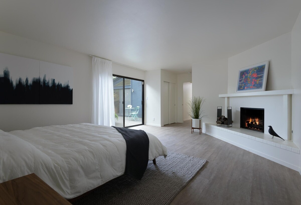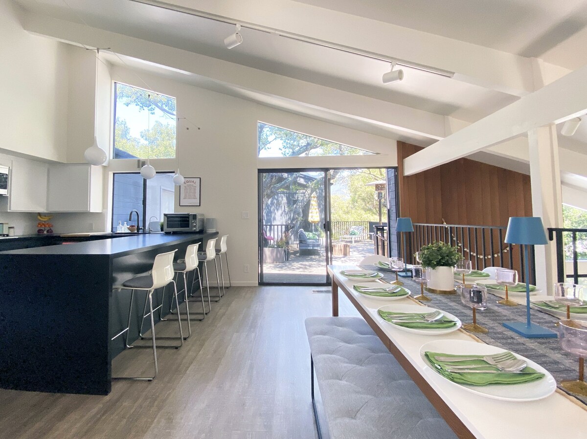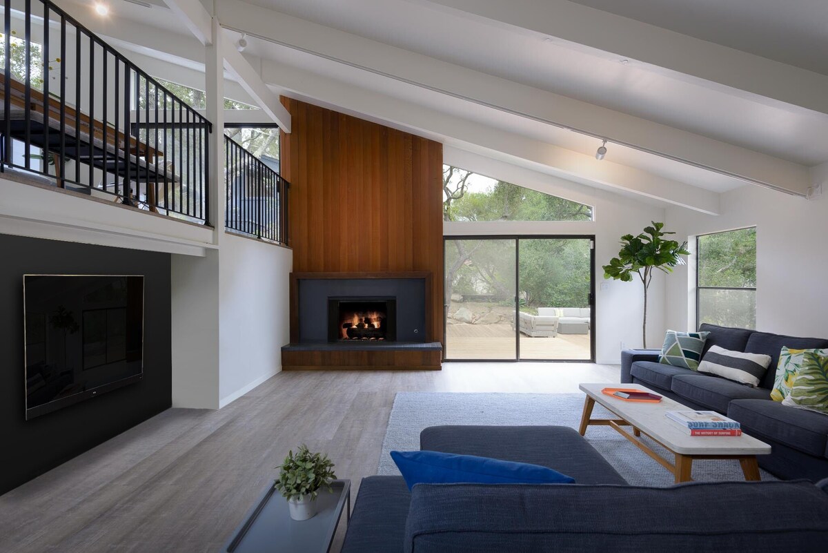 Large 70's modern Santa Barbara home situated on a peaceful acre of land surrounded by majestic oaks, mountain views and the perfect blend of modern indoor/outdoor living in nature. Located in a quiet, residential neighborhood that feels like you're miles away from it all, but downtown Santa Barbara with its restaurants & shops, as well as beaches, great hikes and bike trails are only a few minutes drive away. The space Soaring ceilings and a spacious layout make this over 3000 square foot home the perfect setting for a true getaway. The main house has 3 bedrooms, and the upper deck leads to a separate guest suite / 4th bedroom. Main Level: Fully equipped open kitchen and dining area opens to an upper deck. 3 bedrooms (one King, one Queen and one full sofa bed, 2 bathrooms (one ensuite), laundry. All bathrooms have a shower and primary ensuite bathroom also has a tub. Lower Level: Large living room with ample seating for 8+ with sliders to the lower deck and garden. Guest Suite: Separate entrance across upper deck. One king sized bed plus ensuite bathroom. Lower Level 2: Accessible via spiral staircase from Primary Bedroom only - Gym area with free weights, flatscreen to attach iPhone, yoga blocks, medicine ball and more. There are fireplaces in both the living room and the master bedroom, flat screen TVs in both the Living Rooom and the media room / 3rd bedroom with Netflix, Amazon, Hulu & Disney+ access. High speed internet throughout the house as well as Sonos speakers throughout the house. This private home offers immense flexibility and an easy cool vibe for getting your relaxation on as soon as you arrive. We want you to enjoy your stay in Santa Barbara to the fullest, so let us know how we can help. Need baby furniture, babysitters or doggy daycare? Just ask, we've used it all and know the best places in town!! Guest access Guests will have access to the entire house besides locked rooms. The garage will be accessible for laundry but not parking cars. There is space for 4+ cars on the property (2-4 in driveway and 2-4 on street) Other things to note: Despite its proximity to downtown, this home is in nature, and we often have visits from the local deer as well as the occasional coyotes. Well behaved dogs are welcome with open arms and the back half of the property is fenced in for supervised roaming and play. There are ample walking/hiking opportunities right out the door as well as many favorite bike routes. Easy access to Santa Barbara, Goleta & Montecito via main roads and back roads. Within 5 minutes, you can be on the beach, in the mountains or downtown! Our prices include all fees. No hidden fees.