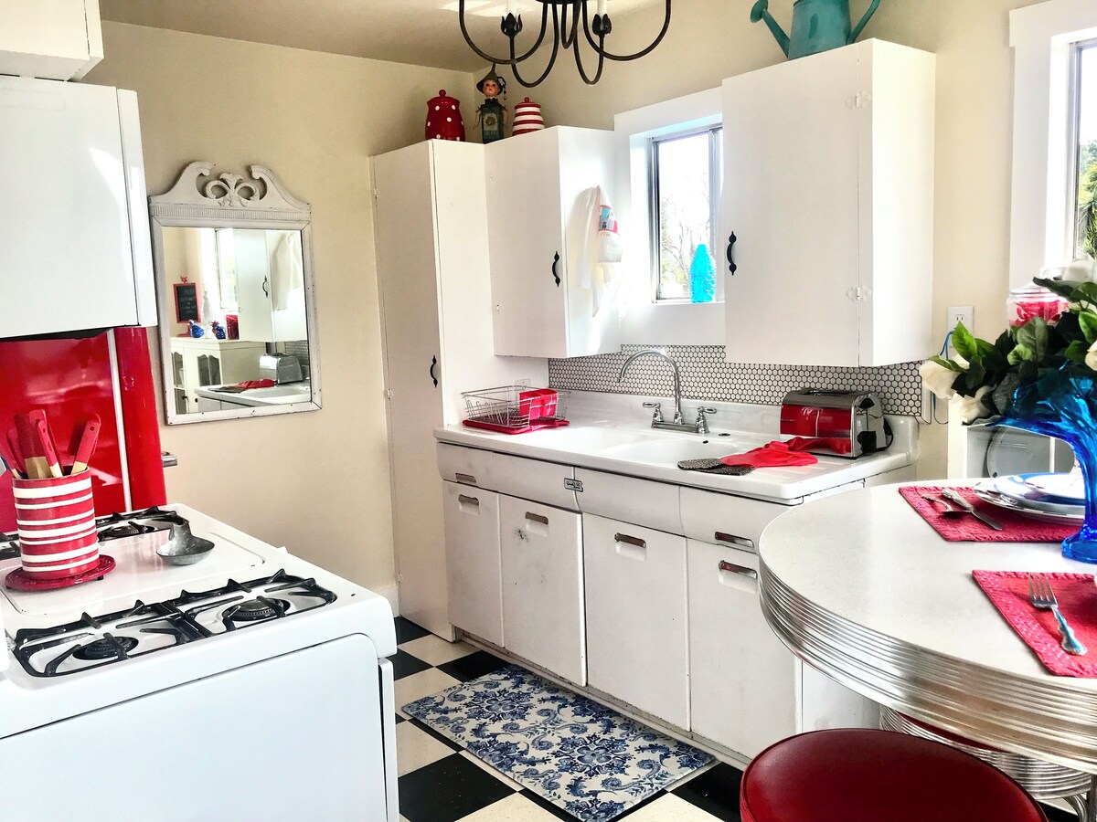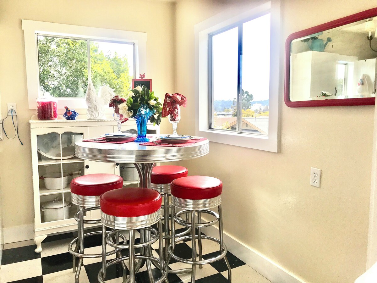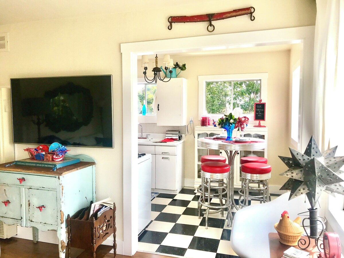 Blue Bungalue, sometimes called the Funky Penthouse, resides at the very top of its very own staircase. He shares NO walls and enjoys sunshine views from all four corners of the earth. Recently refurbished, this 1950s apartment is NOW the CAT'S MEOW. Decorated with an eclectic sense of style and comfort, this abode bodes very well for those that seek something \