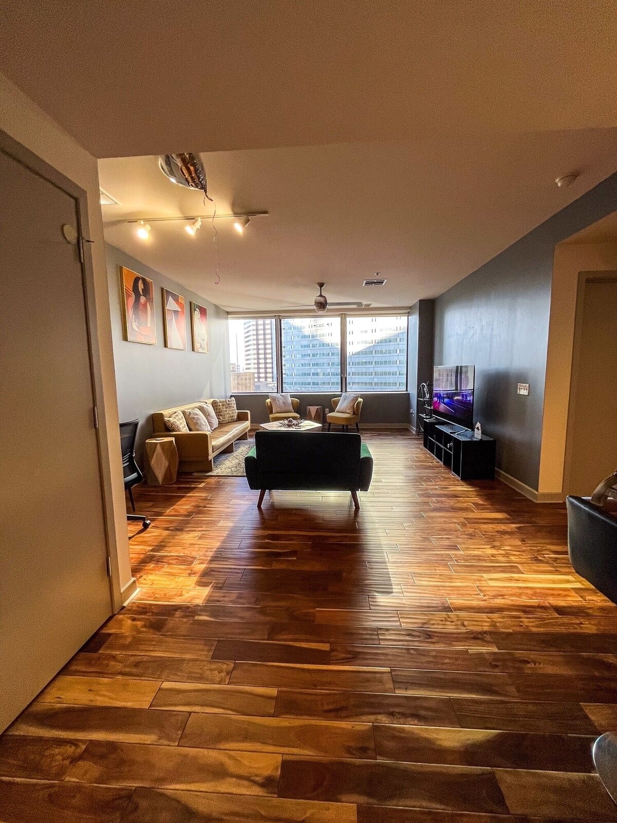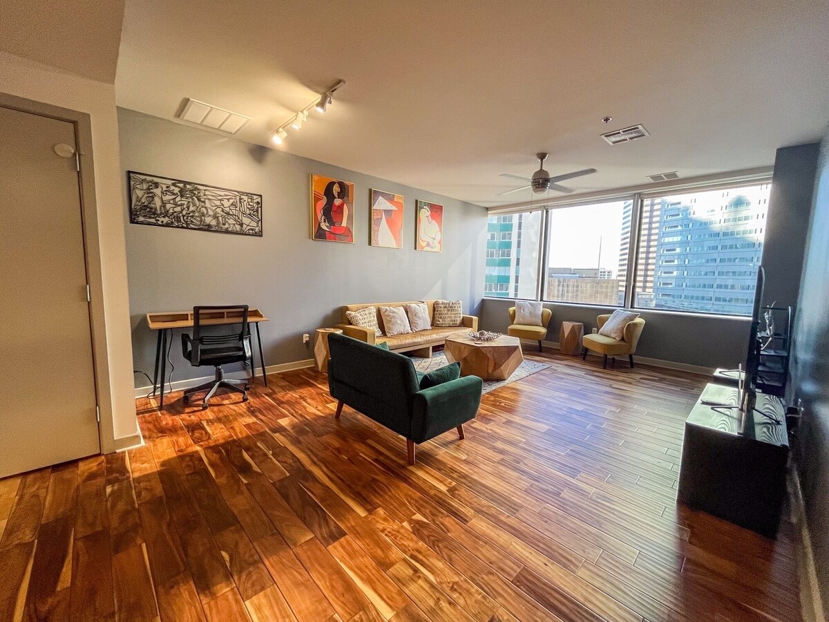 Welcome to your cozy home away from home in downtown Dallas! This stylish 1-bedroom, 1-bath apartment features a king-size bed, a sofa bed, large city-view windows, a fully equipped kitchen, and a comfortable living space with a flat-screen TV. Enjoy access to a rooftop pool, a gym, and a designated parking space in the building’s garage. Perfect for up to 4 guests, this family-friendly retreat is just steps from top attractions, restaurants, and entertainment, offering the best of Dallas right at your doorstep. Our prices include all fees. No hidden fees.