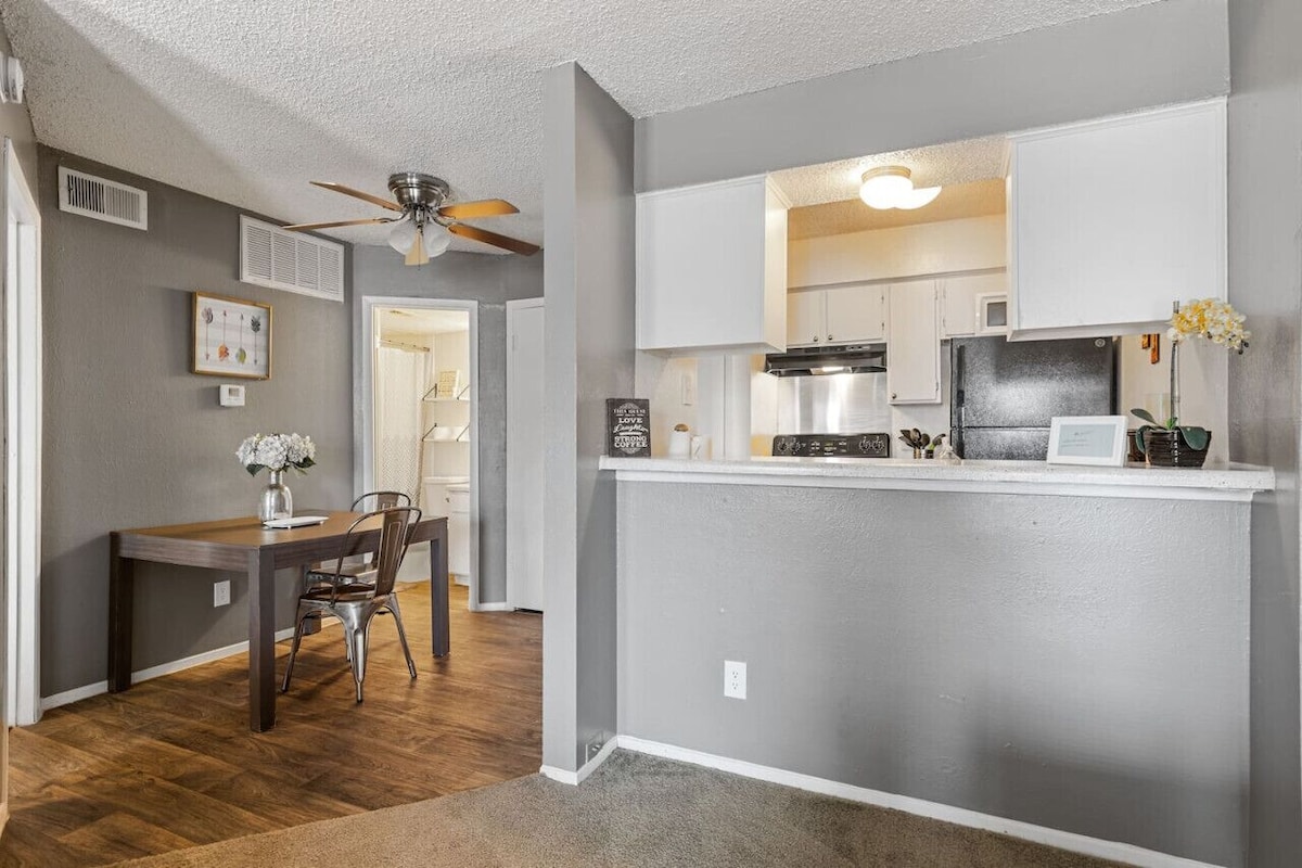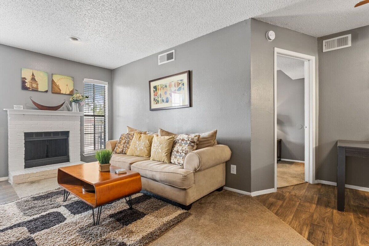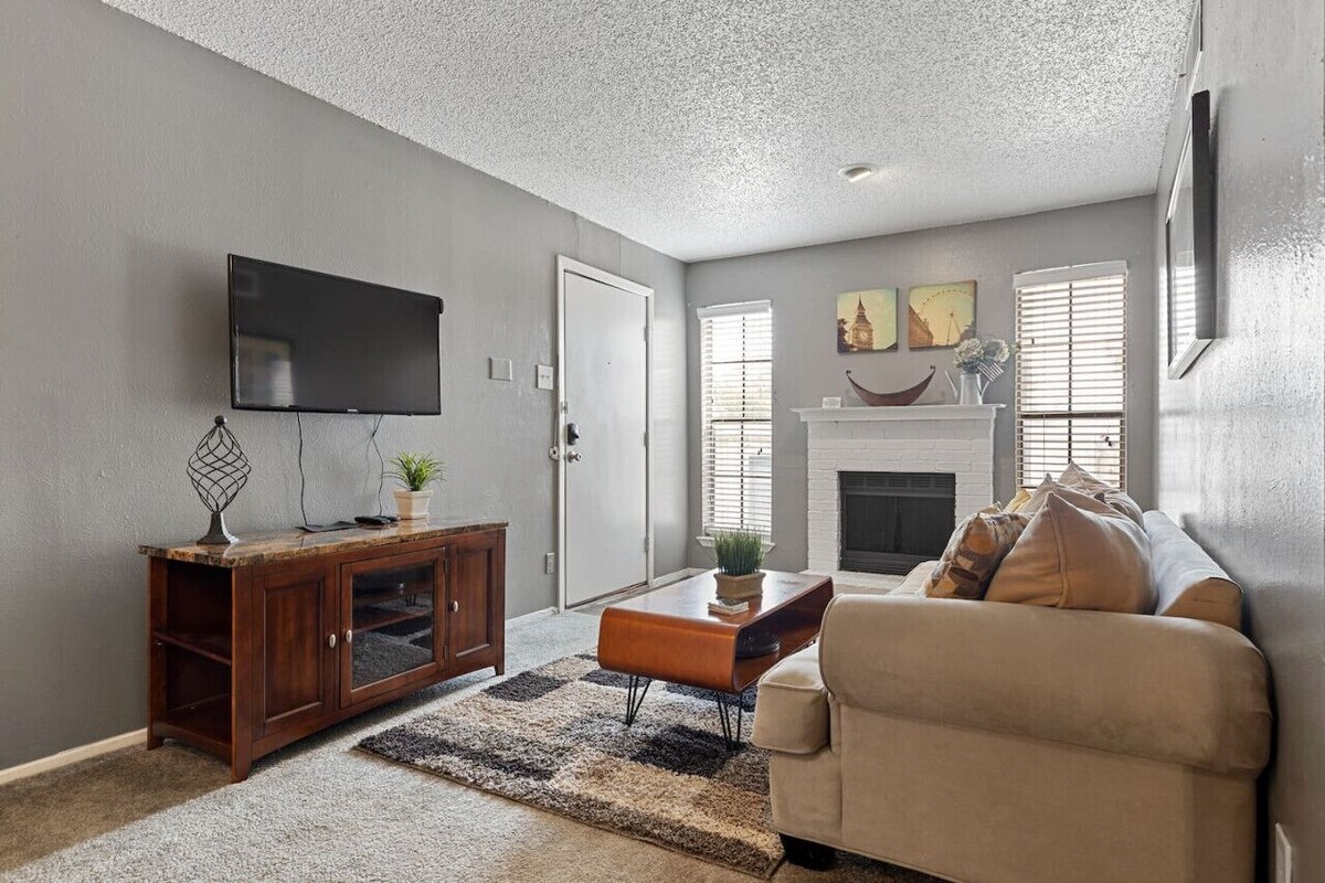 ~PERFECT FOR LONG TERM STAYS~ Cozy 1 bedroom apartment with balcony! Fully equipped and self contained. Washer & dryer in the unit. 55” smart TV w/ Cable! Free WIFI. Seasonal use of pool! Close access to the fwy! $65 Pet Fee per pet! Parking is first come first serve. A parking pass is provided. We offer 10 - 25% discount on long term stays. We often house professionals traveling for business. A home away from home! An easy 15 min. drive to uptown Dallas or Plano. 10 min. to Richardson. Welcome! Guests will have private access to the entire apartment. The apartment features; new appliances, new flooring, living room fireplace, textured ceilings, patio etc. The apartment boasts a mix of old with the new! Updates have been made, but the entirety of the apartment has not been completely stripped. Guests should not expect a newly constructed modern unit. This 575 sqft unit is on the second floor of a Garden Style apartment complex. The apartment is in a convenient North Dallas location with quick freeway access. Shopping awaits you at Valley View, Park Lane, Richardson Square and Galleria Malls. Restaurants, night spots, and casual eateries abound all around in Dallas. Look more in our local guide book for all of our recommendations. Along with private access to the entire apartment, guests can also use these communal spaces: -Pool We are available for any questions you may have! RICHARDSON / NORTH DALLAS AREA - GREAT ACCESS TO FWY 75 & 635! CAN GET TO ALL PARTS OF DALLAS EASILY! DOWNTOWN OR PLANO WITHIN 15 MINUTES! RICHARDSON OR MEDICAL CITY DALLAS IS 10 MINUTES. The property is a small apartment complex consisting of 36 apartment homes. There are a few Airbnb units in this complex. All units has the same floor plan and size. If we are fully occupied on the unit you want please ask about our other units.. The neighborhood is in north Dallas. Great for an easy and short commute to places of work, major medical centers, SMU university, entertainment and event venues. You may hear traffic noise from the property as we are convenient access to major roads. We offer a nicely appointed & affordable stay in Dallas. We look forward to hosting you. We, as hosts, strive to maintain a welcoming and inclusive environment at our rental properties and do not discriminate based on race, religion, sexuality, or gender identity. We kindly ask that if you book with us, you help us uphold these values and act with respect and kindness during your stay. Car is preferred. Uber ride service Lyft ride service Train Station: A few minuters drive to DART Train station. Bus: There are bus stops in the area. Walk: Walk to Walmart, CHASE Bank, Whataburger and other fast food restaurants. Seven Eleven with a gas station close by. PLEASE NOTE: This apartment is located inside a gated/fenced 30+ unit building. The complex was built in the 1990s and occasional noises from neighboring apartments may apply. Located off a side road to the freeway. Urban noises are to be expected during business hours and occasionally on non business hours. Guests should expect medium- high noise levels. LATE FEE: Check our time is strictly at 11am. We do not offer late check outs. Our late fee is $100. We pay our professional cleaning service for each hour of time spent at the unit. We also often have an incoming guest the same day. We need the time to get the unit ready. Thank you for understanding that that the check out is firm by 11am. SMOKING: PROHIBITED. If any trace of smoke/smoking will result in a $500 fine We are very strict on this house rule. Please respect the house rules. Thank you. PARTIES: No other guests than registered guests allowed. No Parties. Failure to do so will result in an automatic cancellation, no refund, and $2000 security deposit. Quiet hours after 10pm. PARKING: We offer one parking spot. Parking is first come first serve. Must use a parking permit pass. Provided. Free public parking on the street as well. SELF CHECK IN: Check in with the provided door code. Smart digital lock. Your door code will be given to you prior to check in. Instructions: Please dial the door code. Then turn the lock to open. Same instructions for when you leave the apartment. PET POLICY: $65 pet fee per dog. $150 for long term stays. Well behaved cats allowed. No pets without prior arrangement. $300 fine. PET RULES: Dogs are not allowed to lay on couches, beds, or furniture. Please do not leave your pet inside the unit unsupervised for longer than 4 hours. ALL DOGS must be up to date on pest control and their vaccines. *No pets without prior arrangement. $300 fine. PLEASE NOTE: Any damages caused by pets; going to bathroom on furniture, wear and tear of flooring, breaking items, etc. Will result in paying from the security deposit. MAIL & PACKAGES: We do not lend mailbox keys nor offer a mail delivery service. If you would like to receive packages during your stay, you may have packages delivered to the apartment doorstep. Disclaimer: We as hosts, are not liable for any misplaced or stolen packages. We ask that if you must receive packages, please be vigilant about tracking your packages. For mail and letters, we recommend sourcing them to a local USPS, FED EX, or post office. CHECKING IN OUTSIDE OF CHECK IN TIME FRAME: IF CHECKING IN BETWEEN 10PM-7 AM AFTER 4 PM CHECKING TIME, PLEASE CAREFULLY FOLLOW THE CHECK IN INSTRUCTIONS. DIRECTIONS TO ACCESS THE UNIT ARE PROVIDED. WE DOUBLE CHECK OUR CHECK IN CODES PROVIDED. IF YOU ARE UNABLE TO REACH US BETWEEN THESE HOURS, WE ARE NOT LIABLE TO ASSIST YOU WITH YOUR CHECK IN. WE DO NOT OFFER REFUNDS IF YOU ARE UNABLE TO ACCESS THE AIRBNB. Quiet hours after 10 PM No unregistered guests No unregistered pets No smoking or vaping or any kind Must be respectful to hosts ALLERGIES: Due to the fact that this apartment is pet friendly and in an apartment building with shared vents, the apartment is not allergy sensitive friendly. The Airbnb is professionally cleaned between stays. However we cannot gua